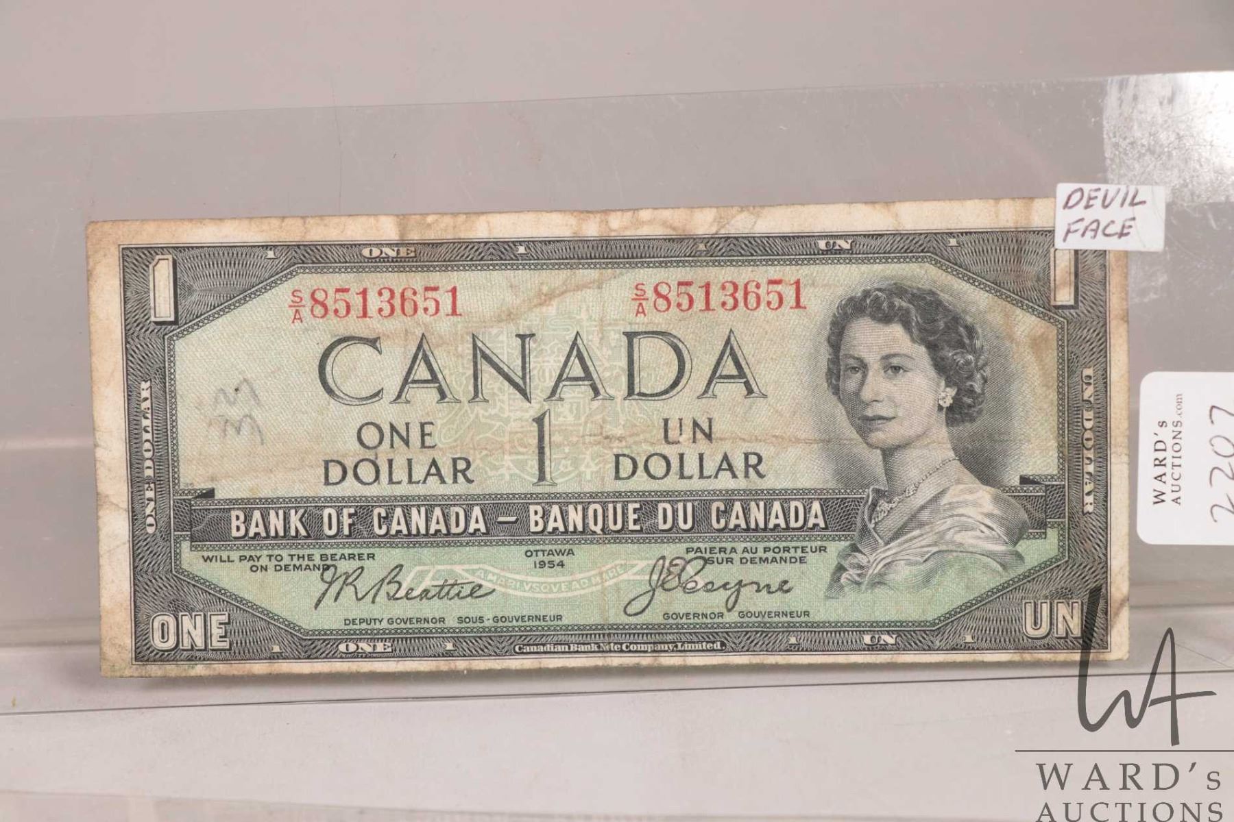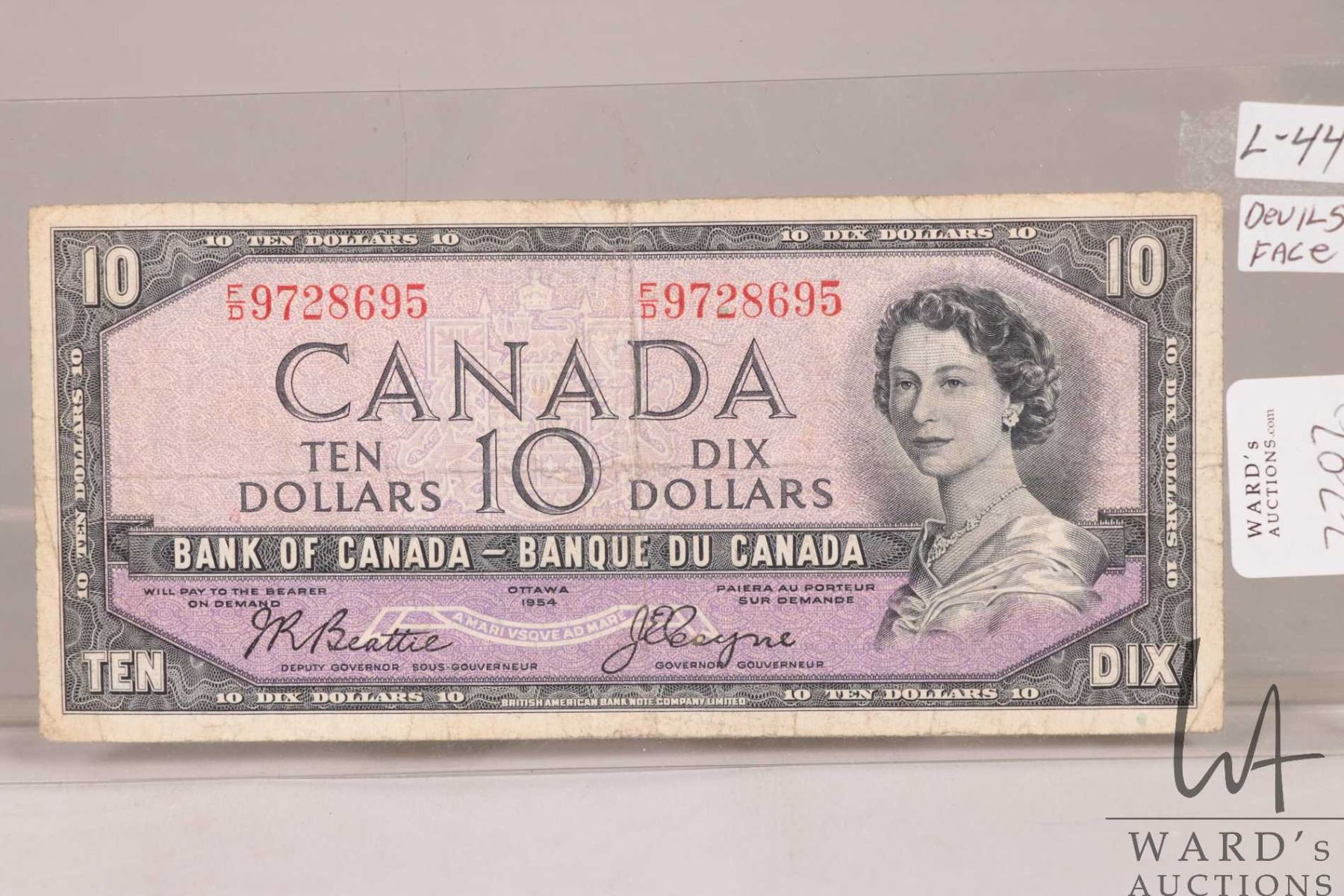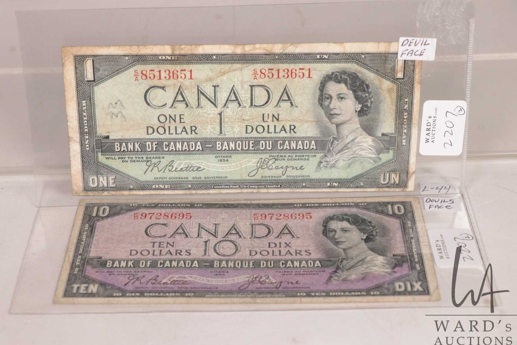 Two Canadian 1954 devils' face bank notes including one dollar and ten dollar
