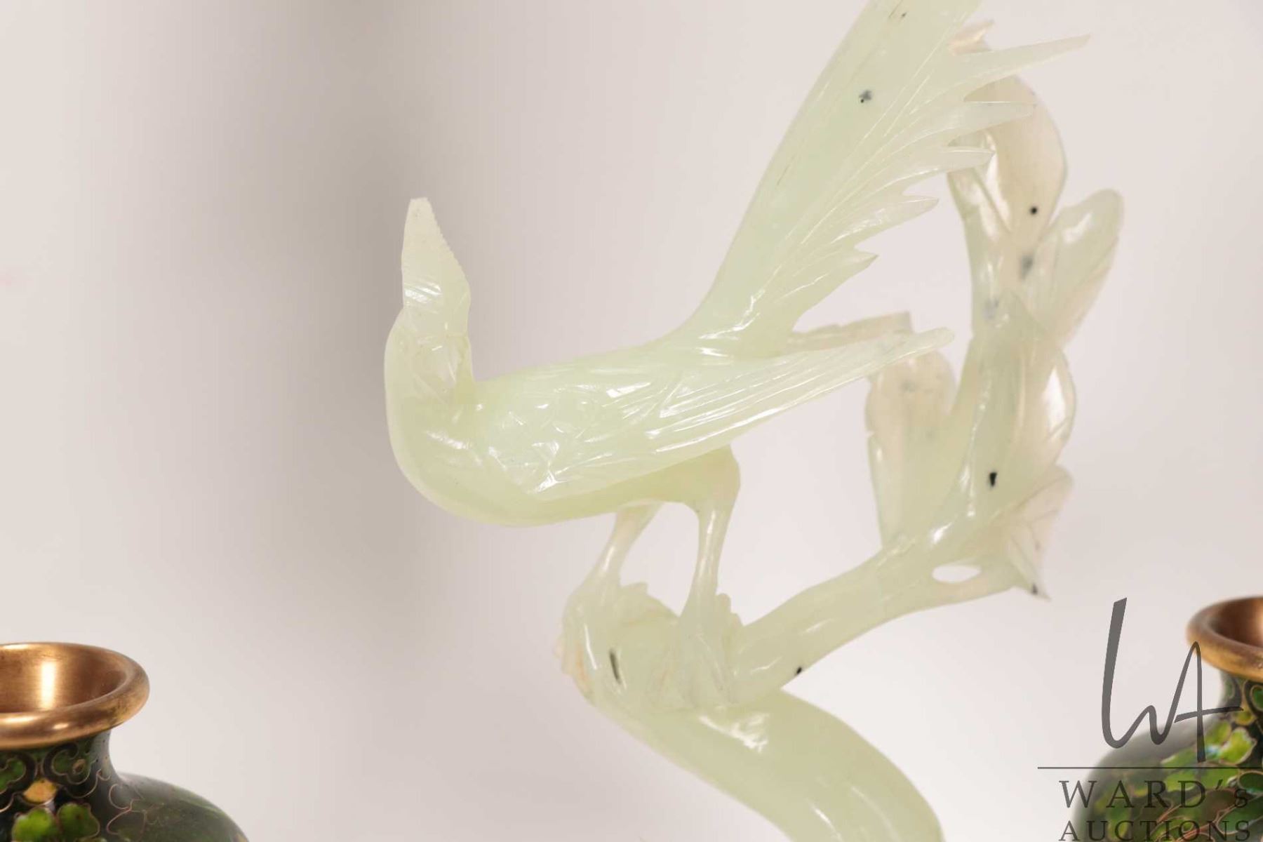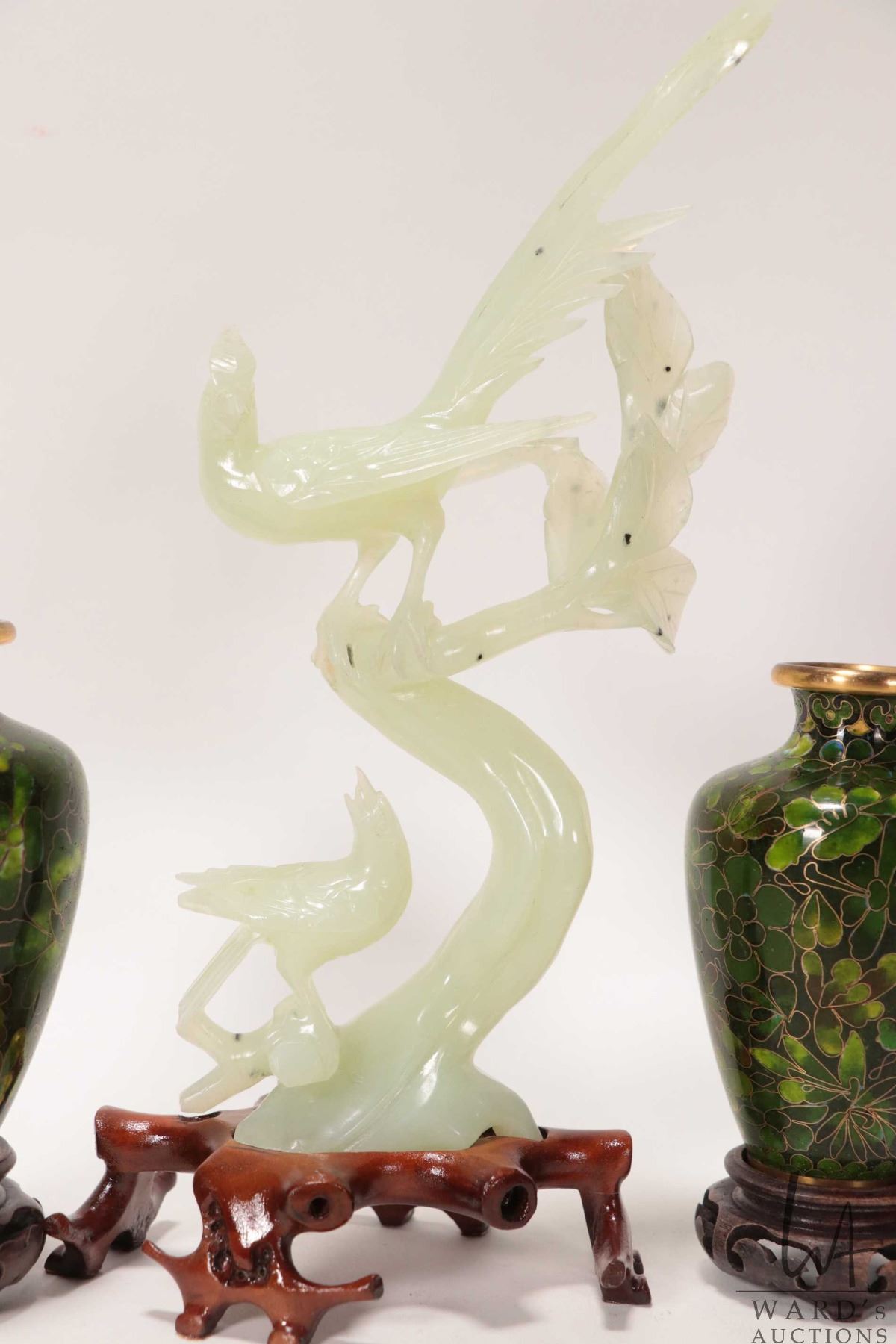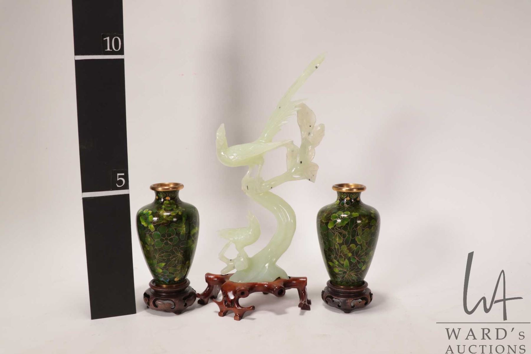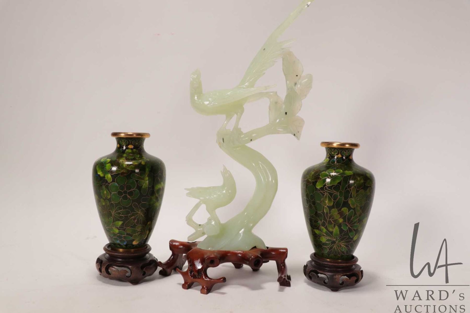 Two Cloissone vases with wooden plinths 5" in height and a carved jadeite pea fowl and tree, 10" in