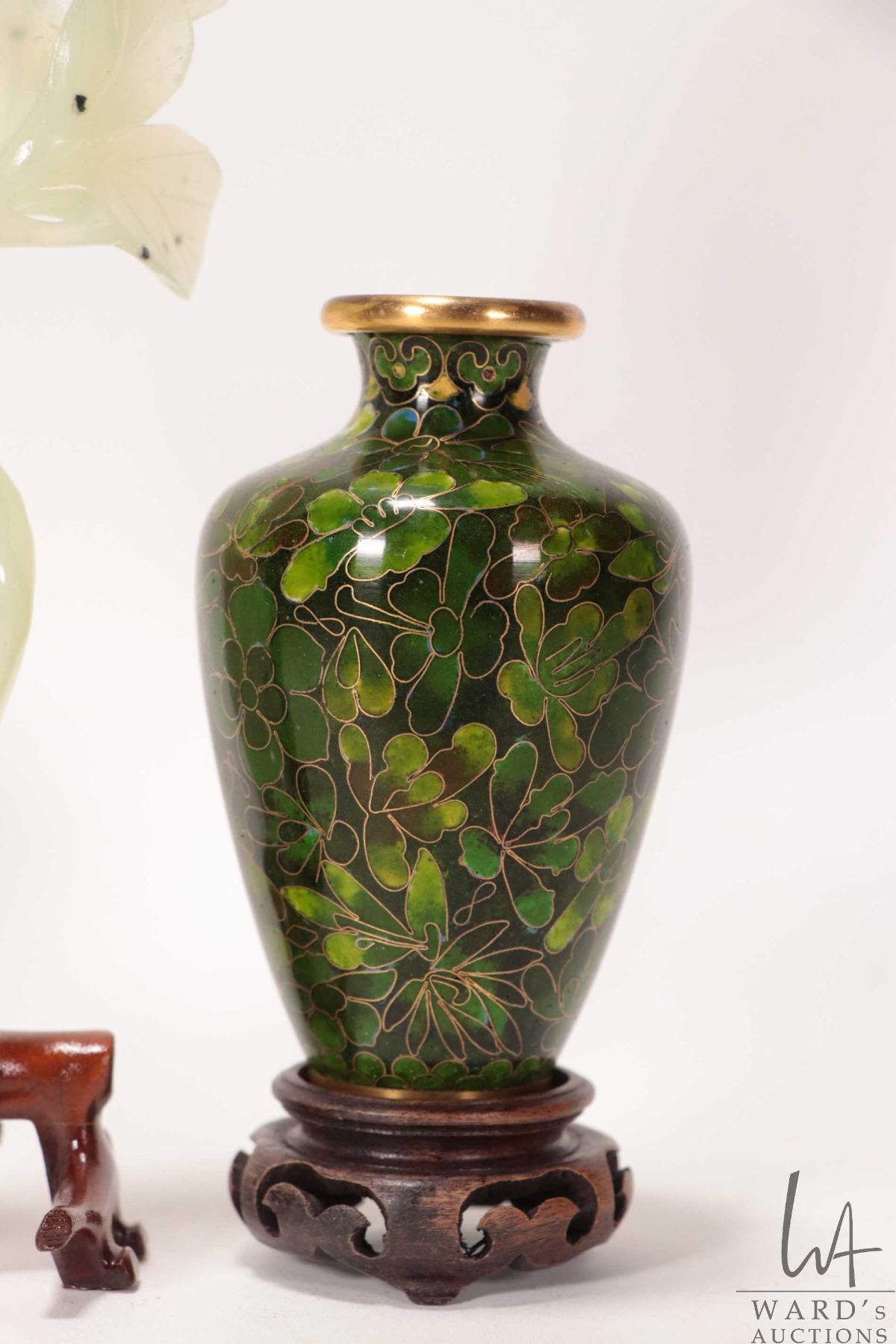 Two Cloissone vases with wooden plinths 5" in height and a carved jadeite pea fowl and tree, 10" in height including plinth
