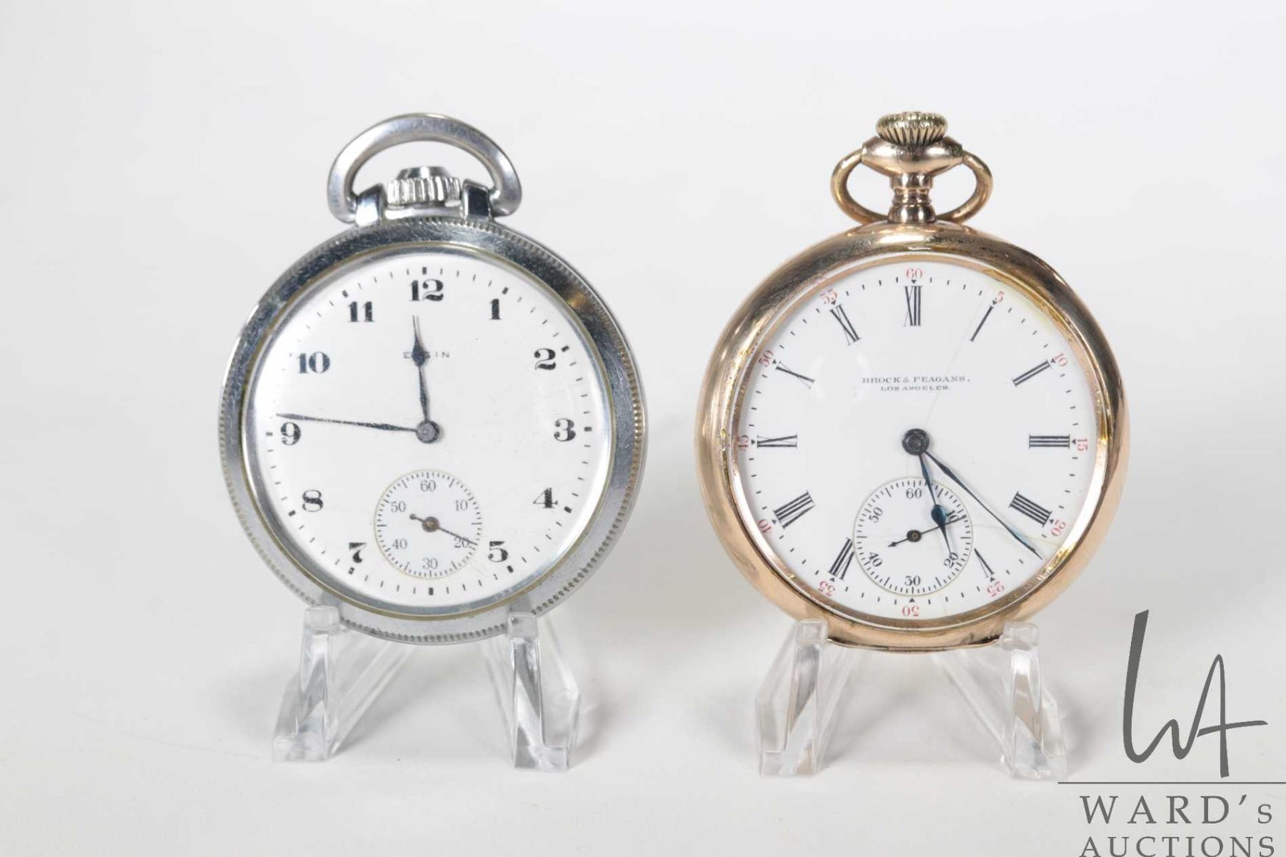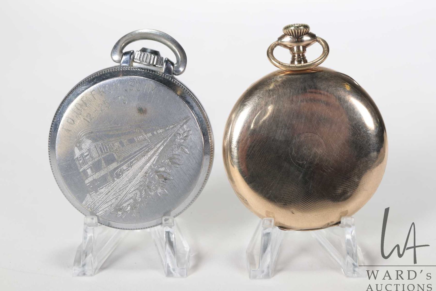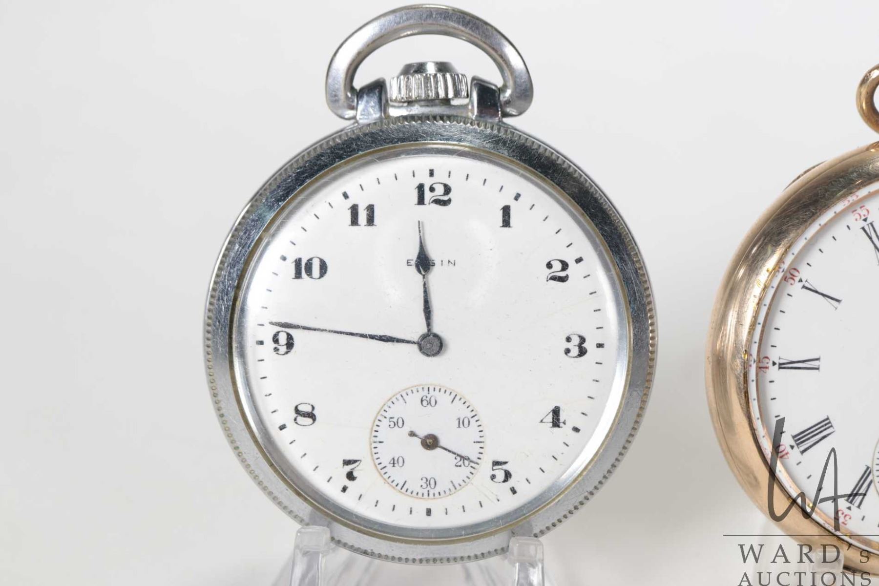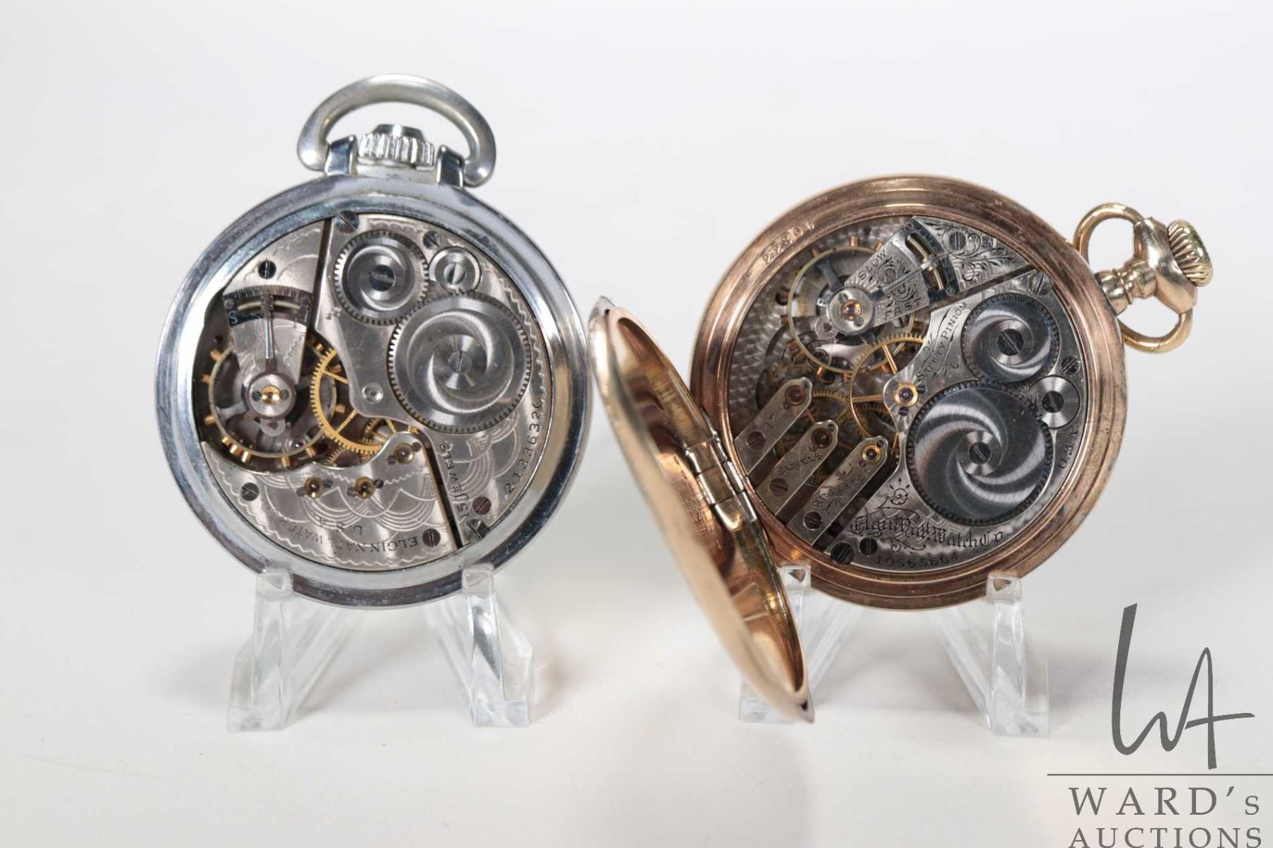 Two Elgin watches including a size 16s, 17 Jewel, Grade 244. Serial No. 10565664. Estimated production date of 1904. Nickel 3/4 plate. Movement signed Elgin Watch Co. Adjusted. Single sunk porcelain, roman numerals, spade and poker hands. Housed in a Keystone gold filled case. And a size 16s, 15 Jewel, Grade 313, model 7. Serial No. 21336320. Estimated production date 1919. Nickel 3/4th plate. movement signed Elgin watch Co. Single Sunk porcelain, bold black numbers, spade and poker hands. housed in a base metal case.