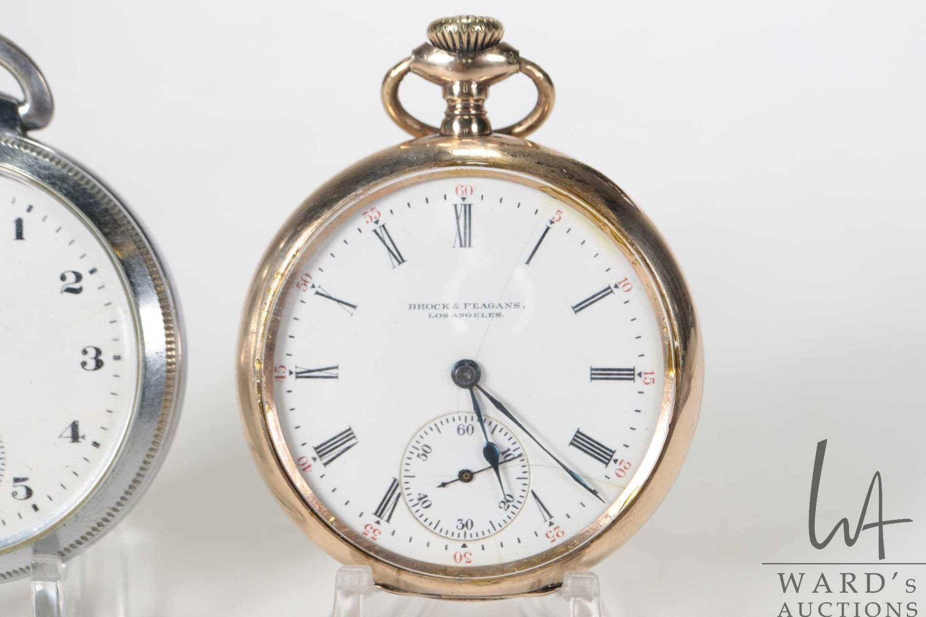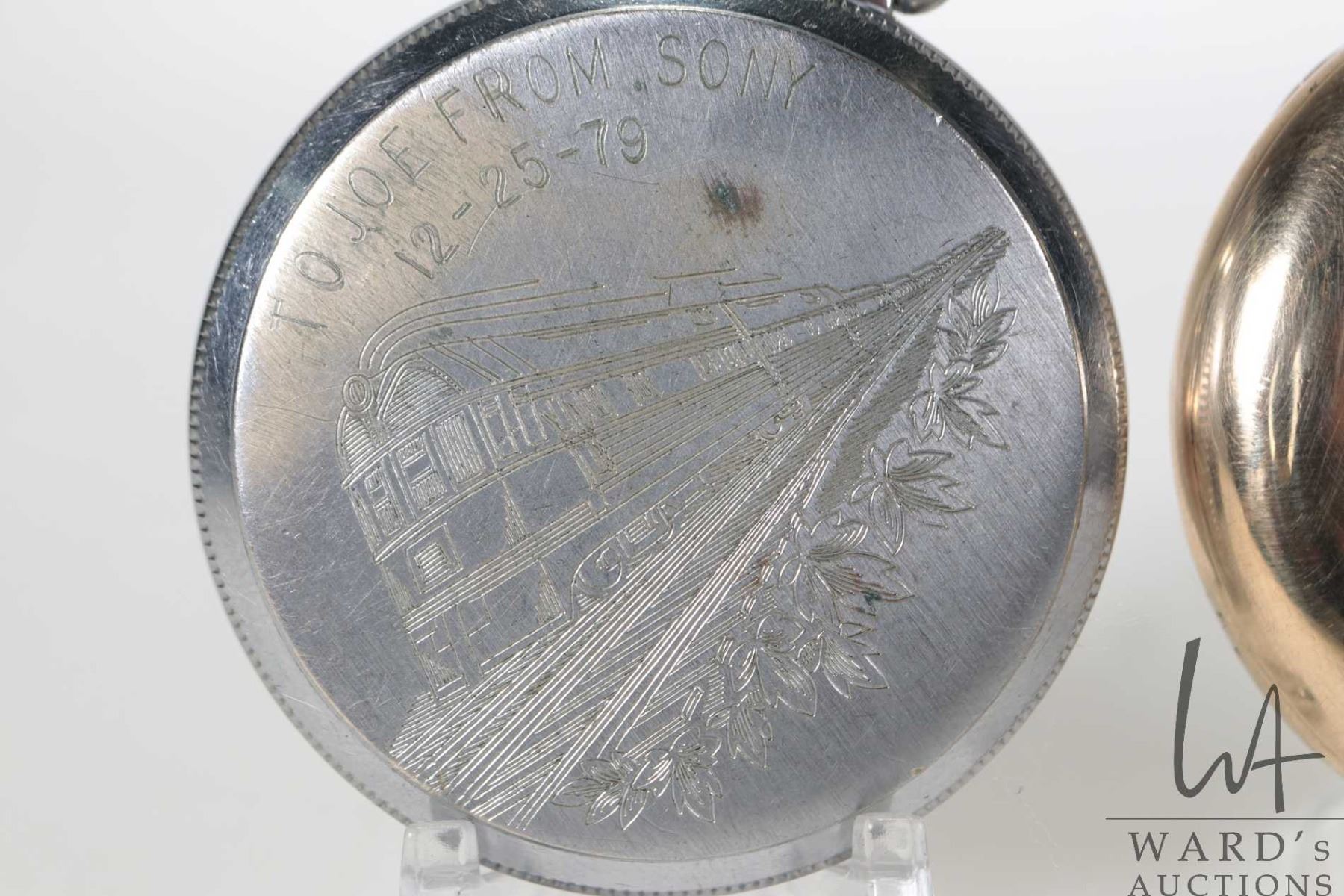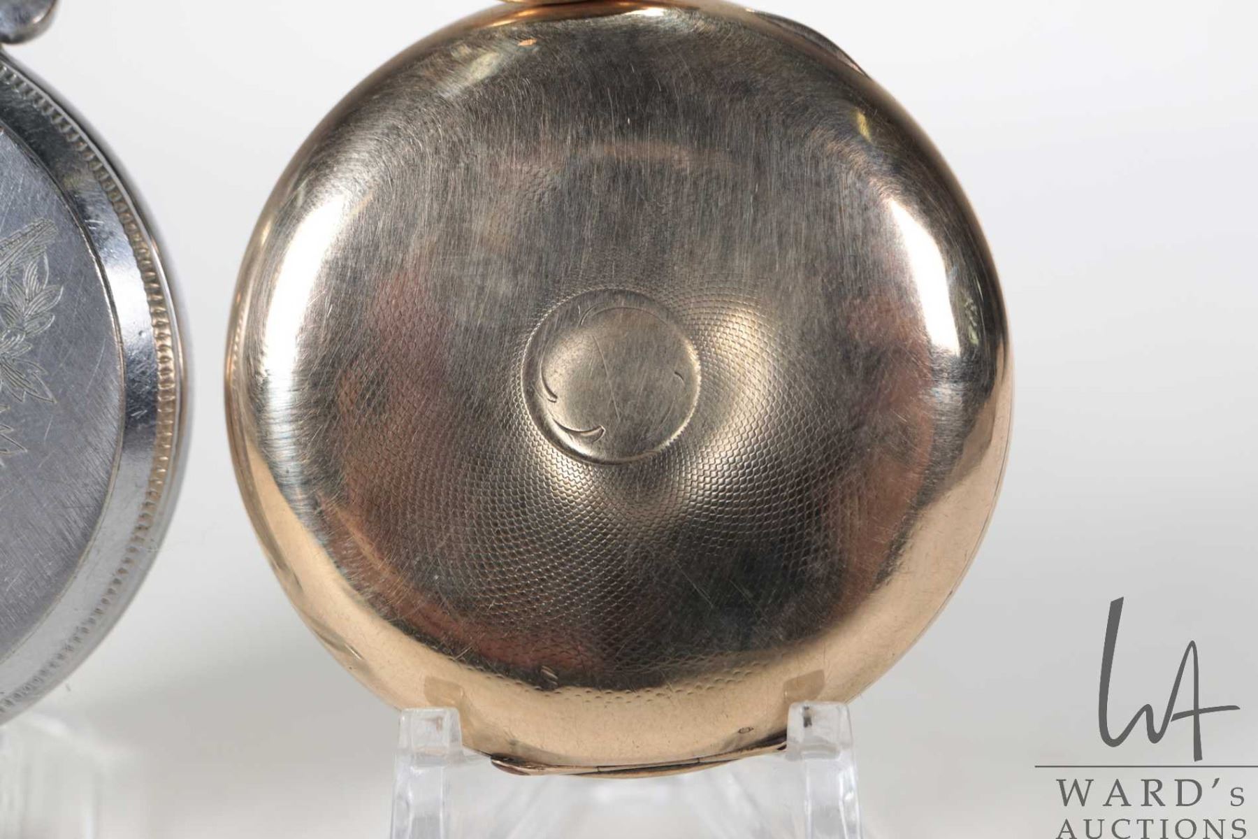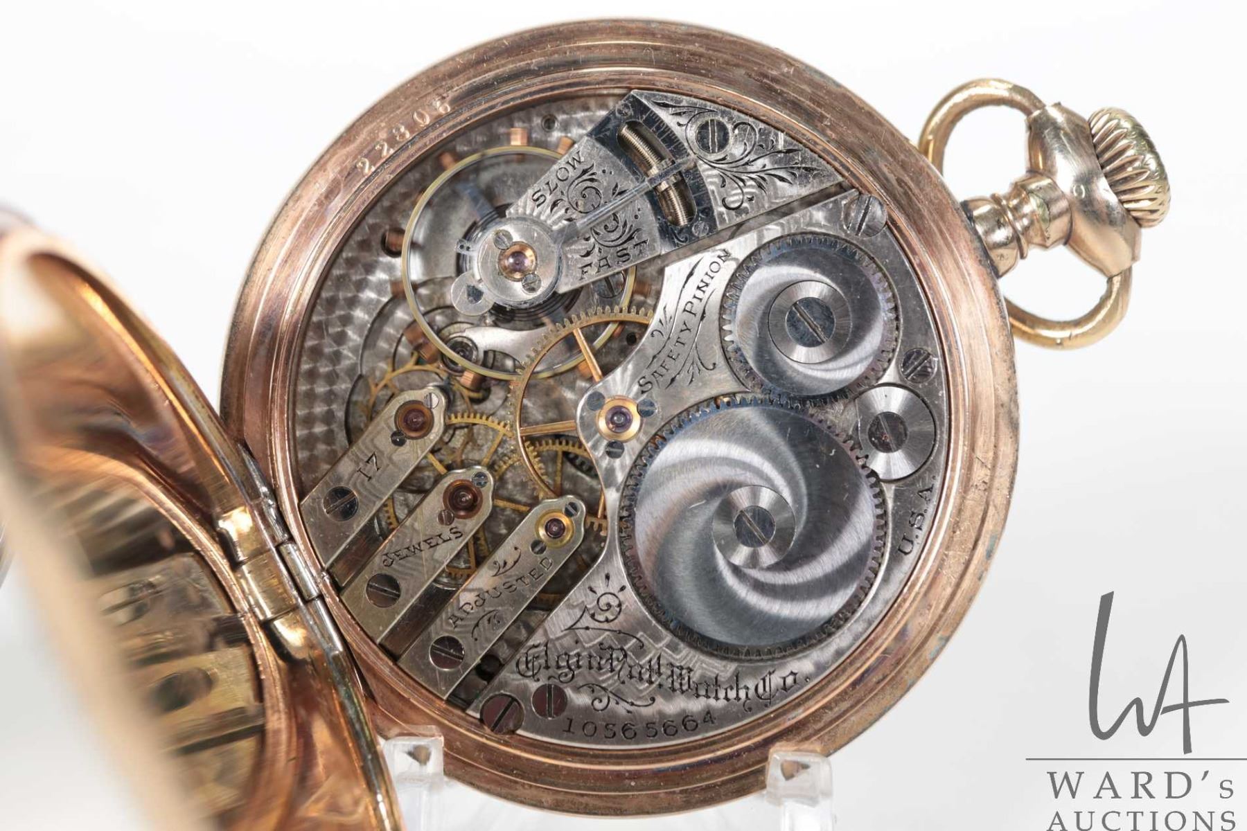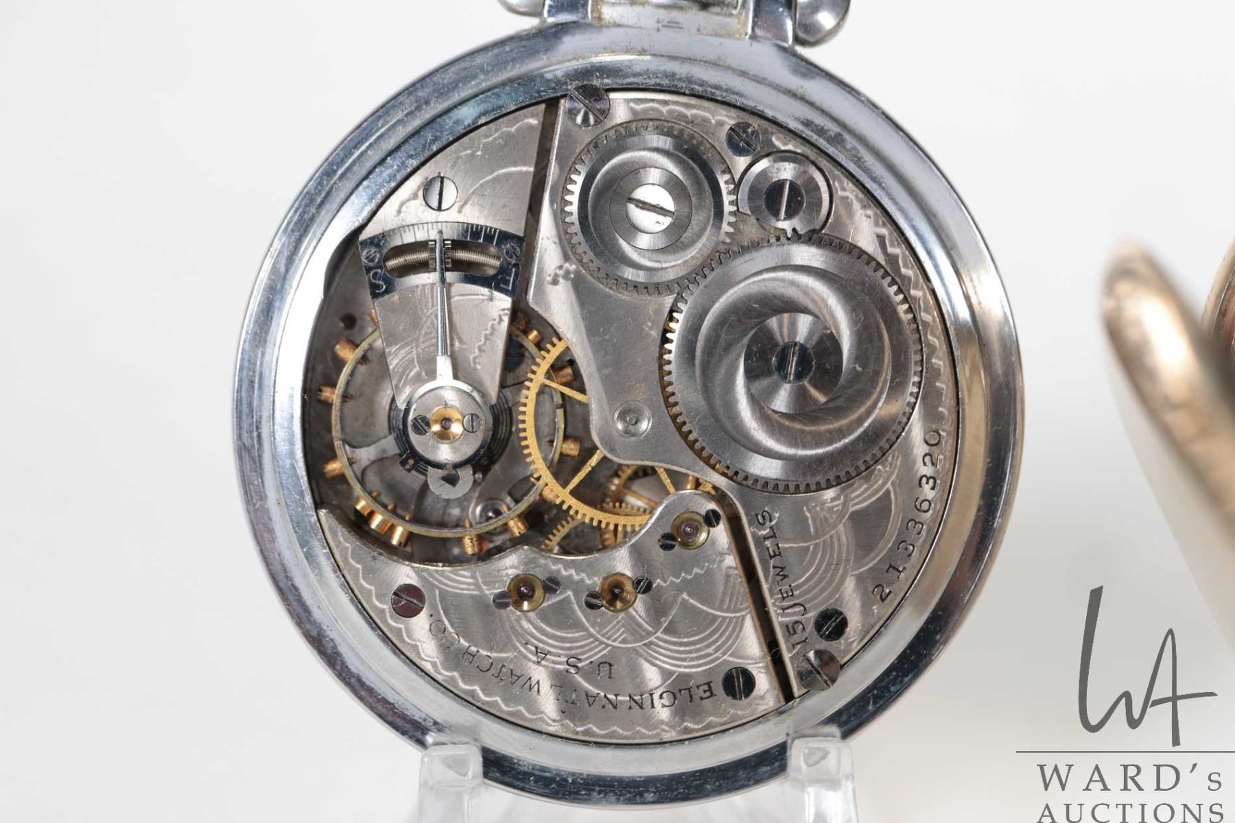 Two Elgin watches including a size 16s, 17 Jewel, Grade 244. Serial No. 10565664. Estimated production date of 1904. Nickel 3/4 plate. Movement signed Elgin Watch Co. Adjusted. Single sunk porcelain, roman numerals, spade and poker hands. Housed in a Keystone gold filled case. And a size 16s, 15 Jewel, Grade 313, model 7. Serial No. 21336320. Estimated production date 1919. Nickel 3/4th plate. movement signed Elgin watch Co. Single Sunk porcelain, bold black numbers, spade and poker hands. housed in a base metal case.