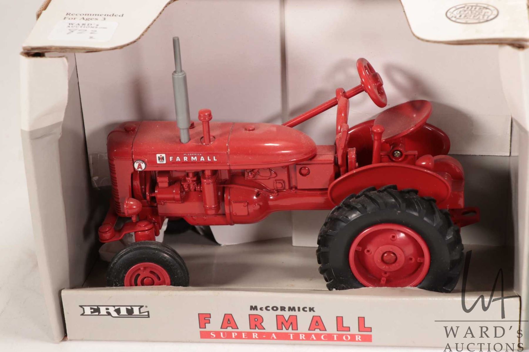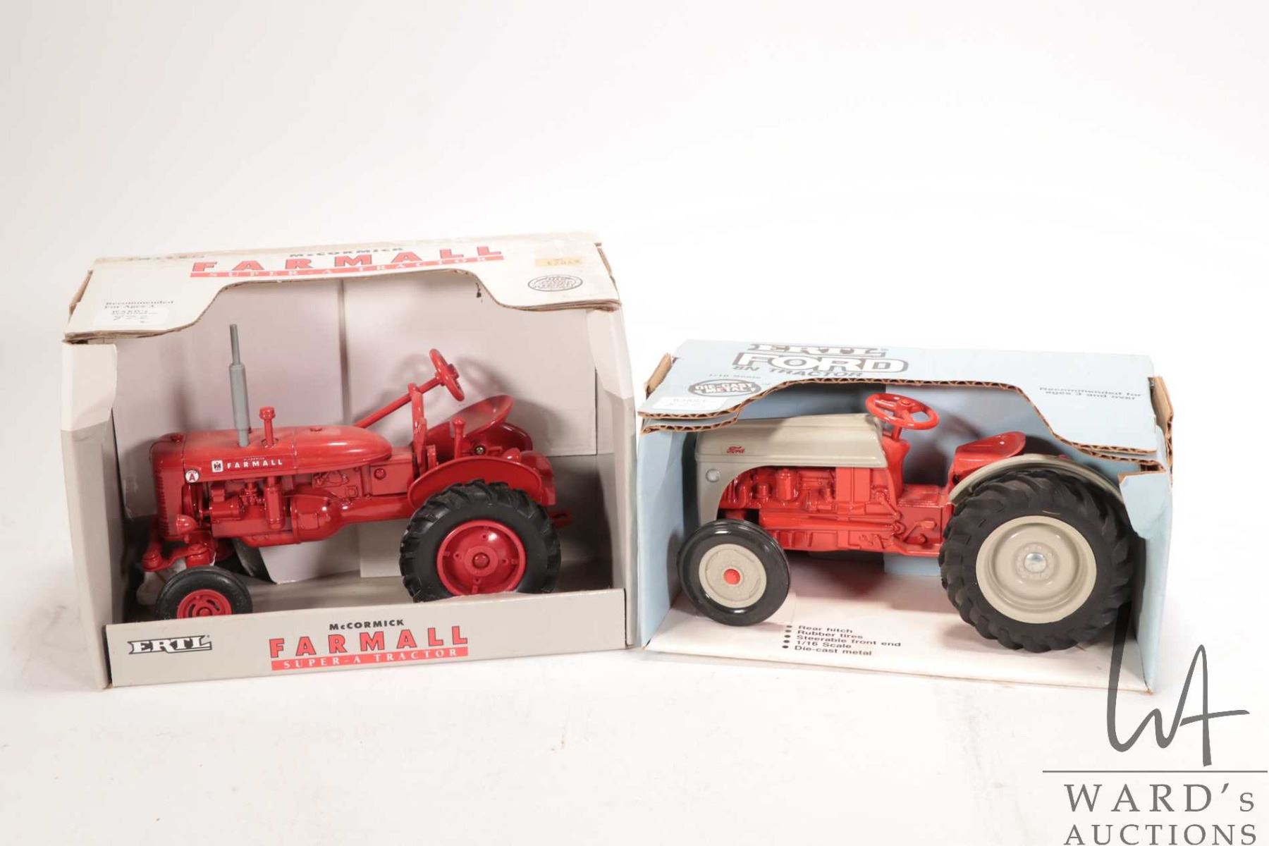 Two Ertl 1:16 scale die-cast toys including Ford 8N Tractor and Farmall Super Tractor, both in original boxes