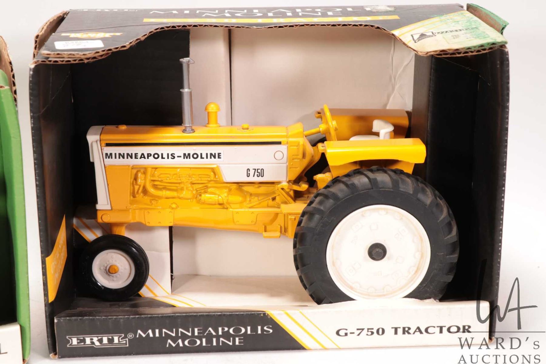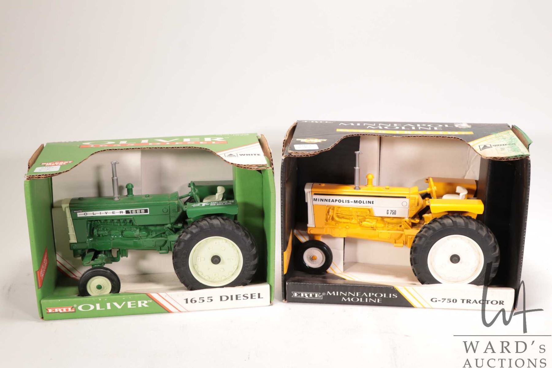 Two Ertl 1:16 scale die-cast toys including White Oliver 1655 Diesel and a Minneapolis Moline G 750, both in original box