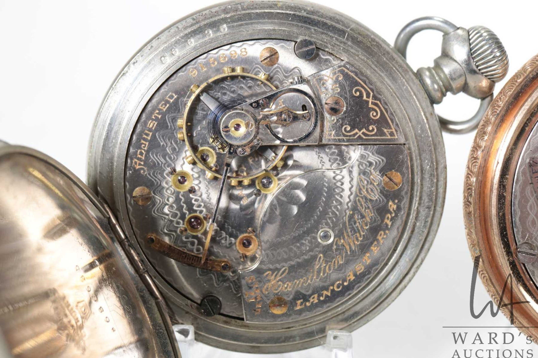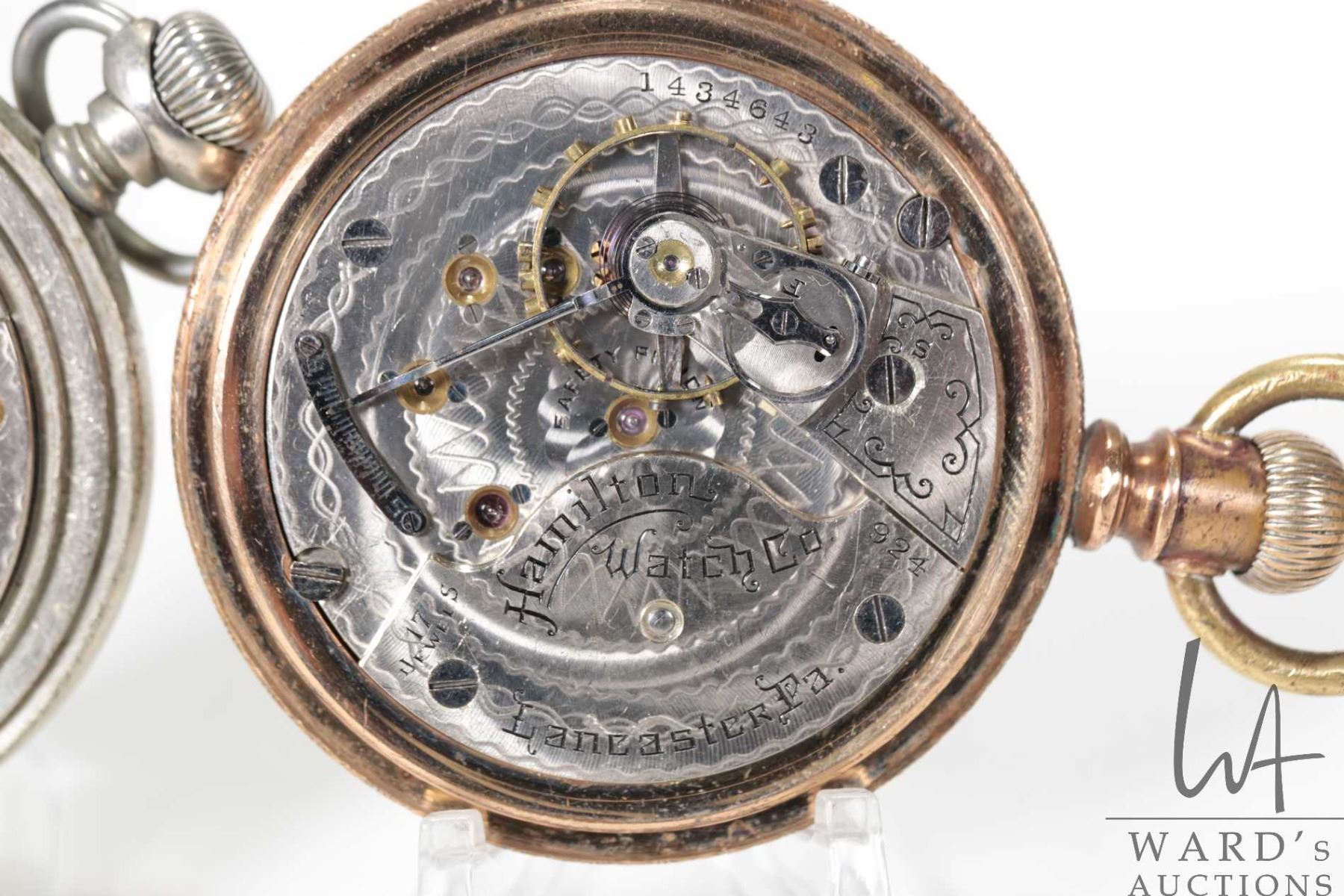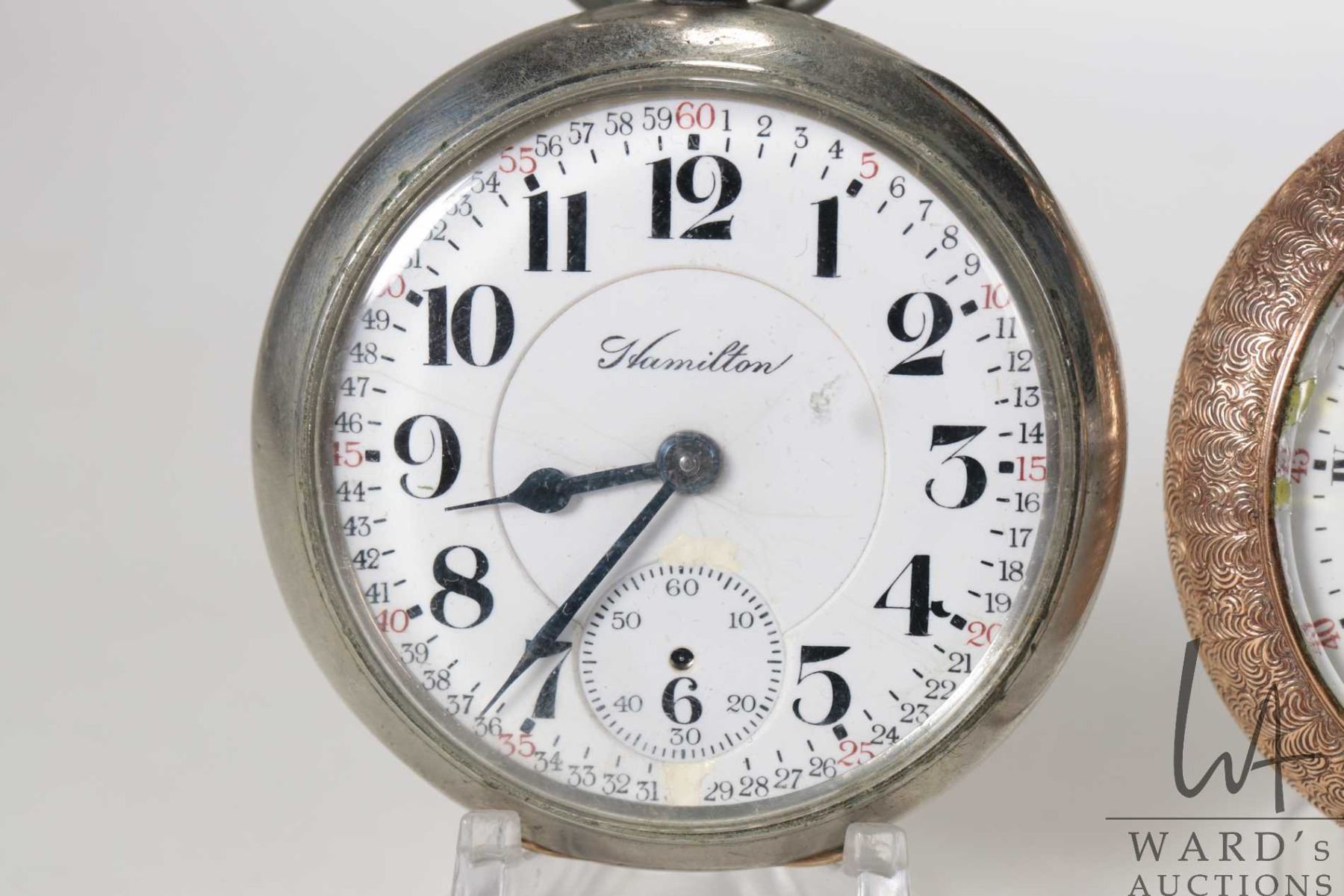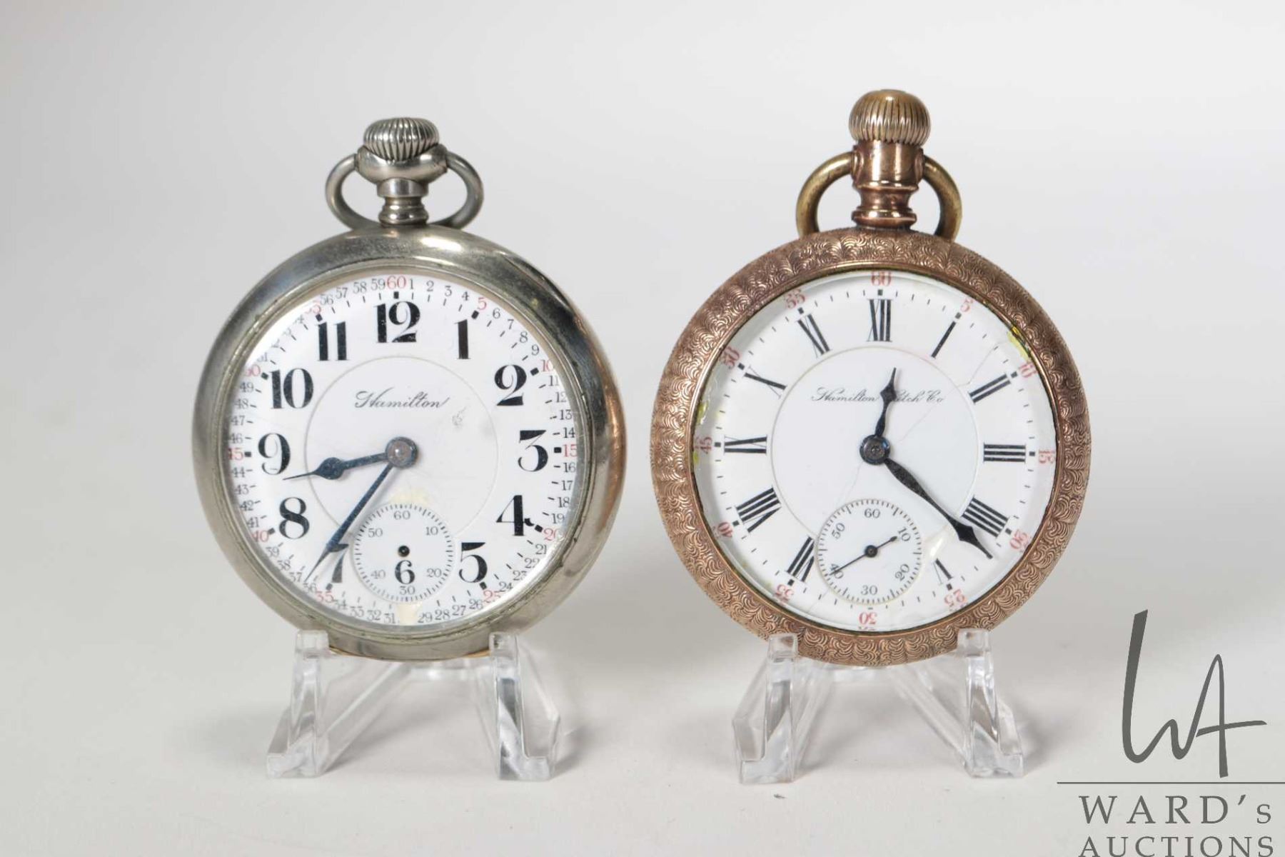 Two Hamilton pocket watches including a size 18s, 17 Jewel, Grade 926, Model 1. Serial number 915698. Estimated year of production of 1911. Nickel full plate, stem wind and lever set. movement signed Hamilton Watch Co. Lancaster, PA. Double sunk damaged porcelian, black bold numbers, Heavy spade and poker hands missing seconds hand. Housed in a silveroid keystone watchcase. and a size 18s, 17 Jewel, grade 924, model 1. Serial No. 1434643. Estimated year of production 1919. Nickle full plate, Stem wind and lever set, movement signed Hamilton Watch Co. Lancaster, PA. Double sunk damaged porcelain, black roman numerals, heavy diamond hands. housed in a unmarked case with heavy engraving. Both working at time of cataloguing.