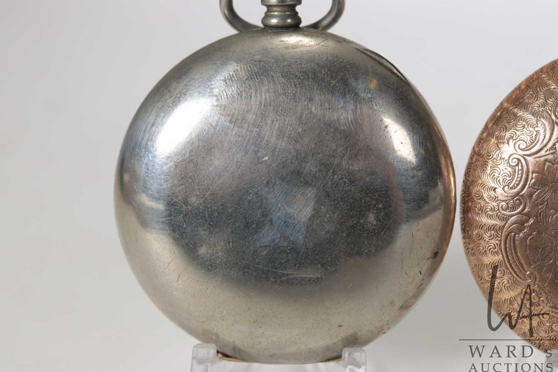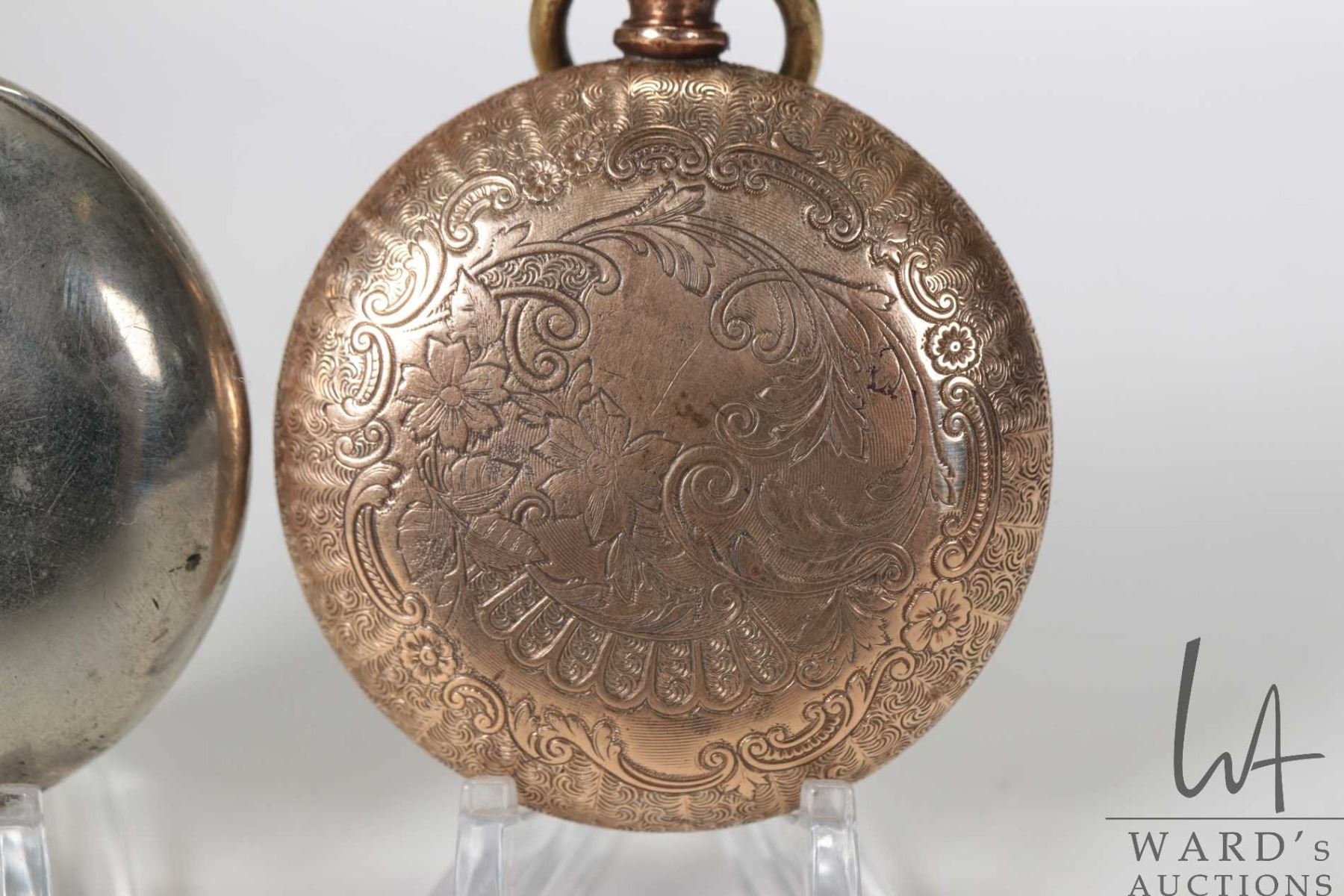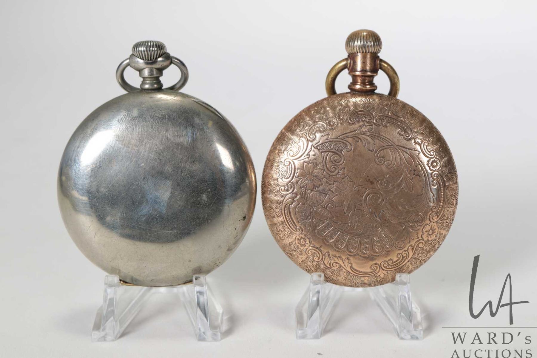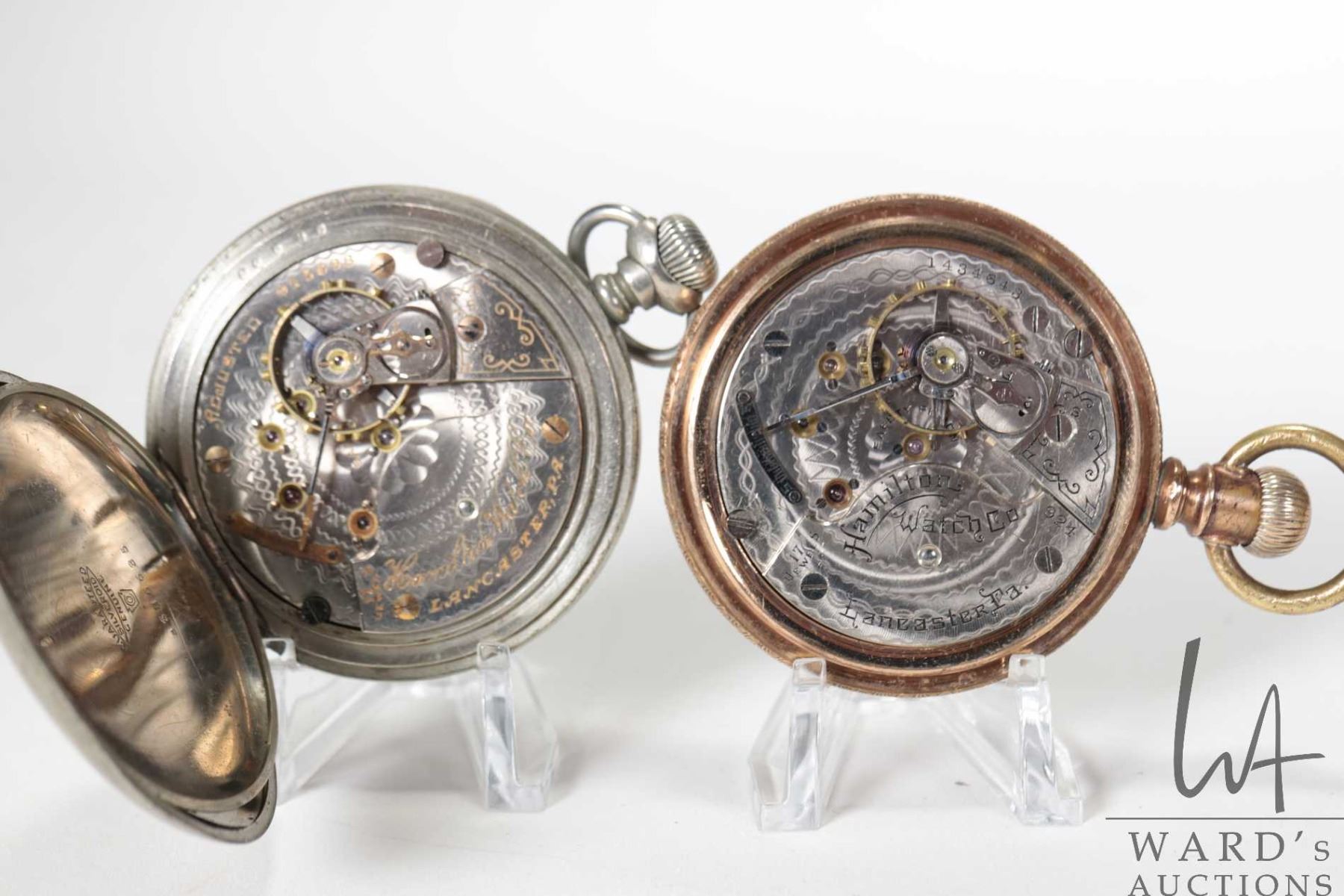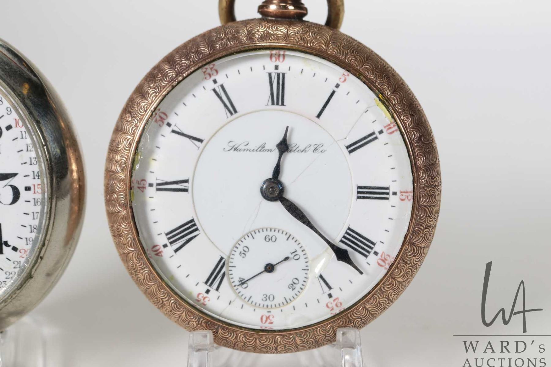 Two Hamilton pocket watches including a size 18s, 17 Jewel, Grade 926, Model 1. Serial number 915698. Estimated year of production of 1911. Nickel full plate, stem wind and lever set. movement signed Hamilton Watch Co. Lancaster, PA. Double sunk damaged porcelian, black bold numbers, Heavy spade and poker hands missing seconds hand. Housed in a silveroid keystone watchcase. and a size 18s, 17 Jewel, grade 924, model 1. Serial No. 1434643. Estimated year of production 1919. Nickle full plate, Stem wind and lever set, movement signed Hamilton Watch Co. Lancaster, PA. Double sunk damaged porcelain, black roman numerals, heavy diamond hands. housed in a unmarked case with heavy engraving. Both working at time of cataloguing.
