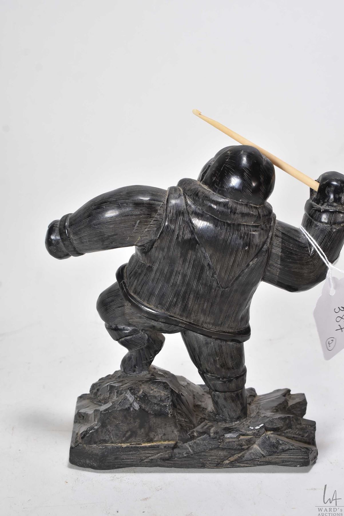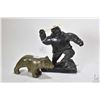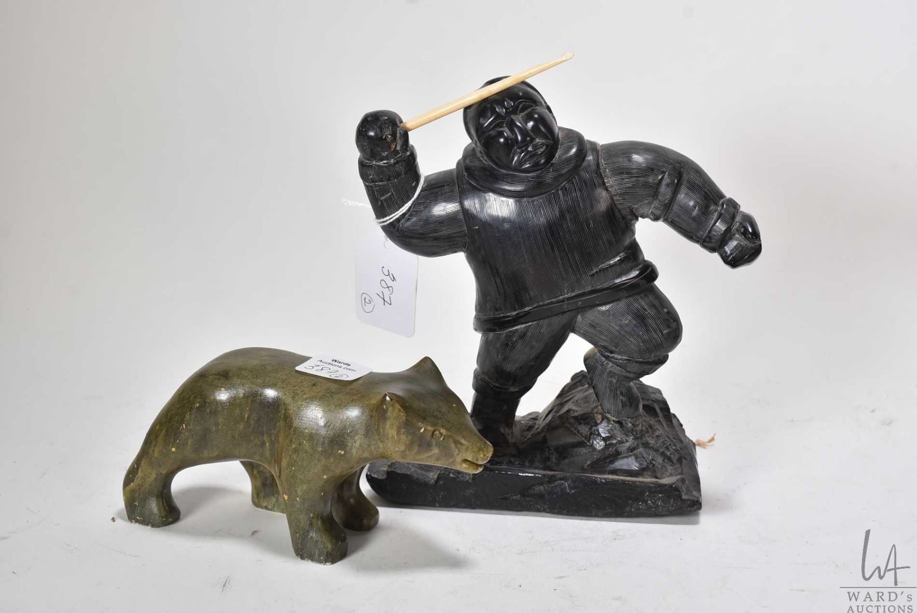 Two Inuit carvings including Argillite carved hunter 7" in height and green soapstone bear