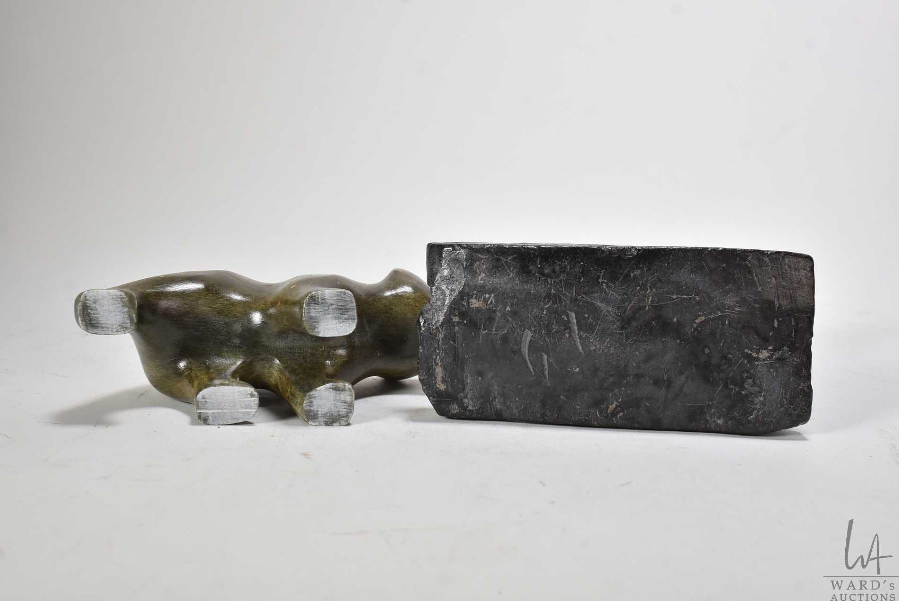 Two Inuit carvings including Argillite carved hunter 7  in height and green soapstone bear