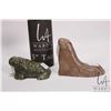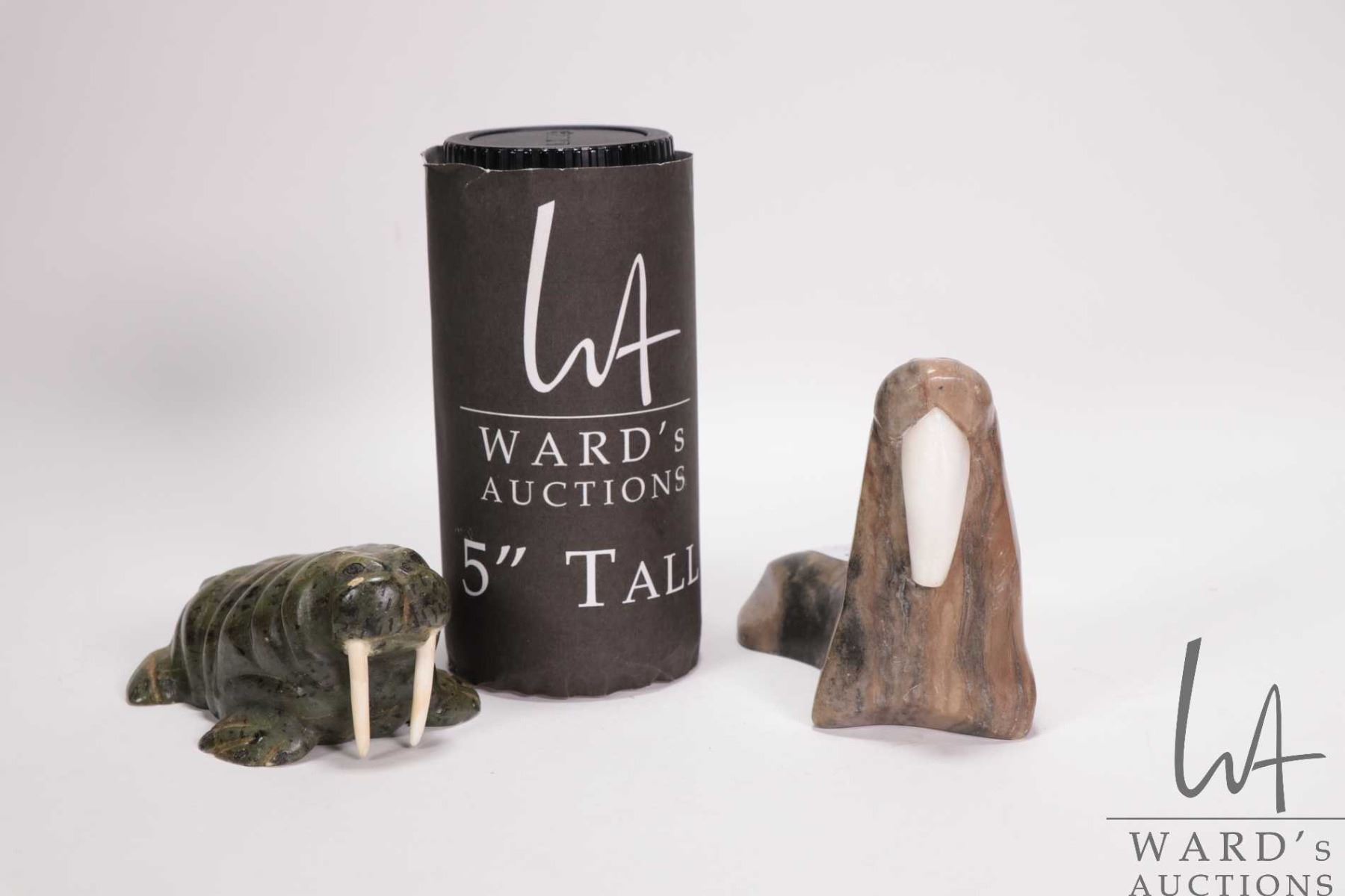 Two Inuit soapstones including 4 1/2" walrus signed by artist Sepak, Alaska 1990 and a walrus signed