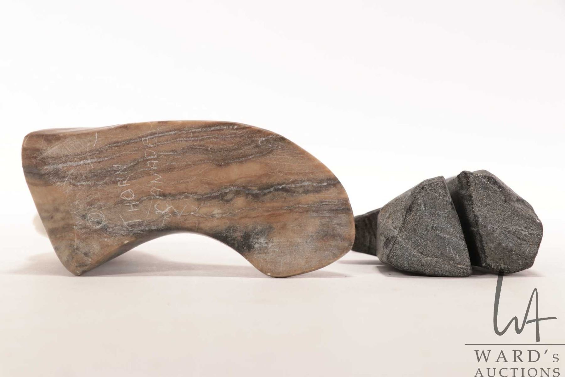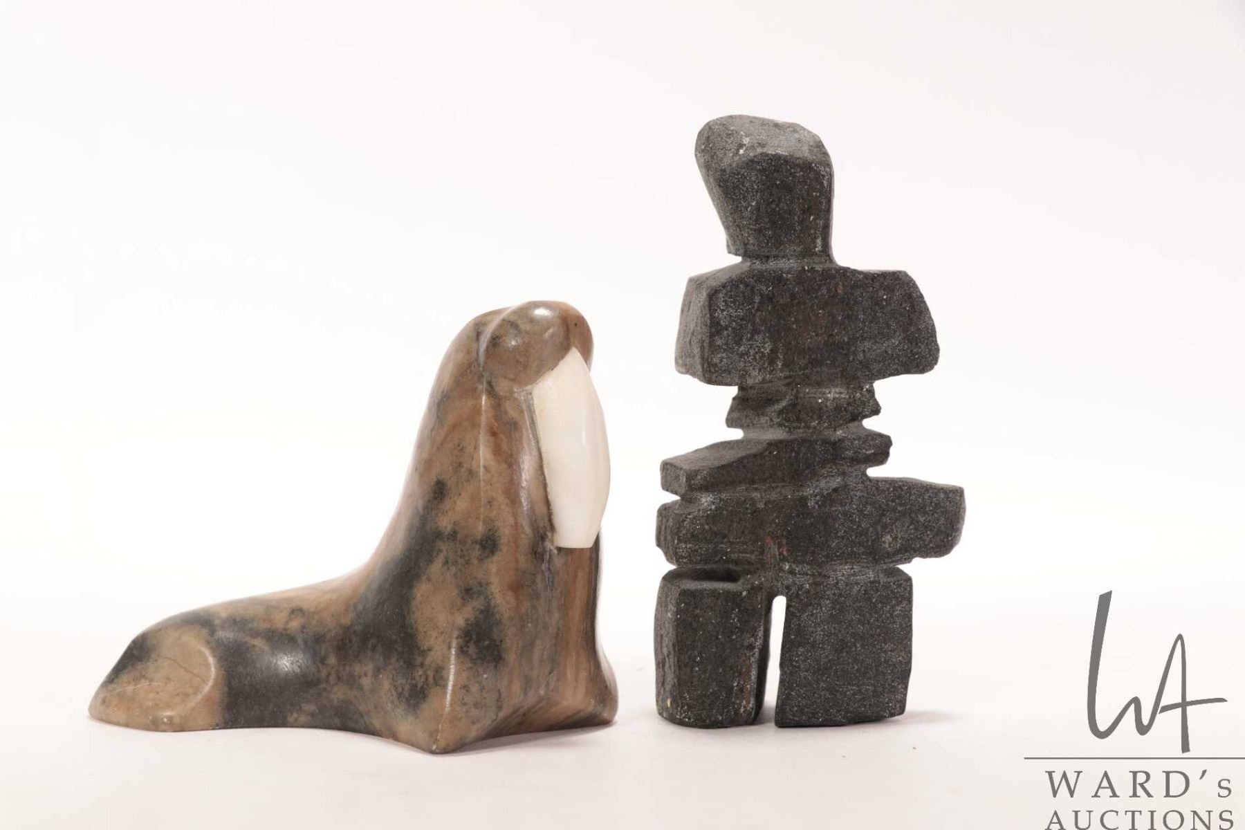 Two Inuit soapstones including 5 1/2" Inukshuk and a walrus signed by artist Thorn 3 3/4" in height