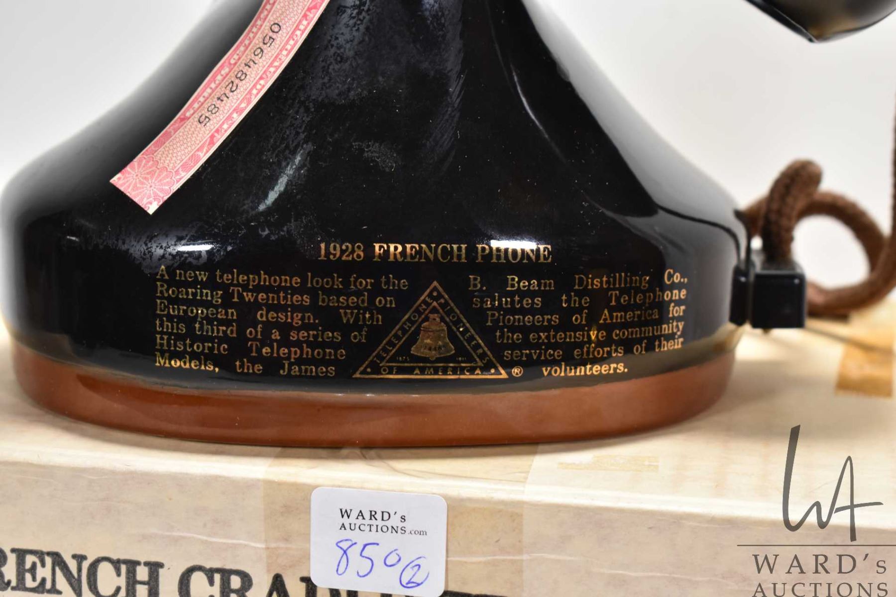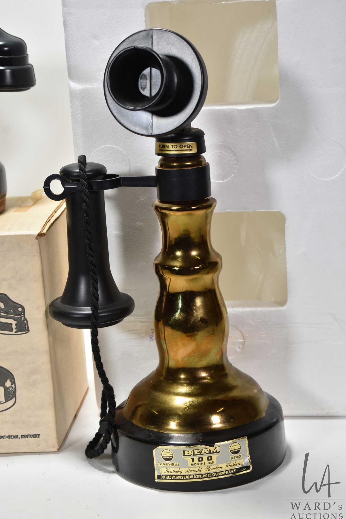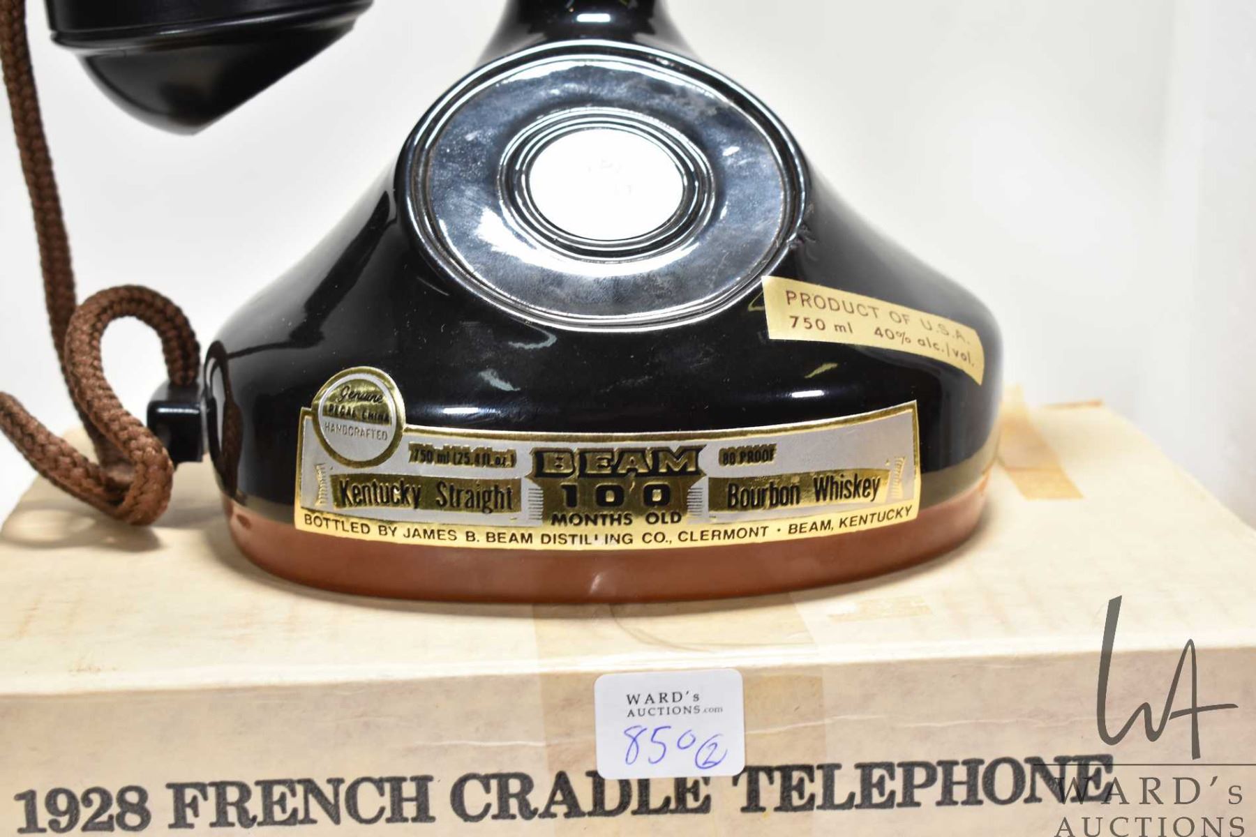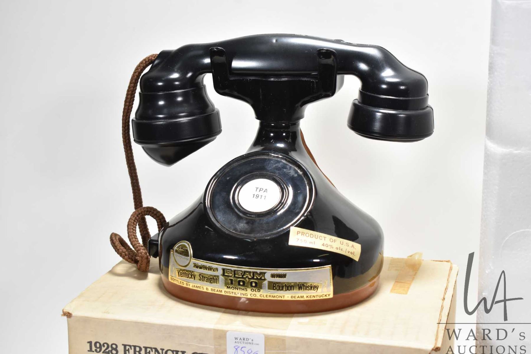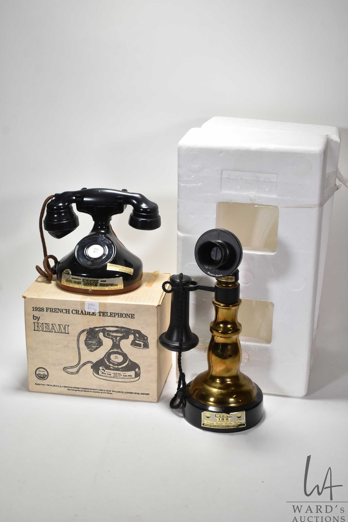 Two Jim Beam porcelain phone bottles including 1928 french cradle telephone/ Kentucky Straight Bourbon Whiskey/ 750ml/ 80 proof/ 40% ABV/ with original box, and a 1897 desk set telephone/ Kentucky Straight Bourbon Whiskey/ 750ml/ 80 Proof/ with protective styrofoam insert. Both bottles are seal and unopened