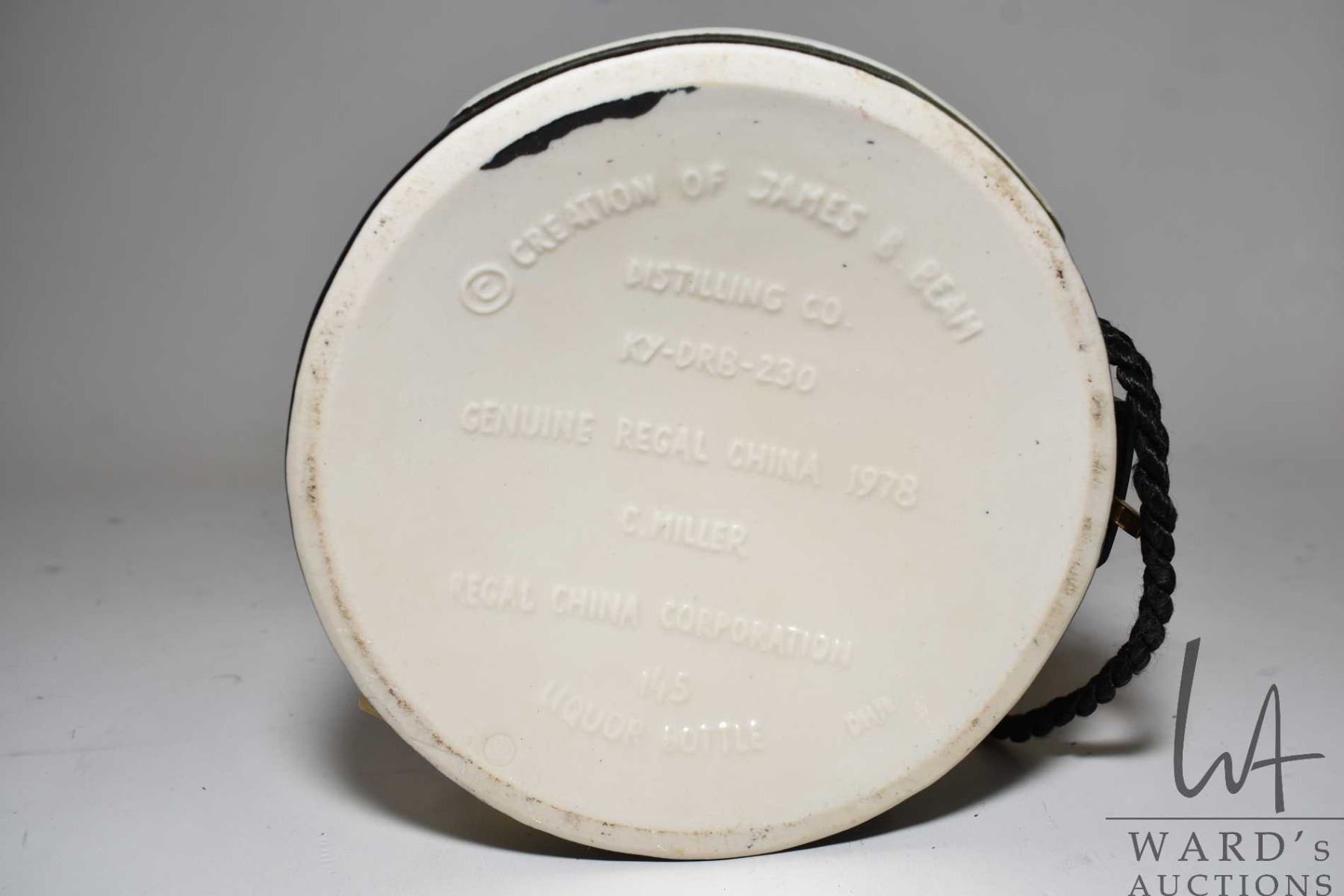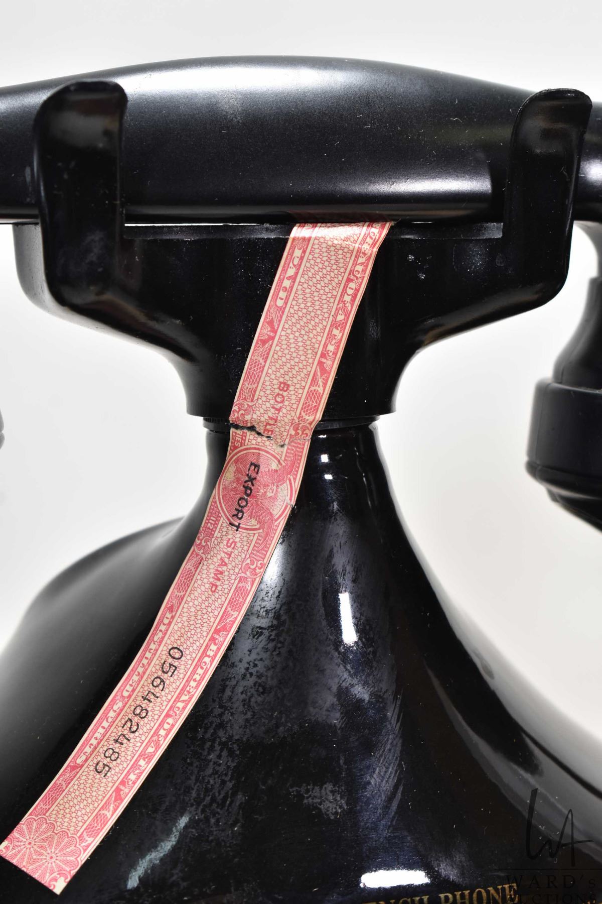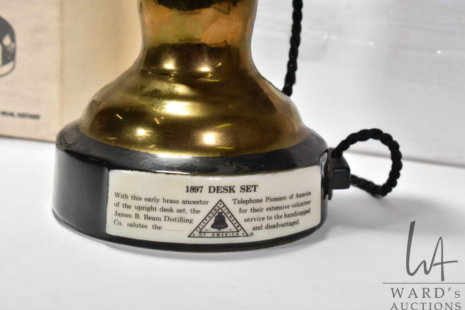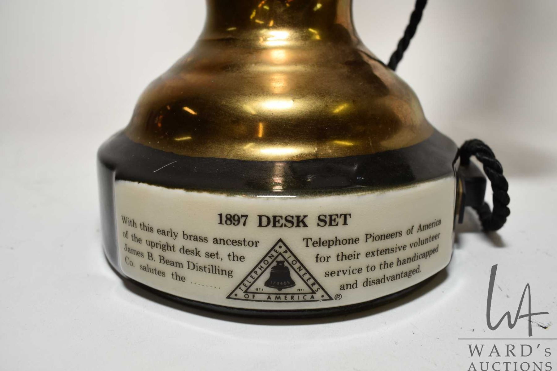 Two Jim Beam porcelain phone bottles including 1928 french cradle telephone/ Kentucky Straight Bourbon Whiskey/ 750ml/ 80 proof/ 40% ABV/ with original box, and a 1897 desk set telephone/ Kentucky Straight Bourbon Whiskey/ 750ml/ 80 Proof/ with protective styrofoam insert. Both bottles are seal and unopened