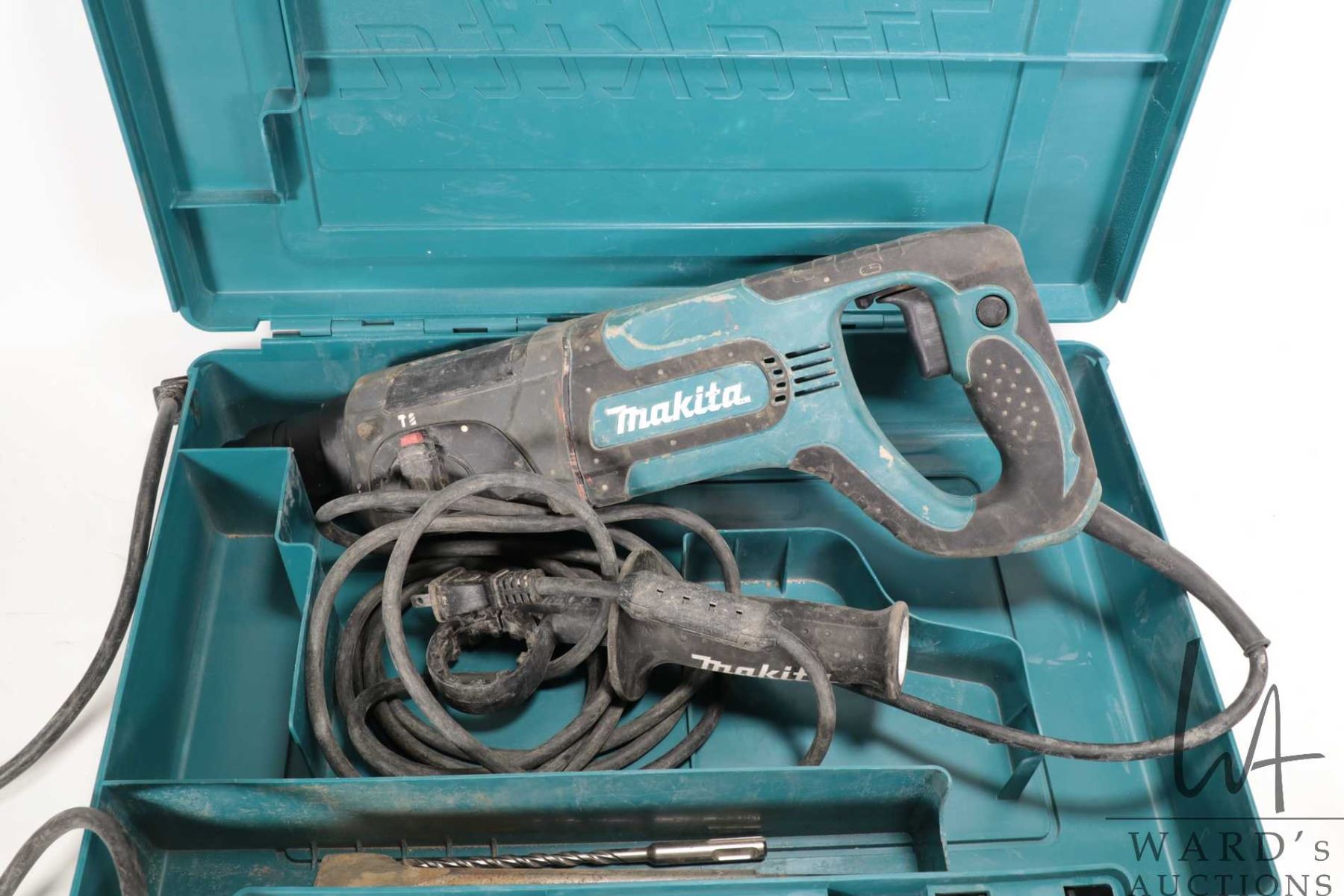 Two Makita power tools including a HR2475 hammer drill with case and two bits plus a JR3050T reciprocating saw