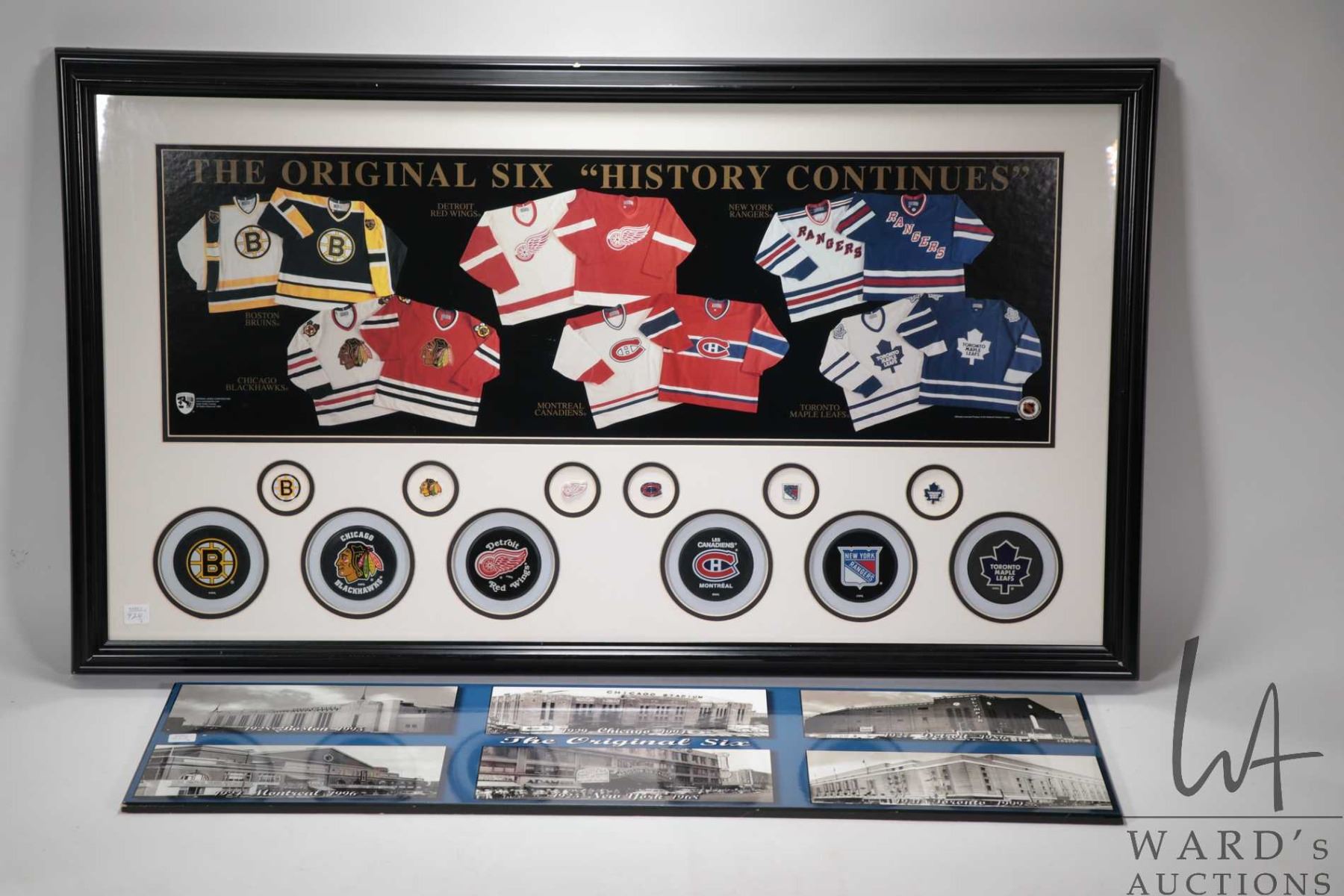Two "Original Six" wall hangings including shadowbox collection of pucks and pins. overall dimensions including frame 25"X 43". Plus plaque mount photo collage. Note: Artwork cannot be insured during shipping and are often too large for most couriers. Local pickup recommended