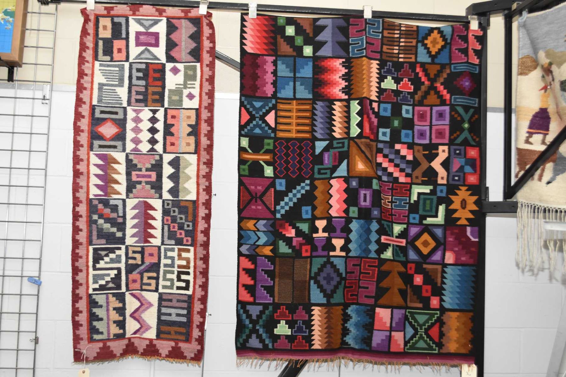 Two Peruvian hand woven wall hangings including an Inca Calendar 41" X 57" and smaller "22" X 57"