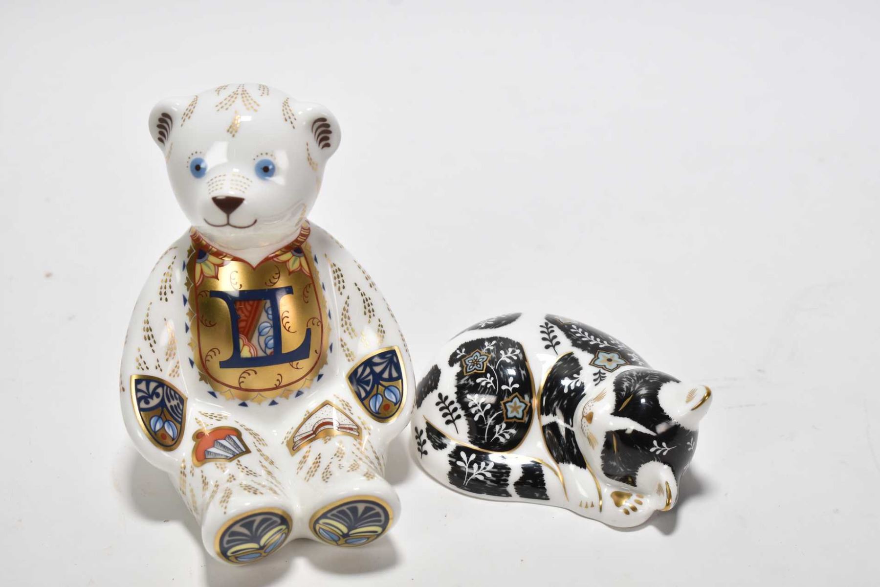 Two Royal Crown Derby gold stopper paperweights including "Alphabet Bear" and "Misty"