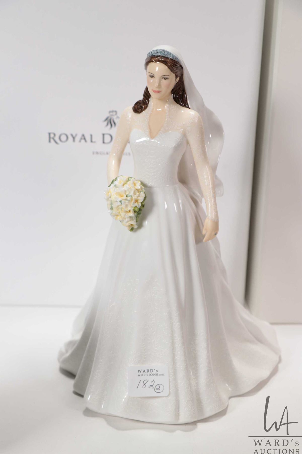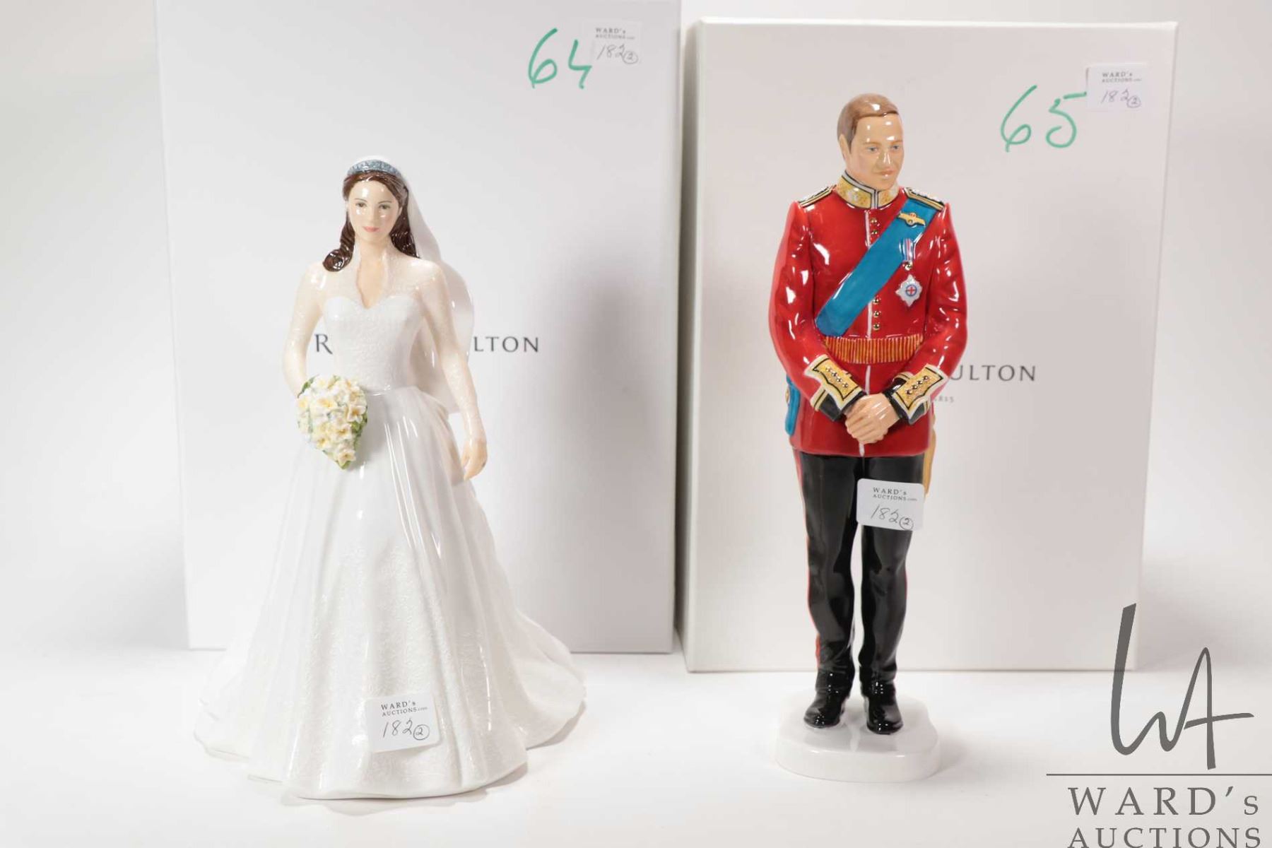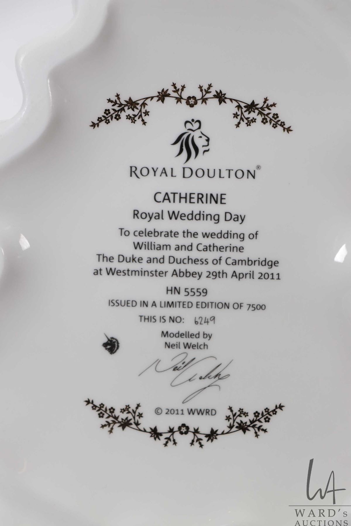 Two Royal Doulton limited edition figurines including "Prince William- Royal Wedding" HN5573, edition 3479/5000 and Catherine-Royal Wedding Day" HN5559, edition 5249/7,500. Both include original boxes and certificates