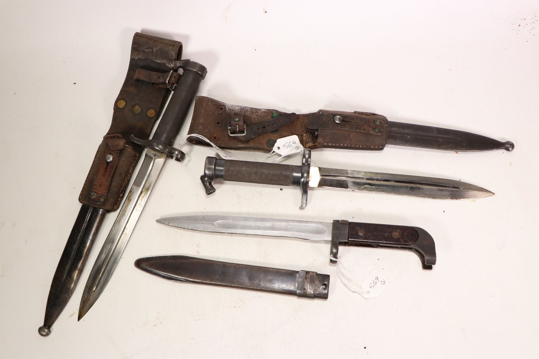 Two Swedish M 96 Mauser bayonets with scabbards and a unmarked bayonet with scabbard.