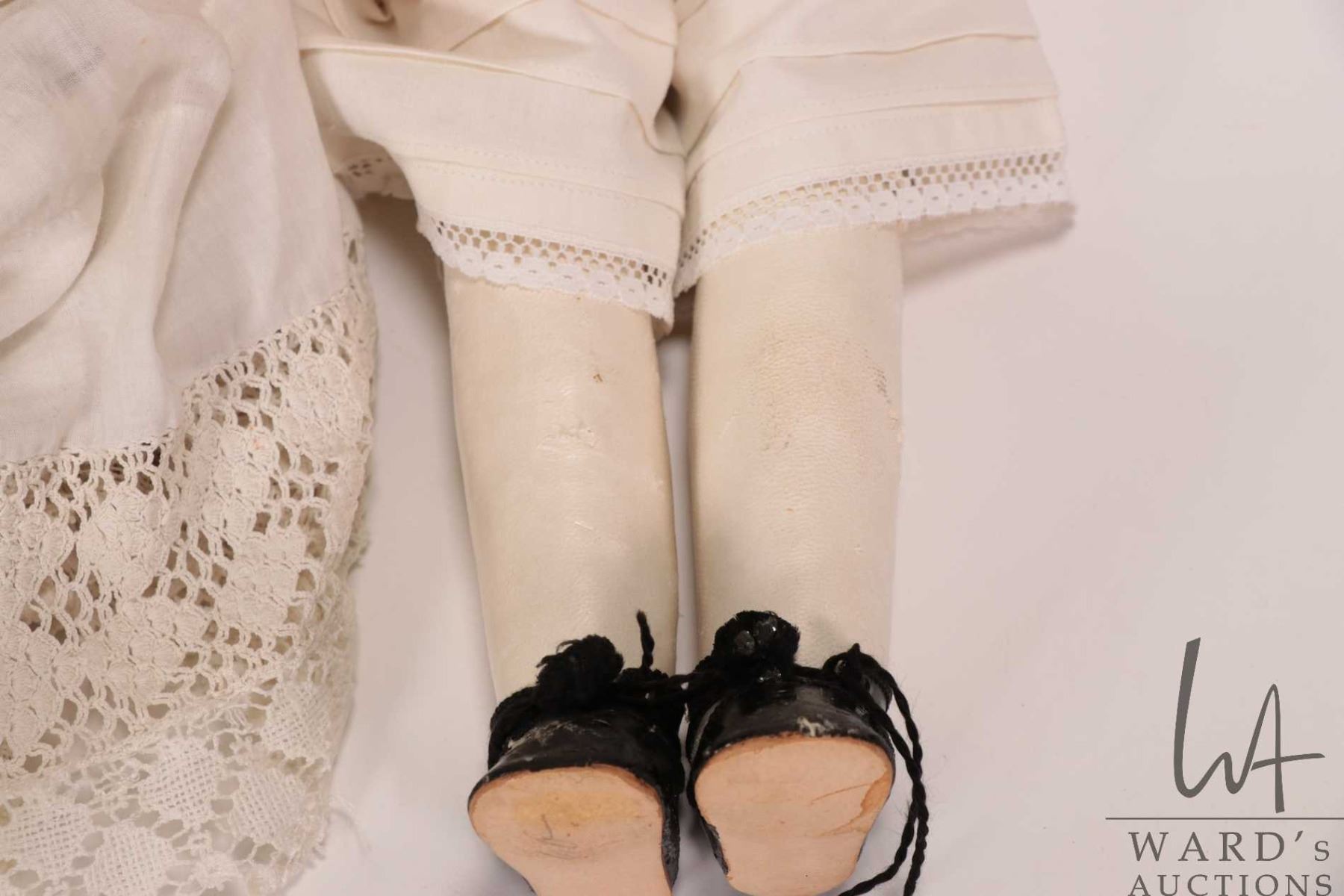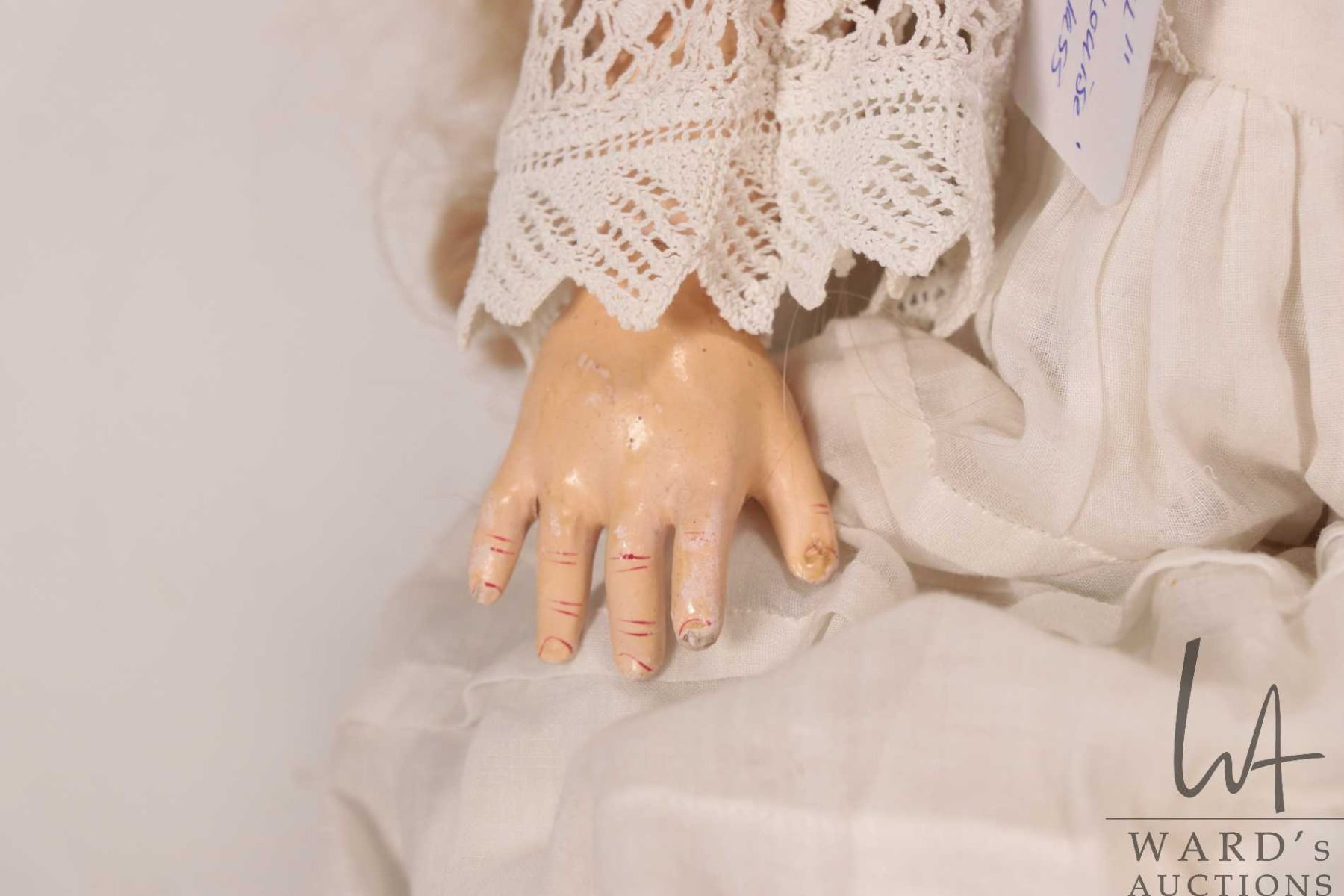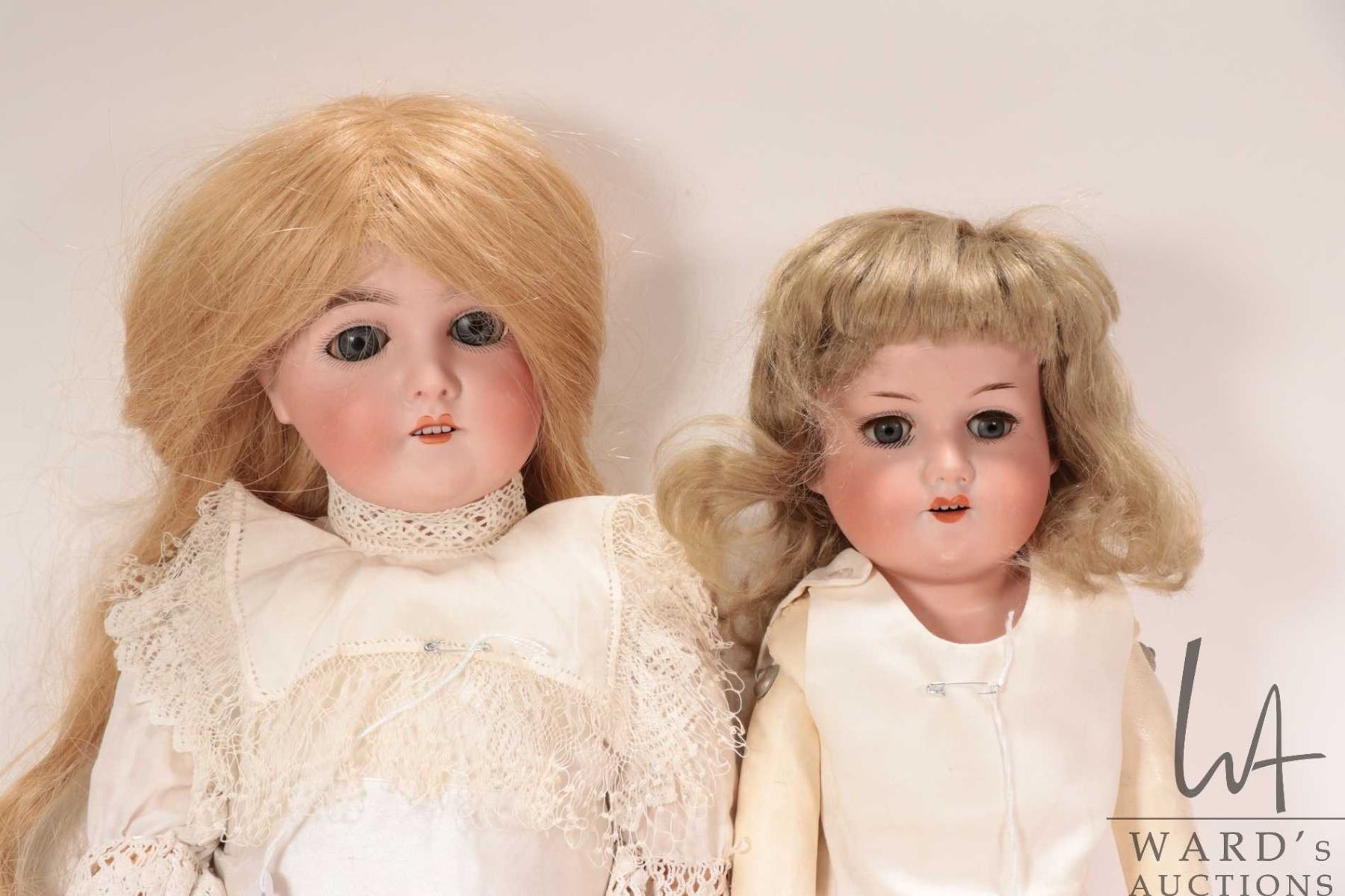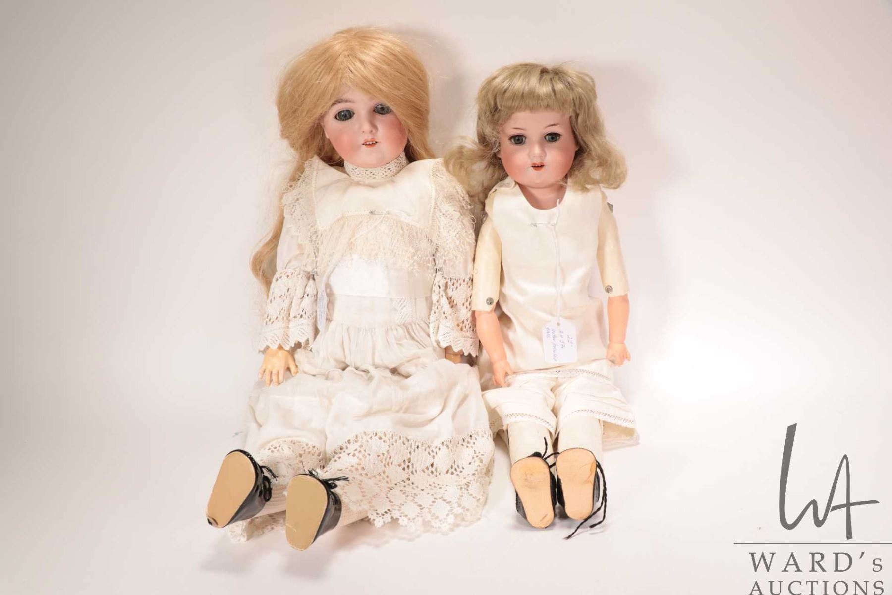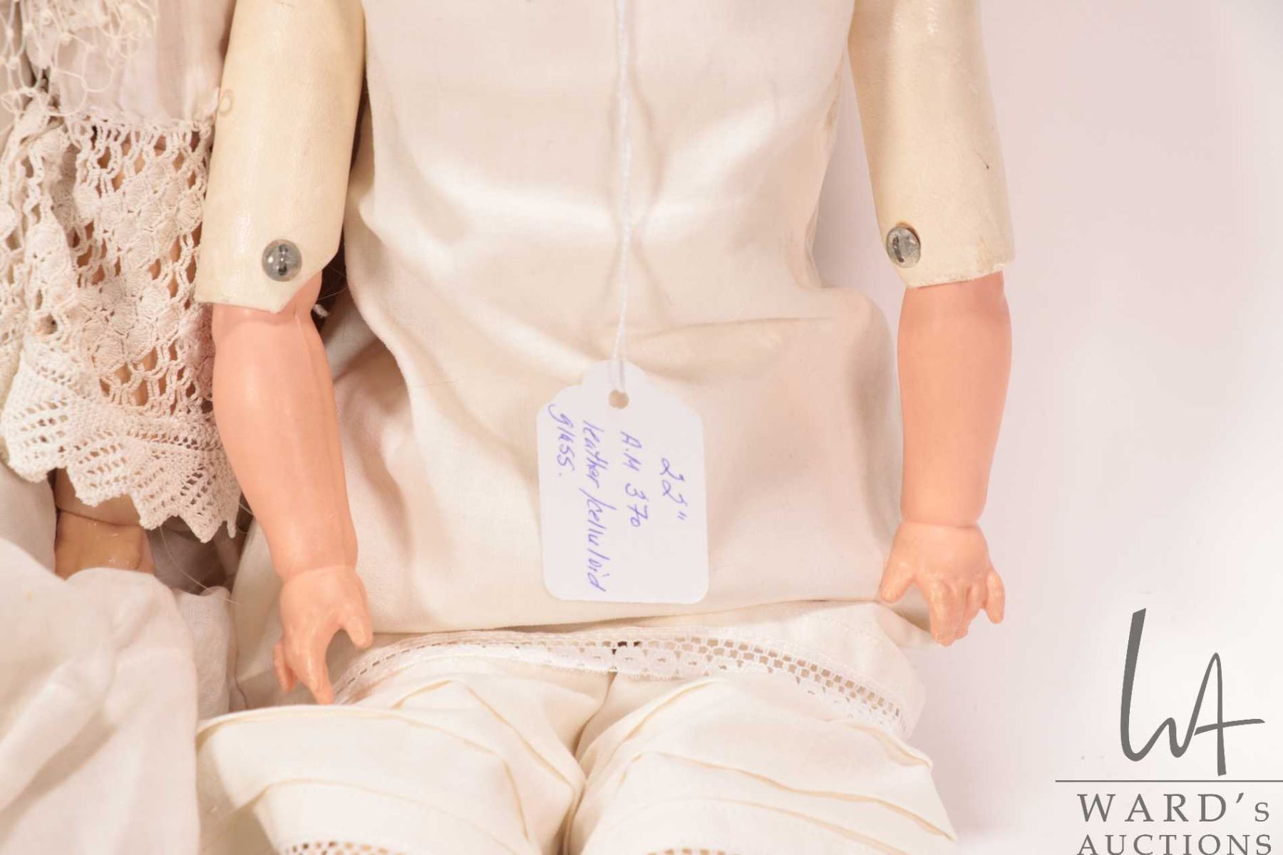 Two antique Armand Marseille bisque head dolls including "Queen Louise" 24" on leather body with composition arms and hands, grey glass sleep eyes. No cracks to bisque seen and a 22" A.M. 370 on leather body with celluloid lower arms, blue sleep eyes. No cracks to bisque seen. Note: Viewing in person recommended. Buyer must satisfy themselves as to condition