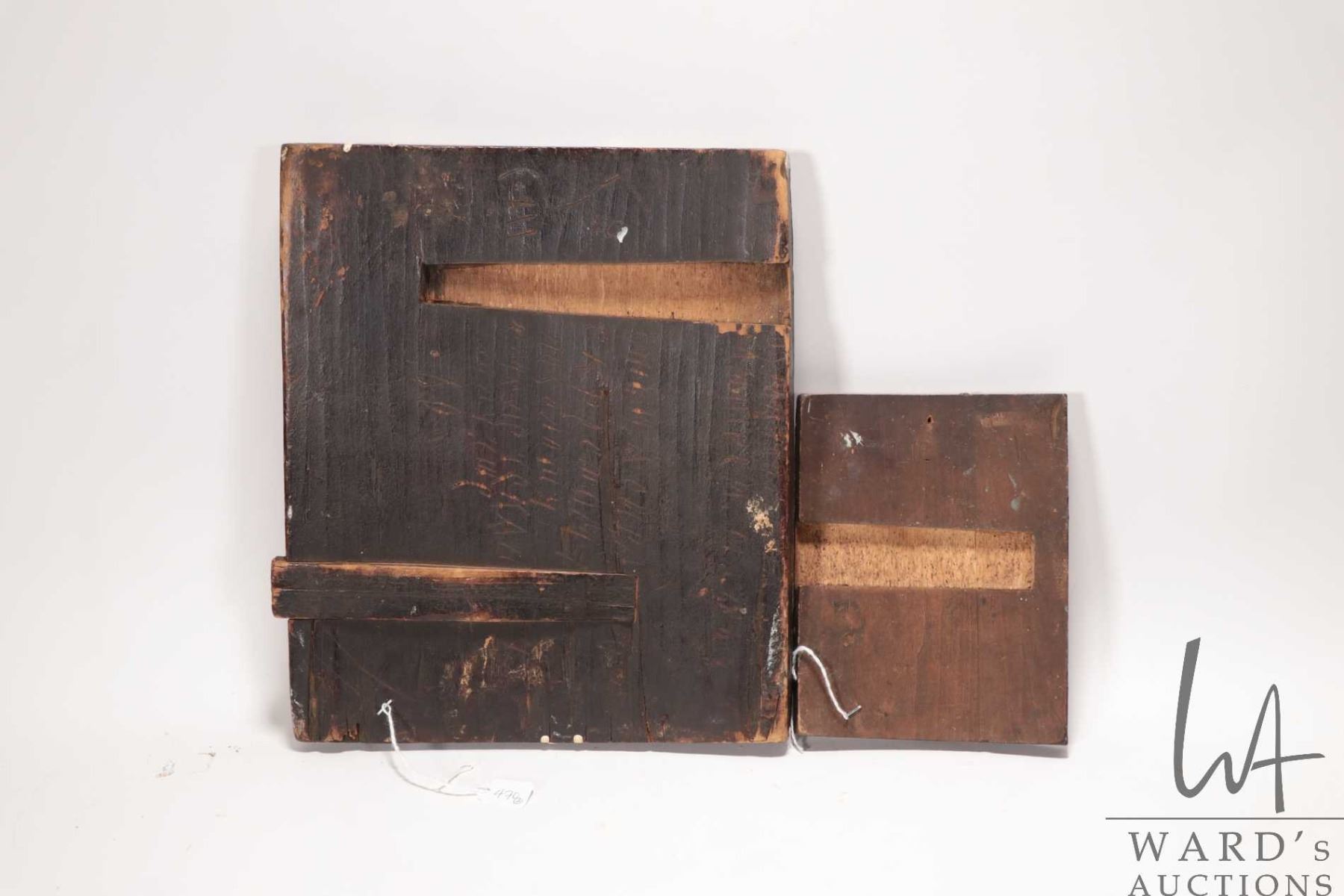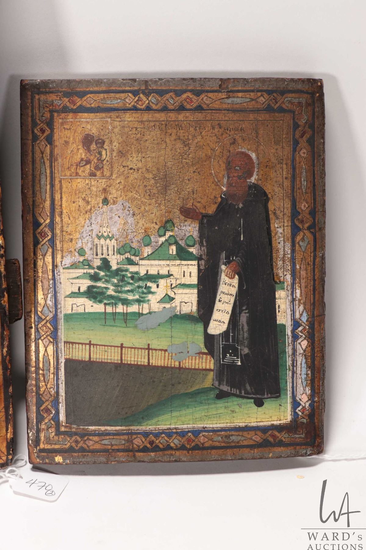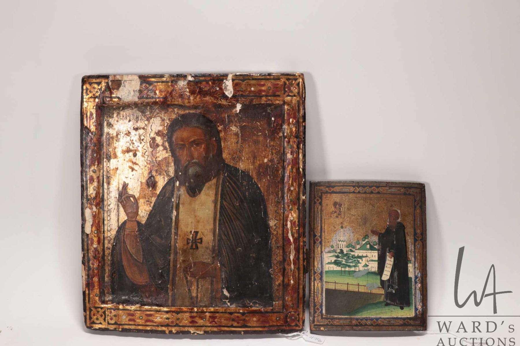 Two antique Russian Orthodox, hand painted on wood panel religious icons including a depiction of Saint Seraphim of Sarov 12" X 10 1/4" and a small panel with a depiction of possibly Sergius of Radonezh, 7" X 6 1/2"