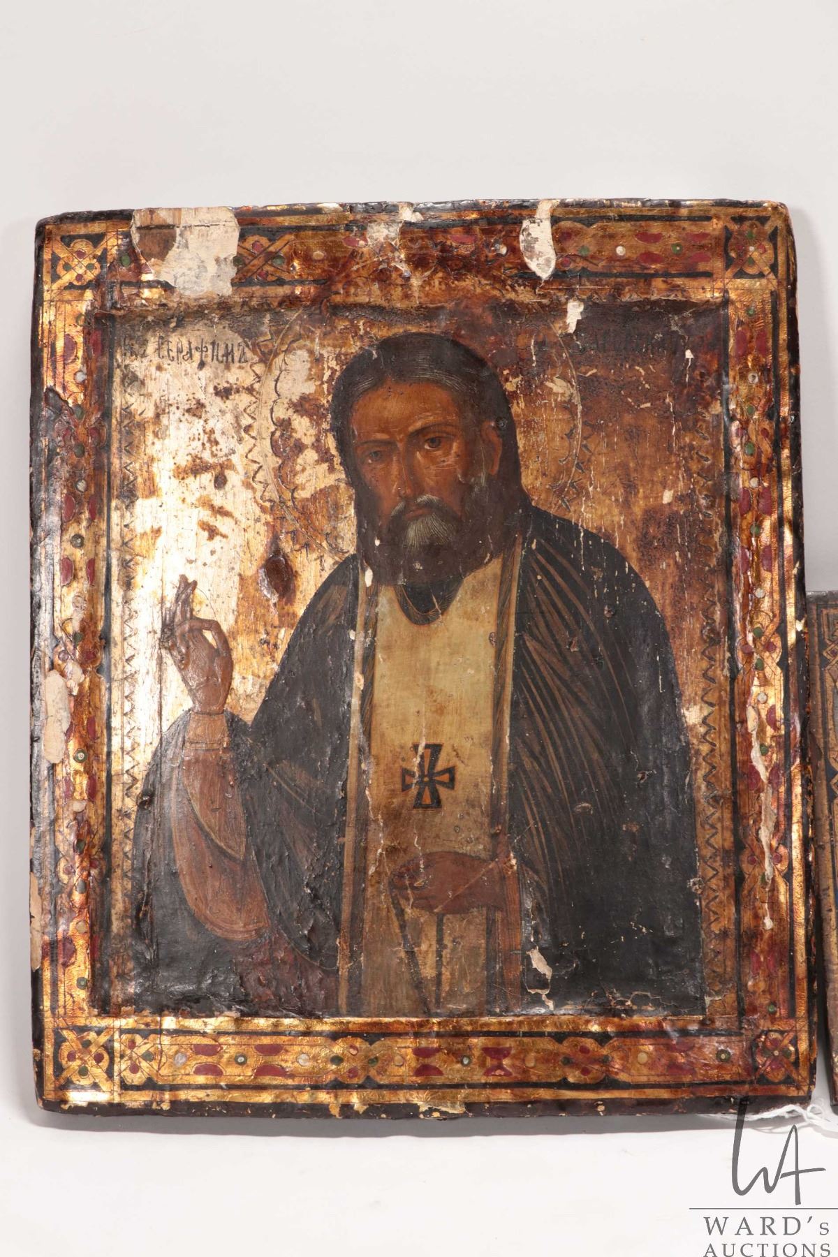 Two antique Russian Orthodox, hand painted on wood panel religious icons including a depiction of Sa