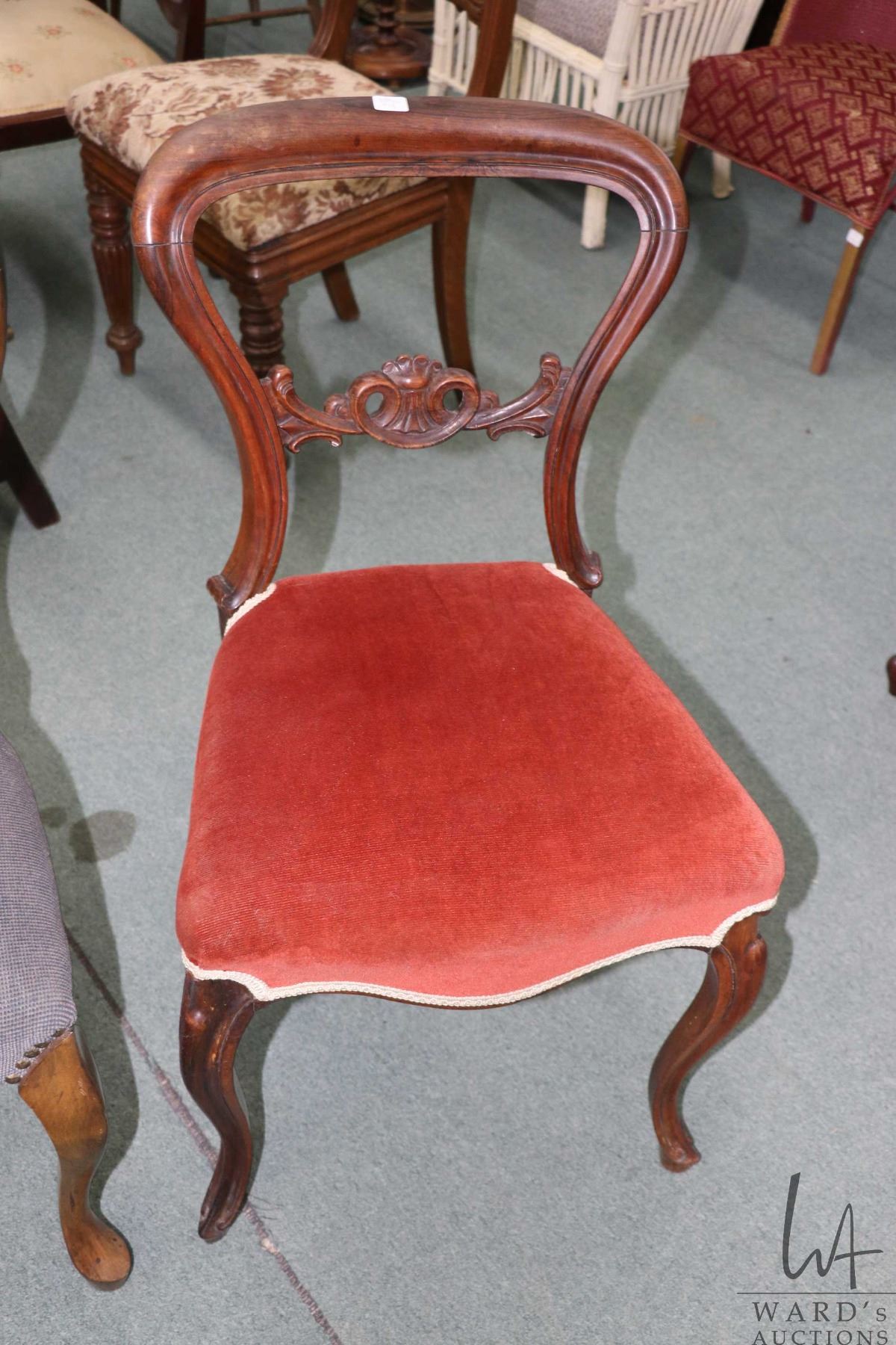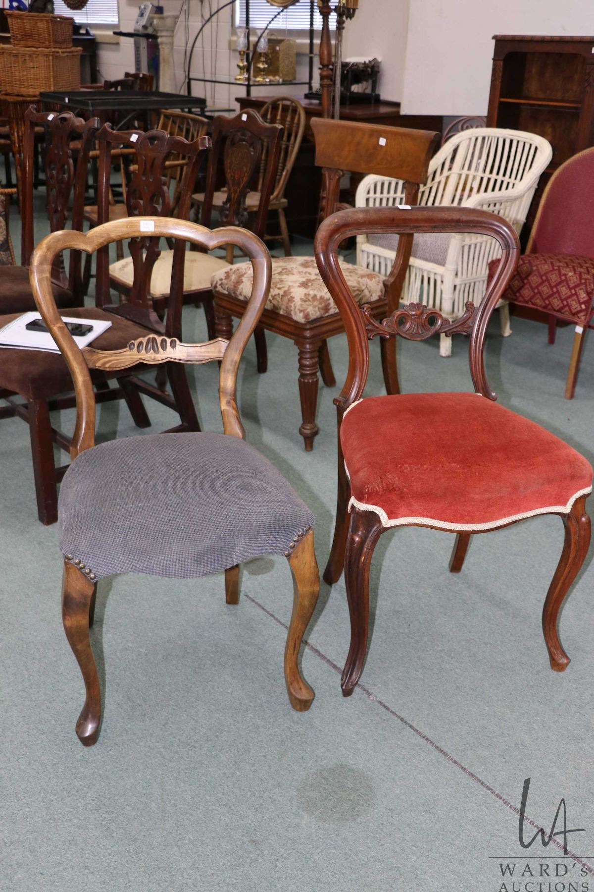 Two antique balloon back chairs, both with curved supports and upholstered seats