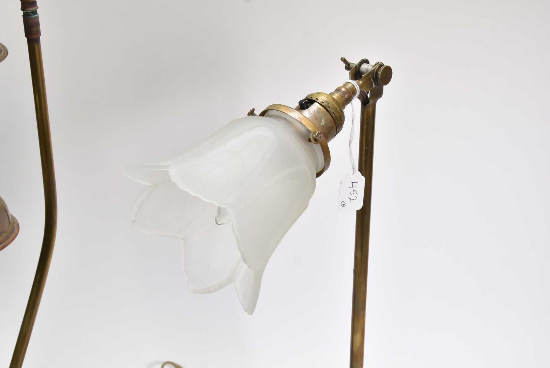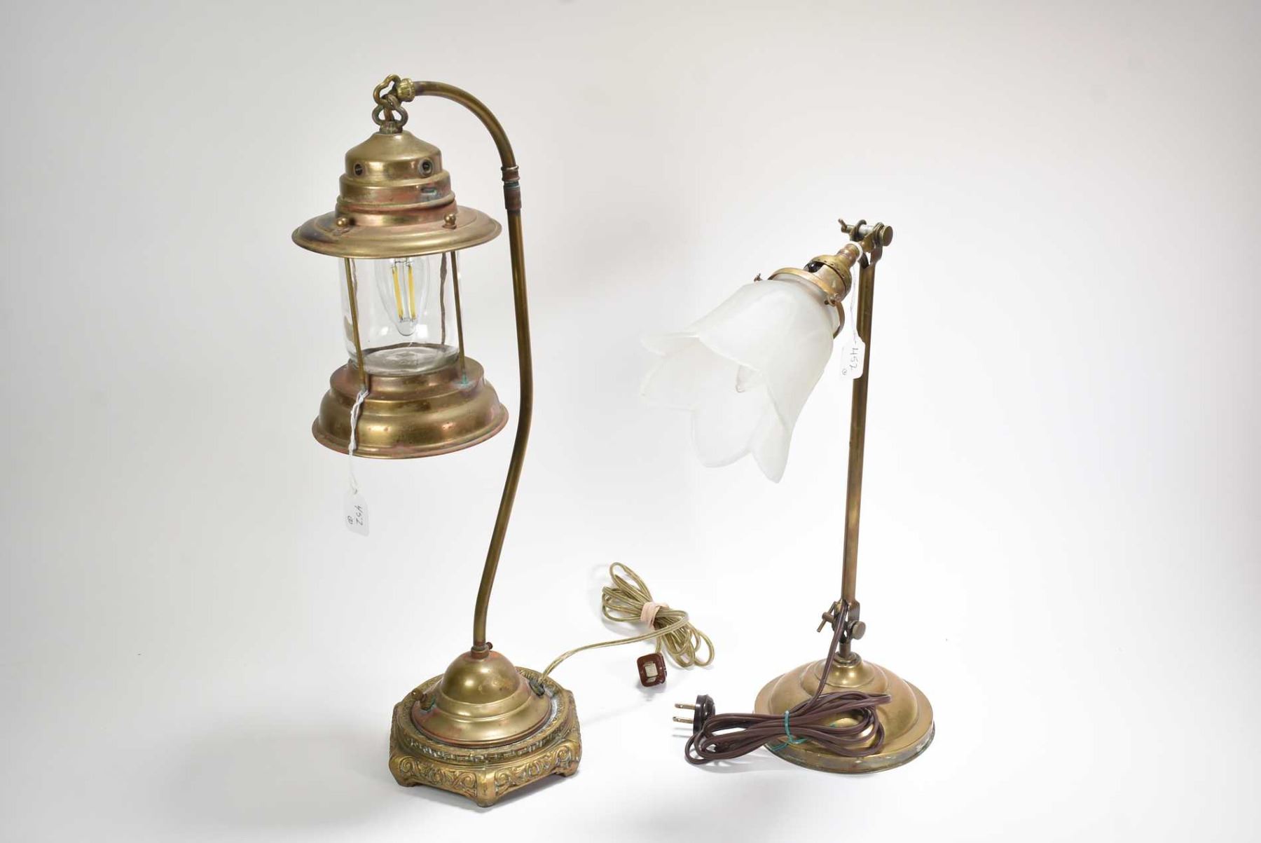 Two antique brass electric lamps including carriage style 20 1/2" and a pivoting desk lamp with satin glass tulip shade