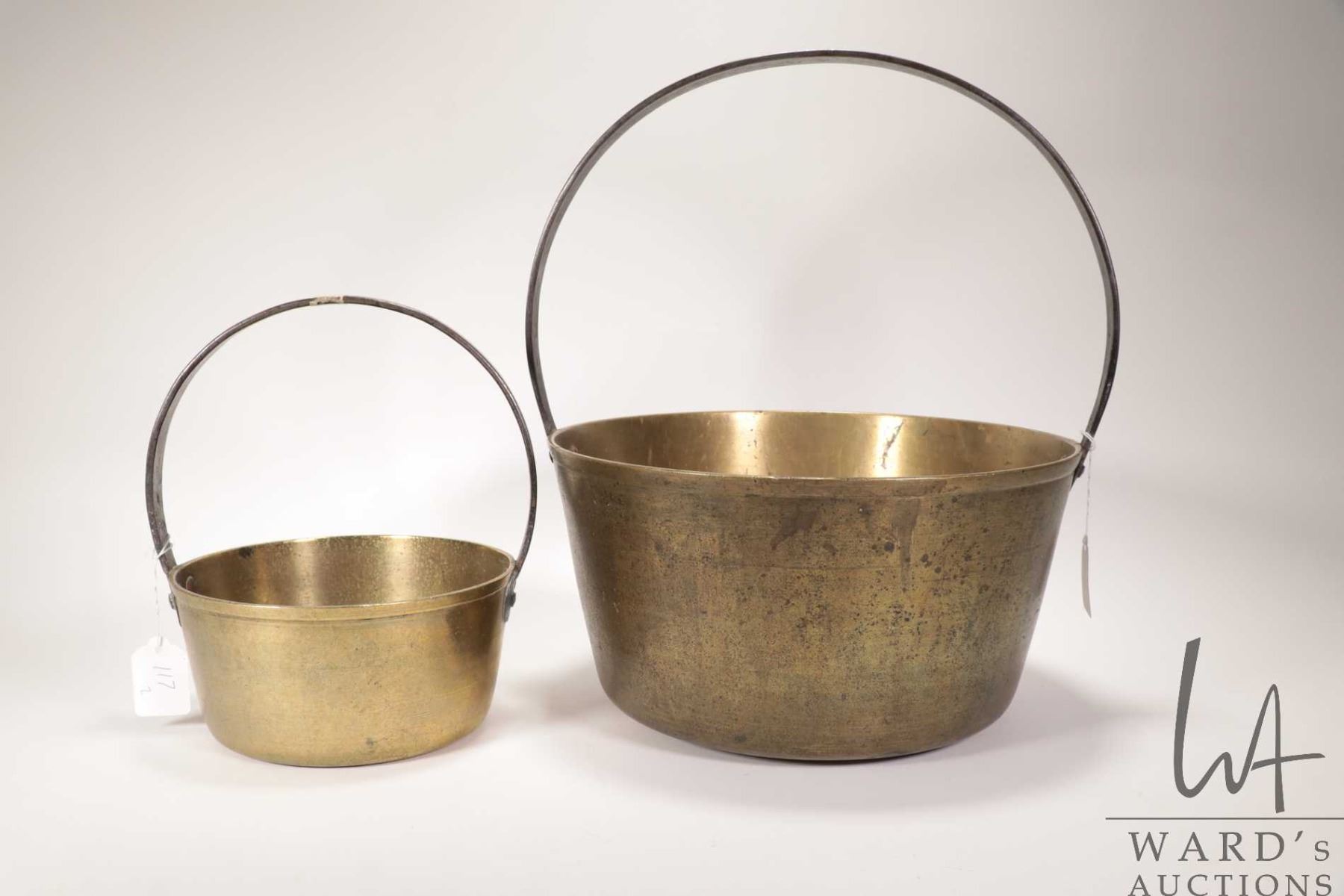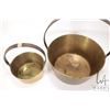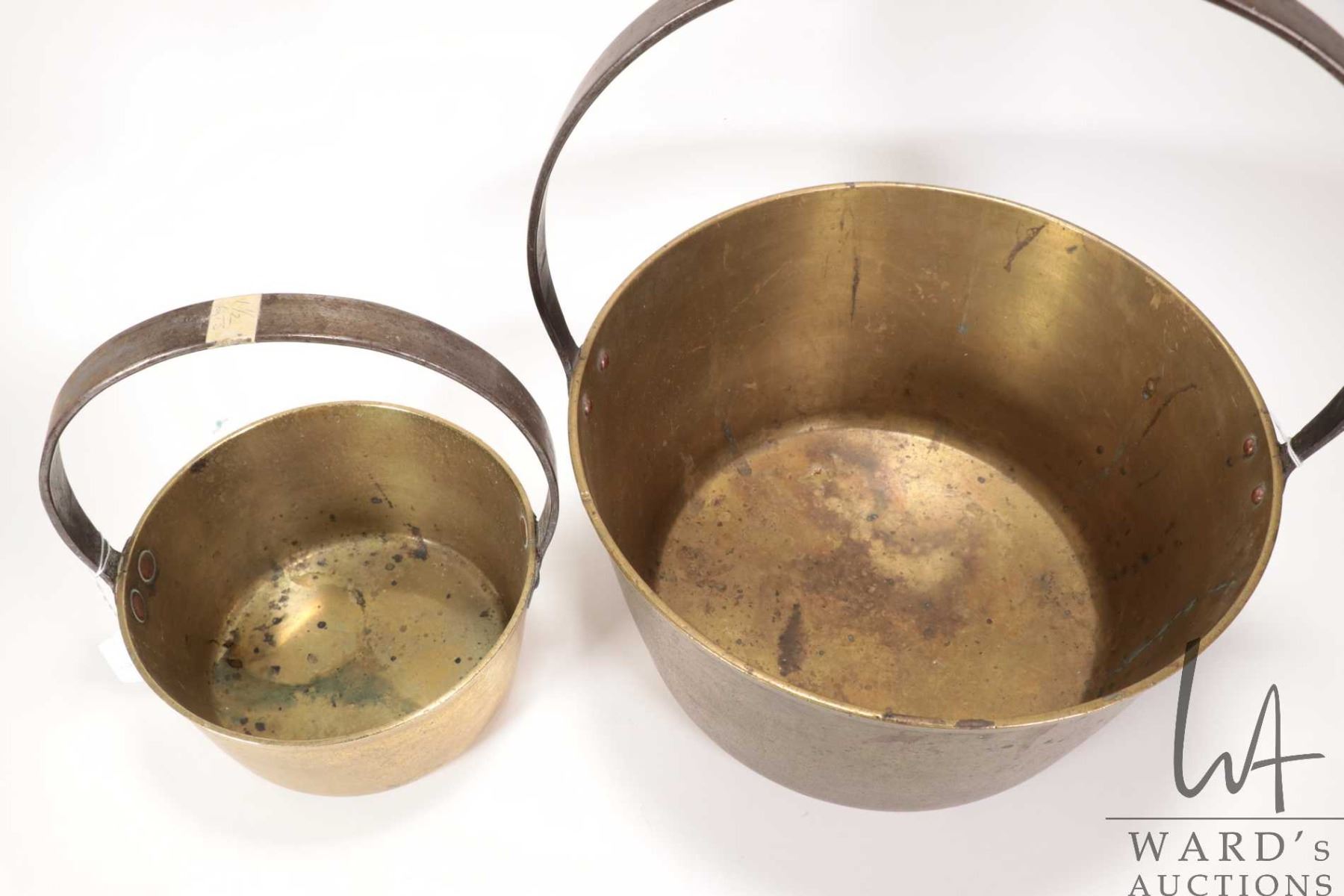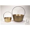 Two antique brass jelly pans including a 1 1/2 quart and a two gallon, both with steel handles
