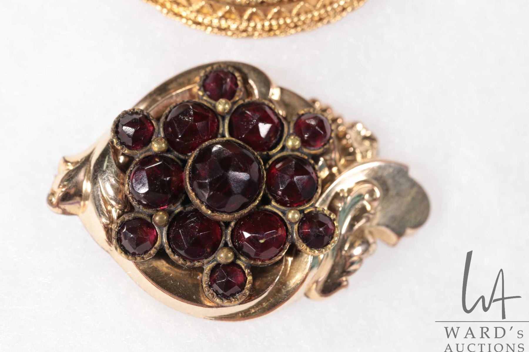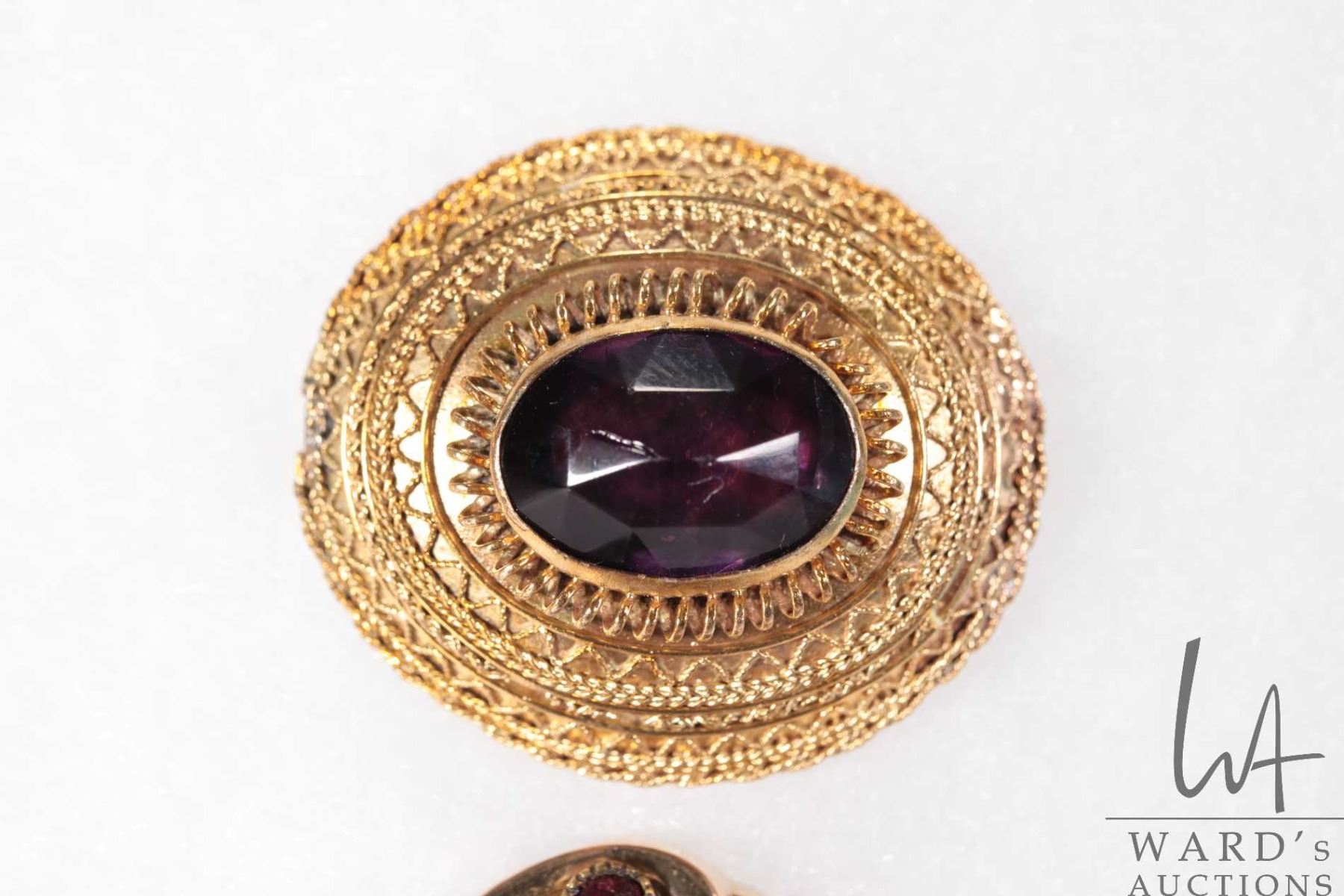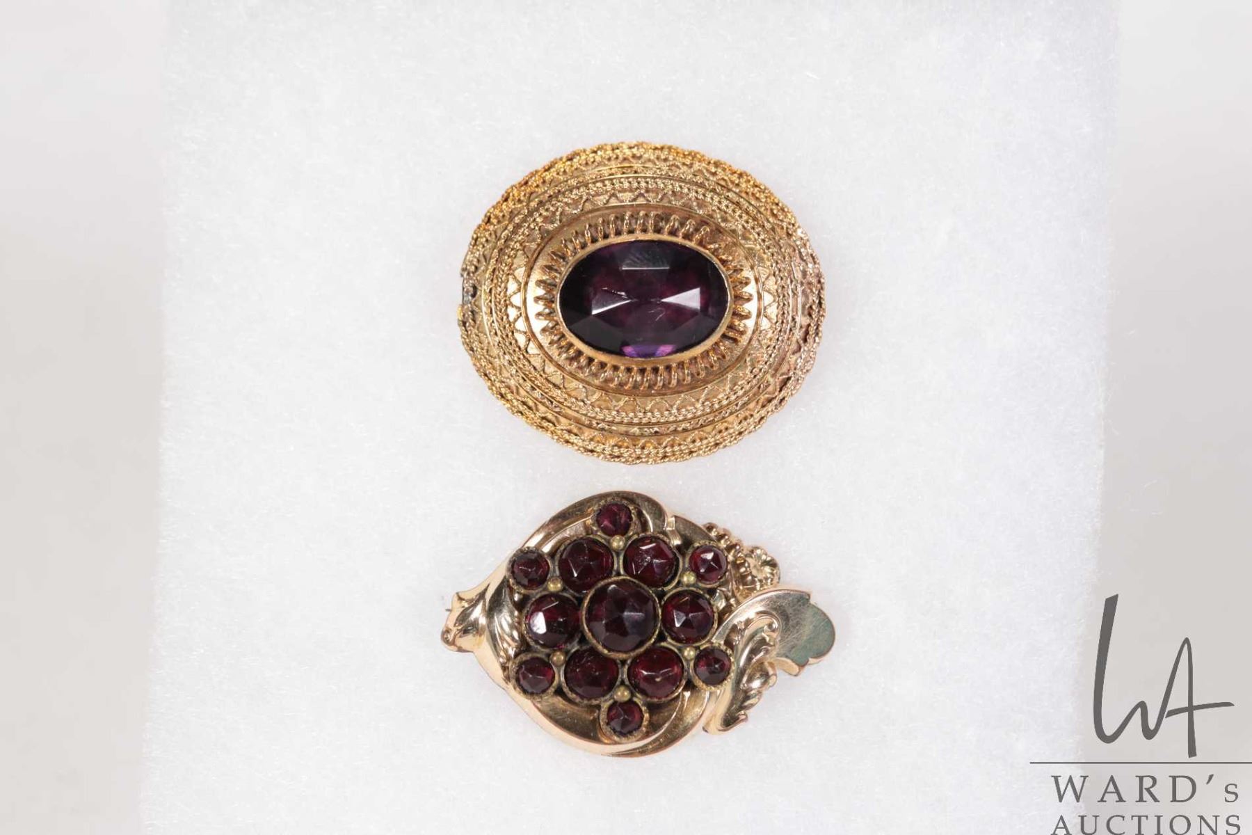 Two antique brooches including garnet set with purple amethyst like gemstone, tests gold