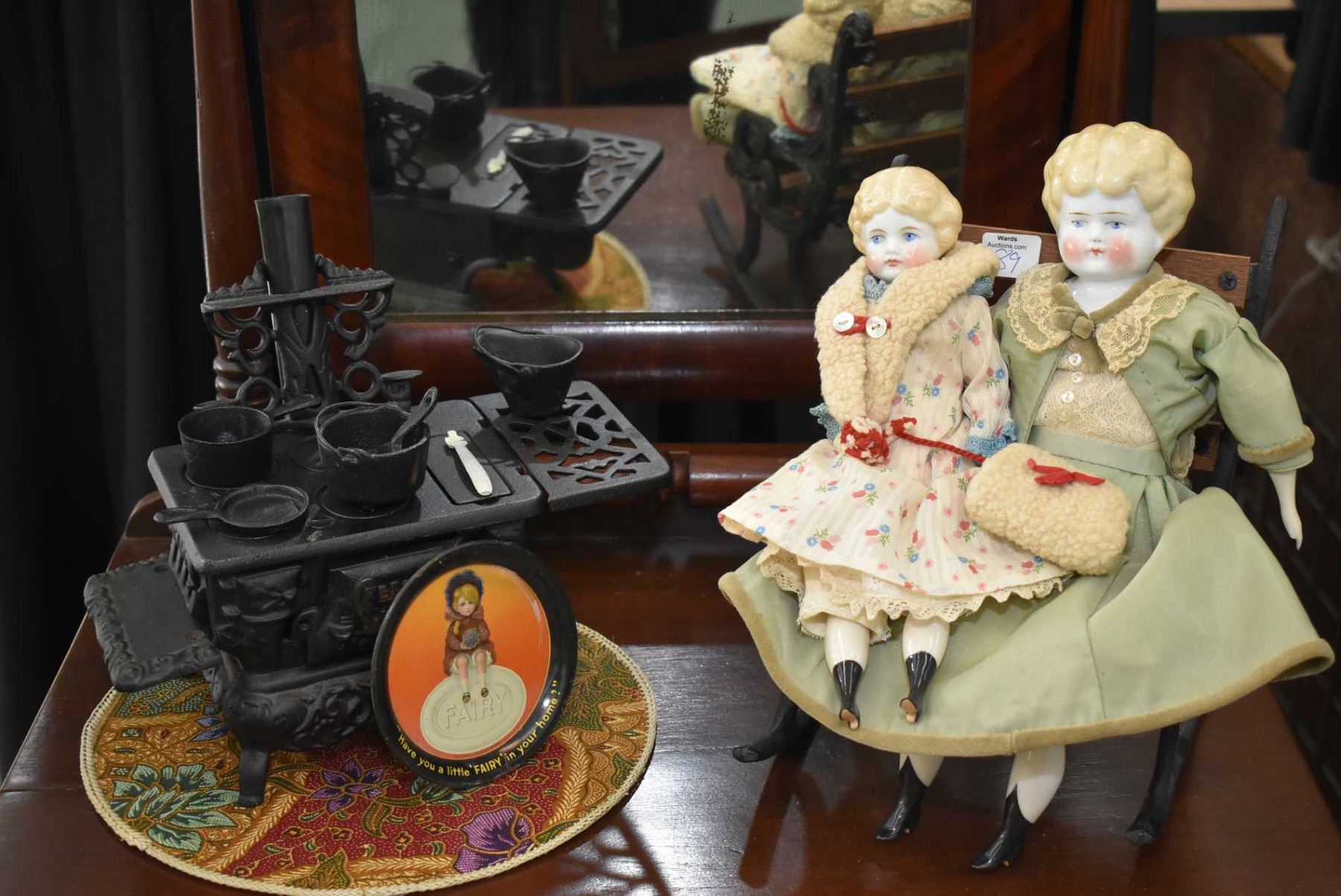 Two antique china head dolls including a 14" and a 10 1/2" on a cast and wooden rocking chair plus a cast iron model of a Crescent wood stove, complete with miniature accessories including pots and pans etc.