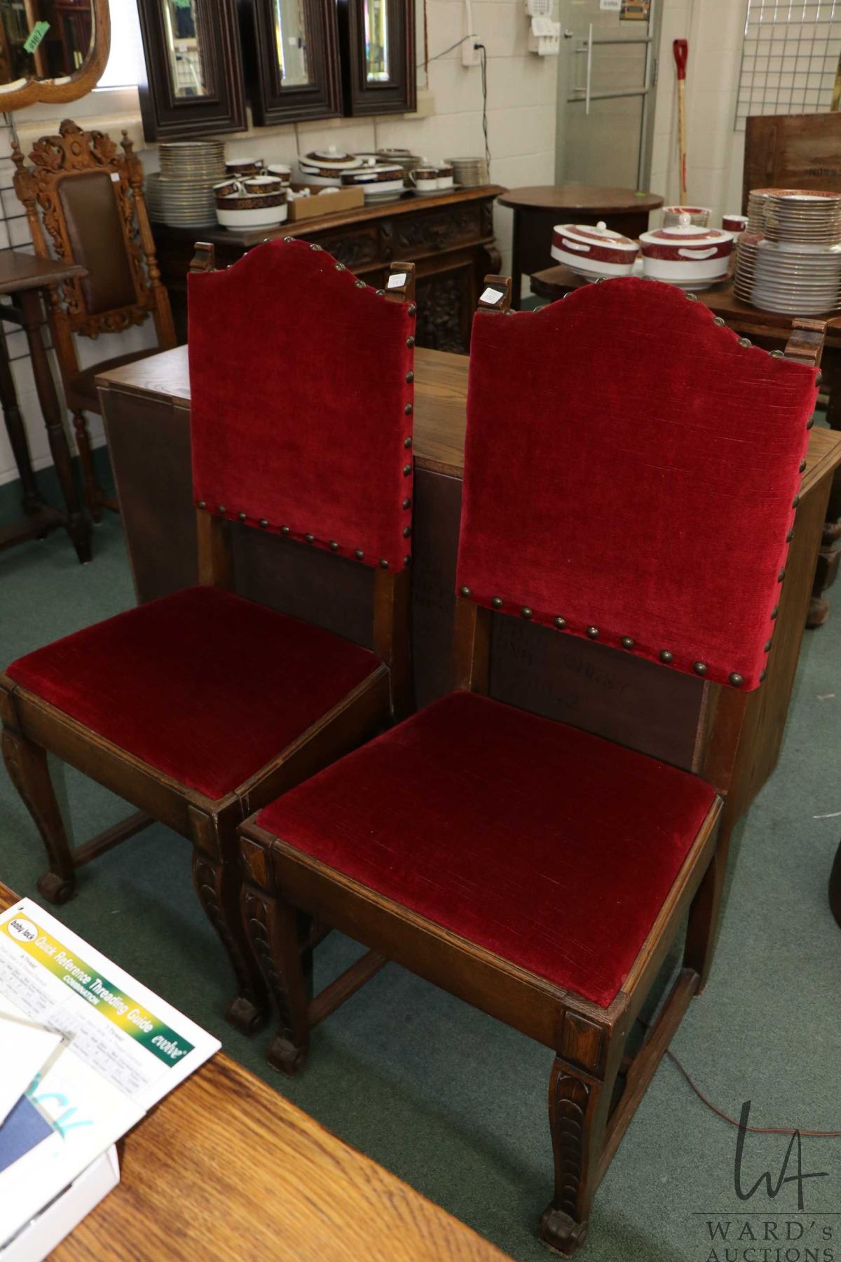 Two antique oak dining chair with decorative carved front supports, velvet upholstered seat and back and nail head decoration