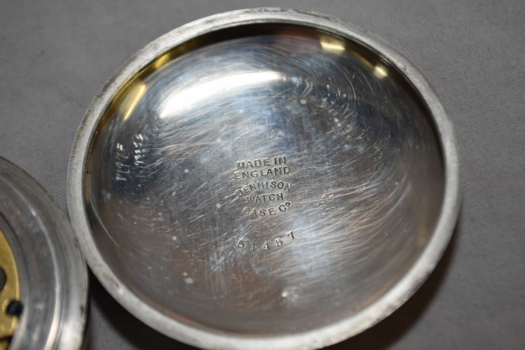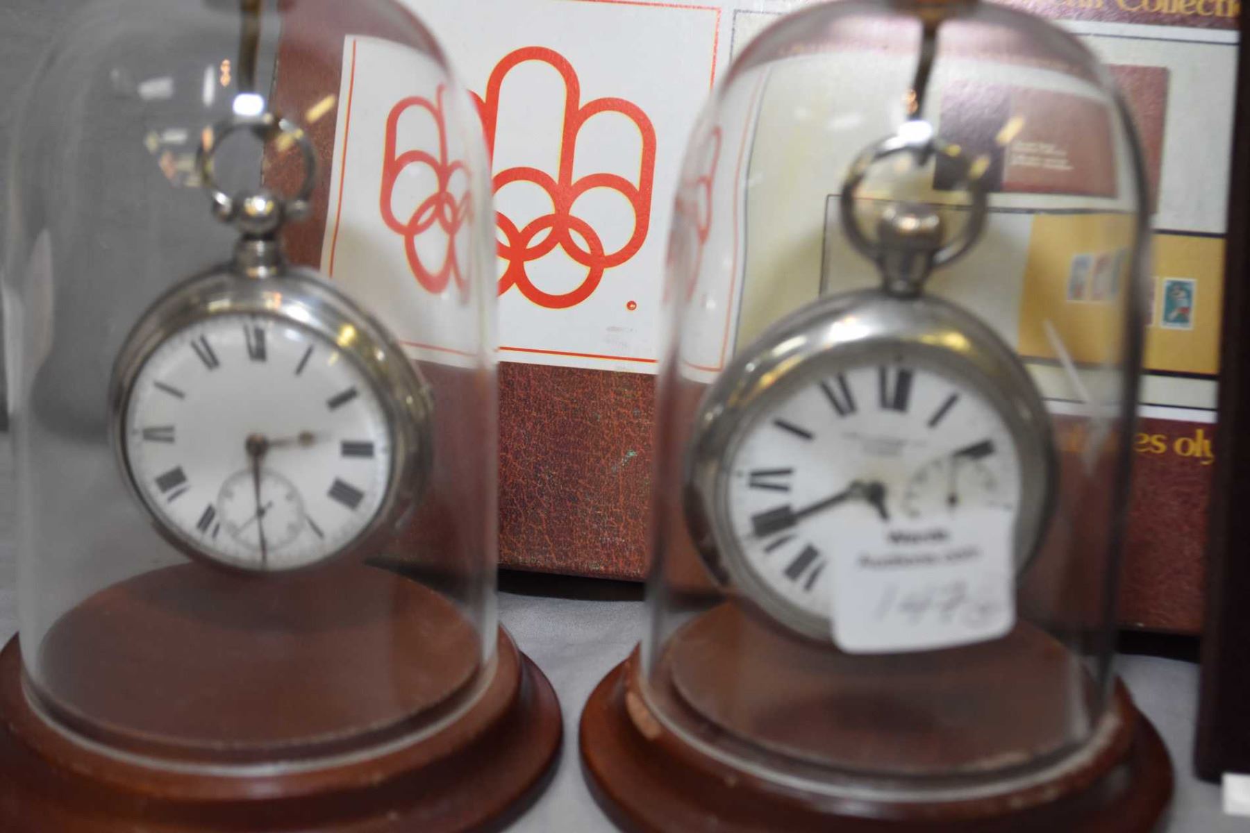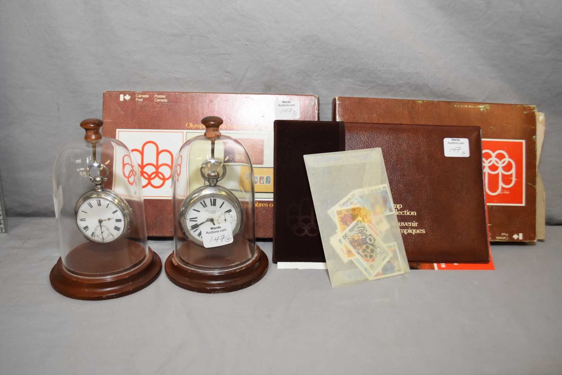 Two antique pocket watches including 7 jewel, WWI Army issue and English made sterling key wind watch in English watch outer case holder and two 1976 Olympic Collector stamp sets