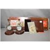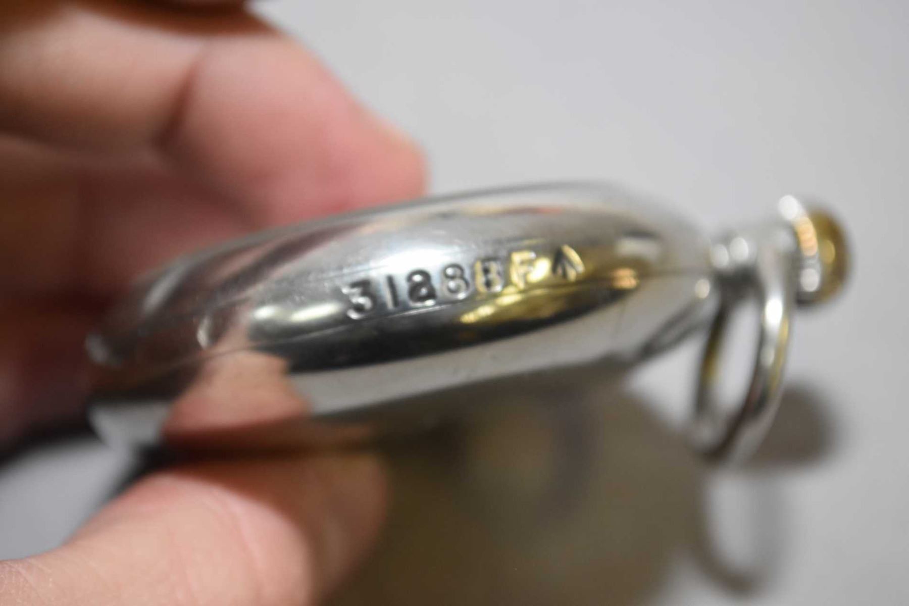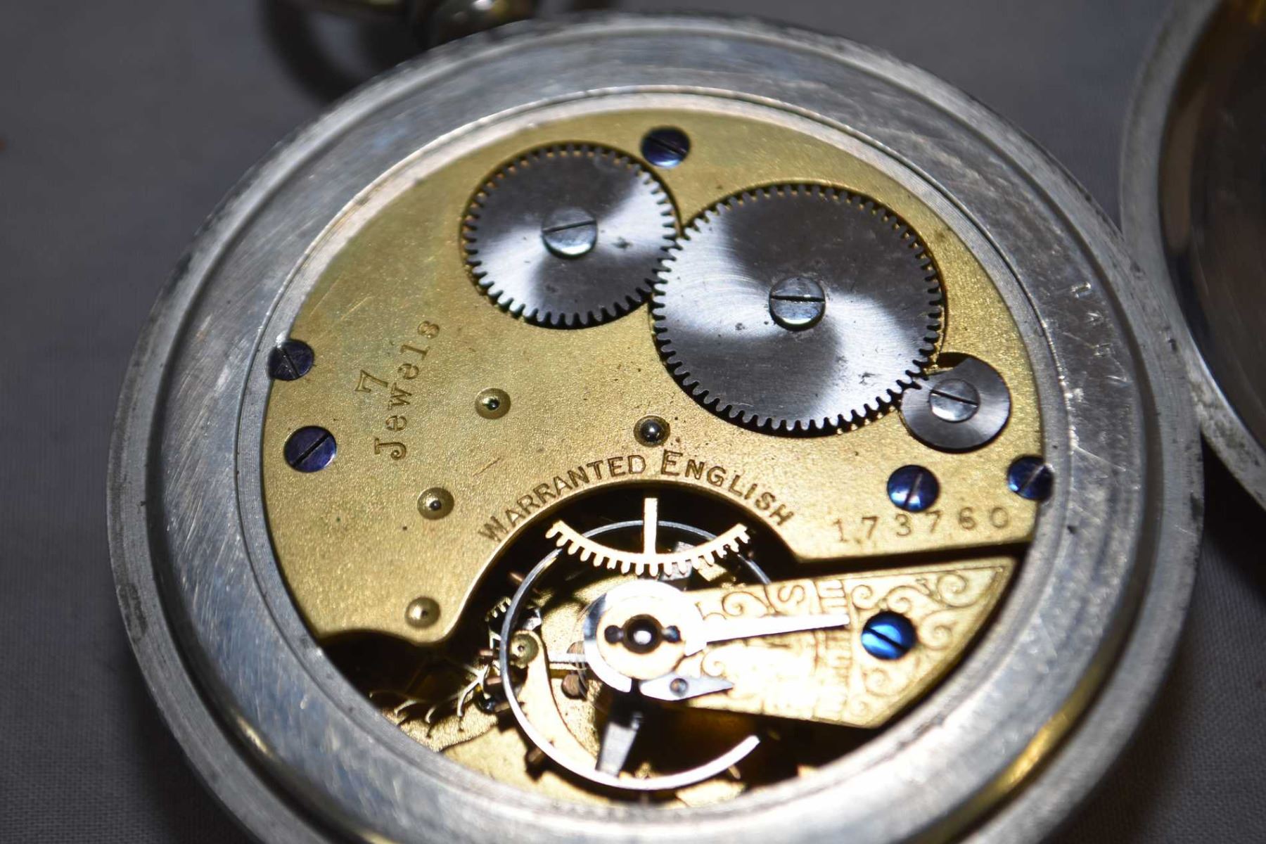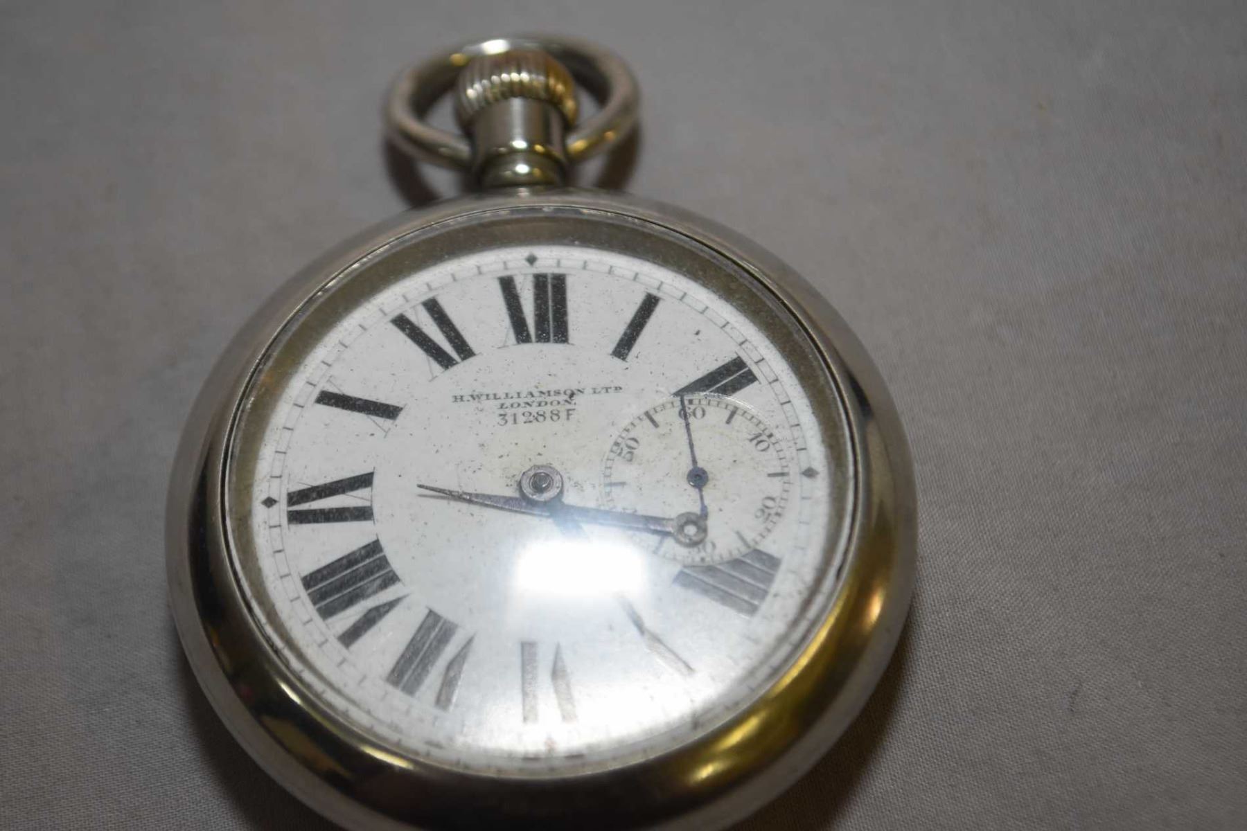 Two antique pocket watches including 7 jewel, WWI Army issue and English made sterling key wind watch in English watch outer case holder and two 1976 Olympic Collector stamp sets