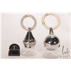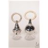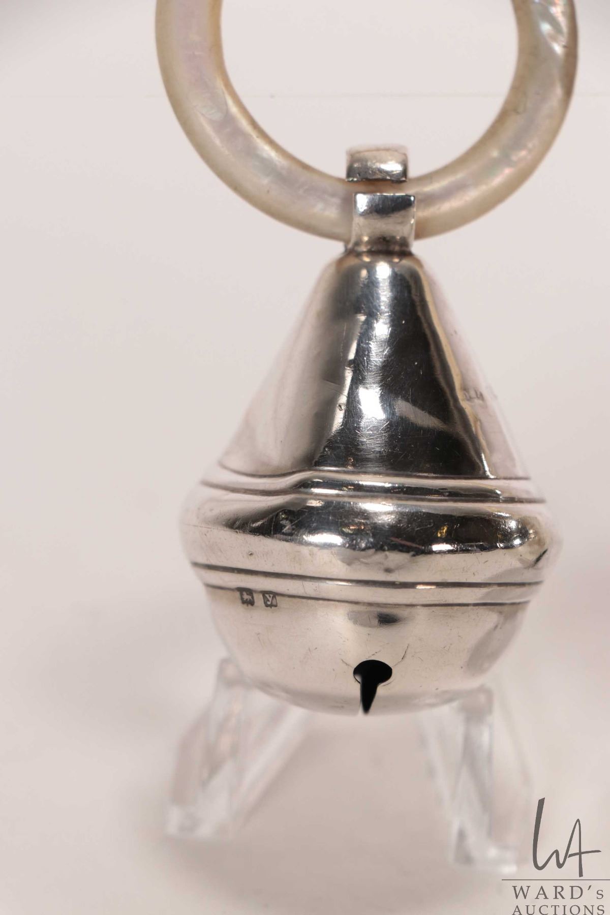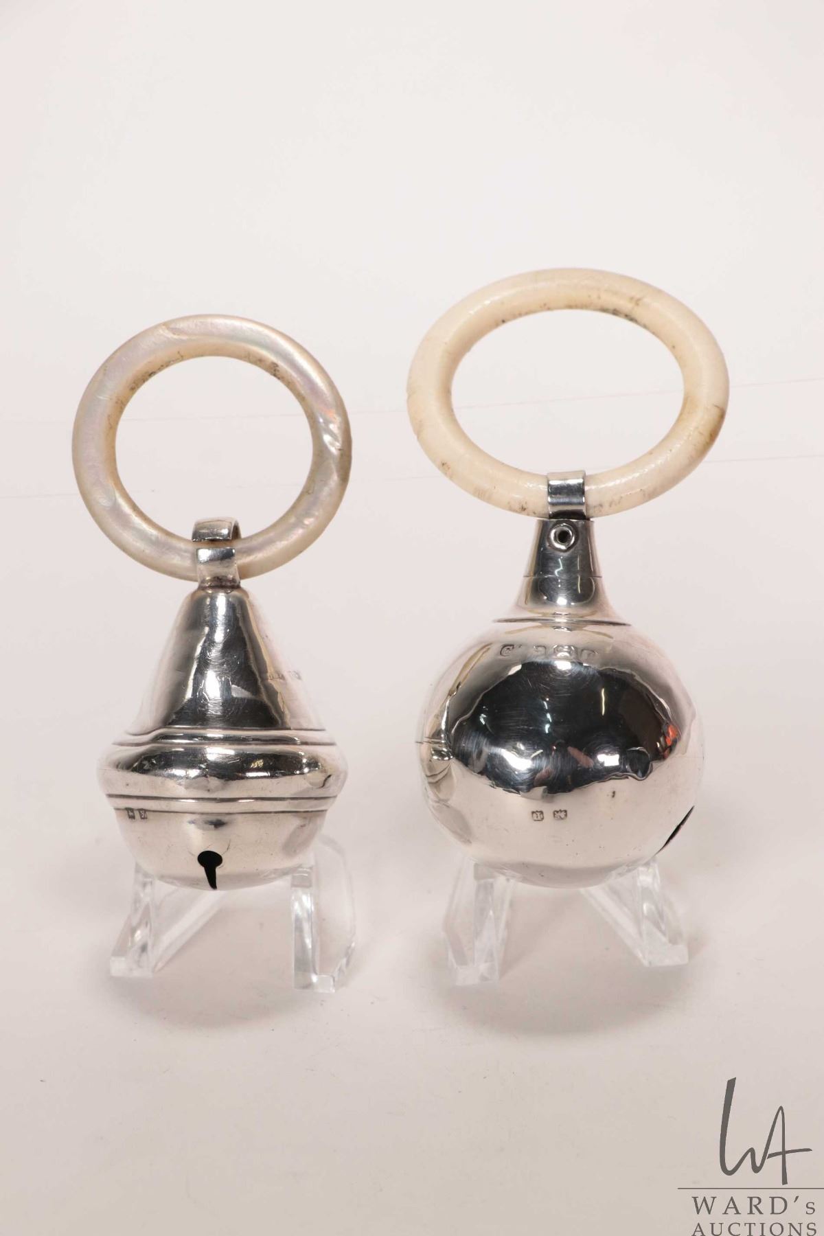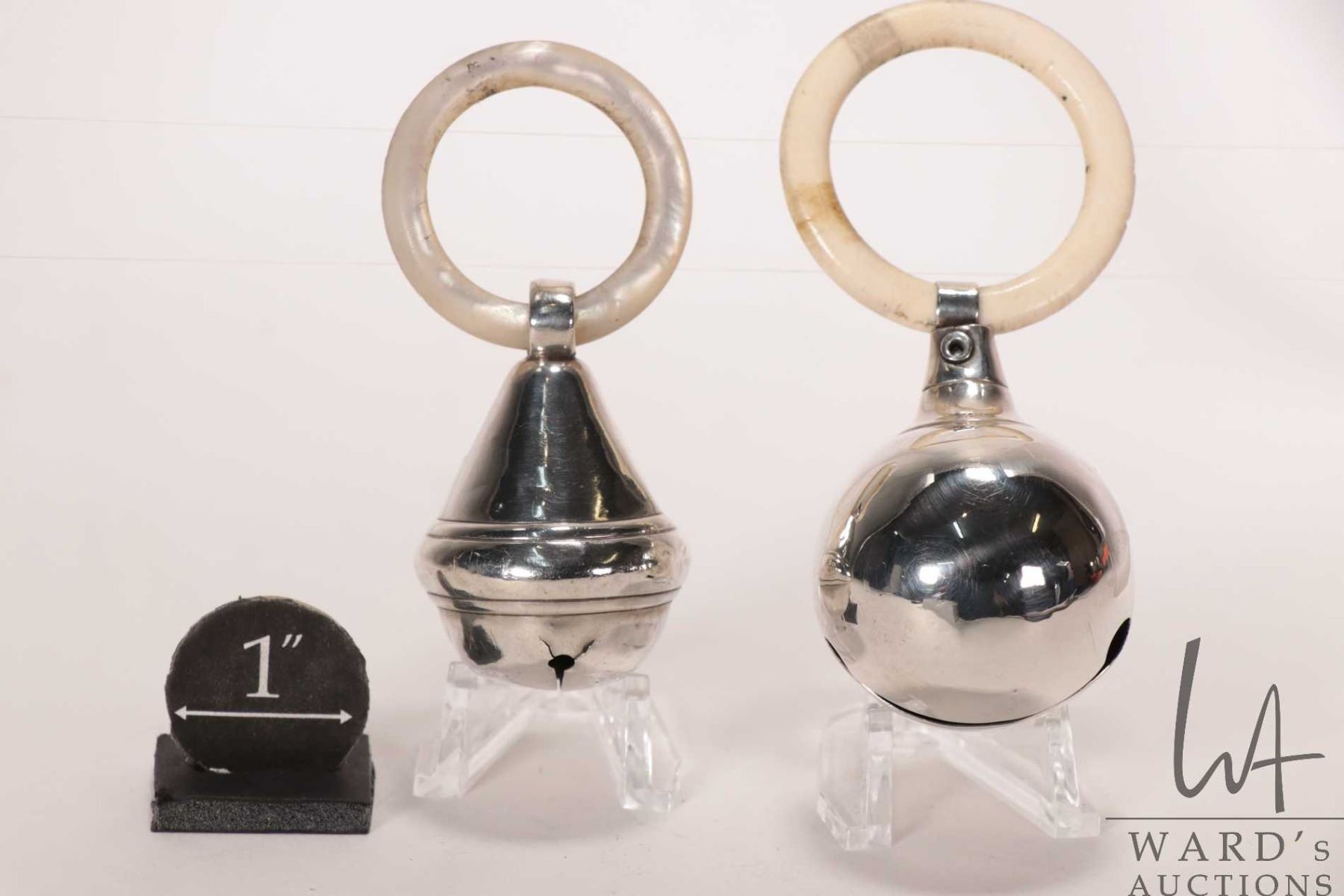 Two antique sterling silver baby "bell" rattles including one with sterling silver ring and one with mother-of-pearl ring. Both marked with British sterling hallmarks Note: Canadian buyers only. Cannot ship outside of Canada