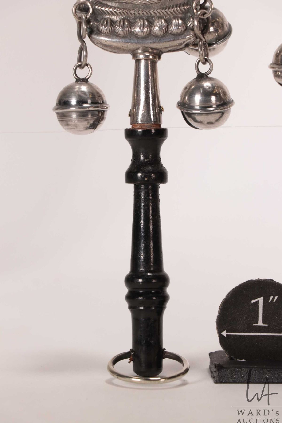 Two antique/ vintage sterling silver cat motif baby rattles with bells and whistle, both with eboniz