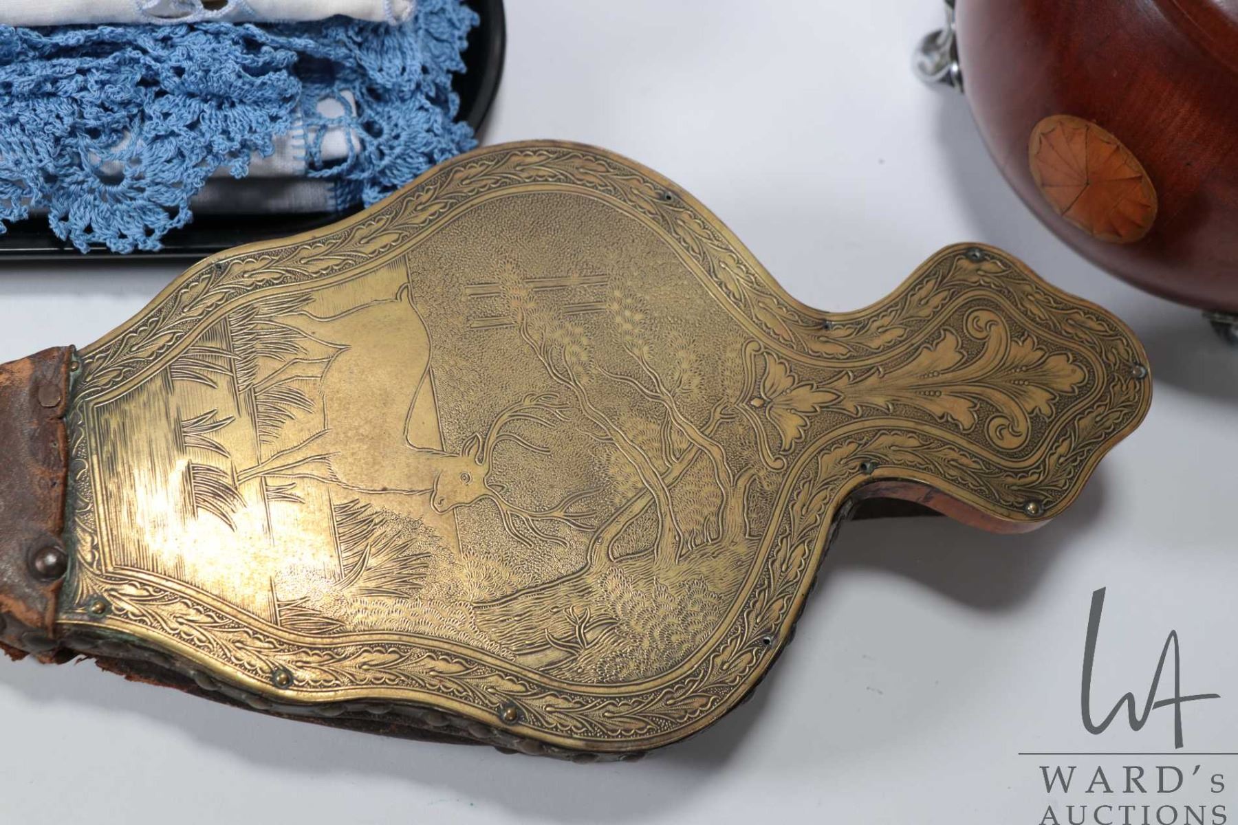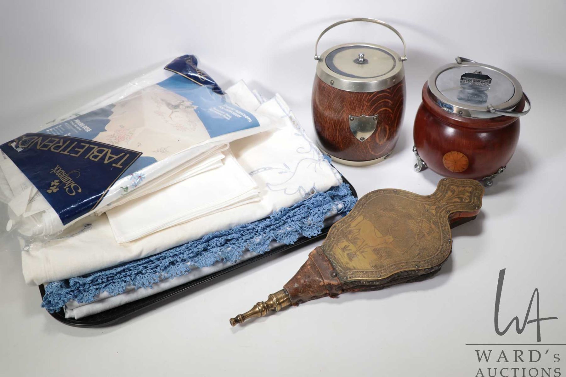 Two antique wooden biscuit barrels including one with satin wood inlay and an oak, both with plated collars and lids plus and small antique leather bellows with engraved brass stag motif panel and a selection of table linens including hand embroidered