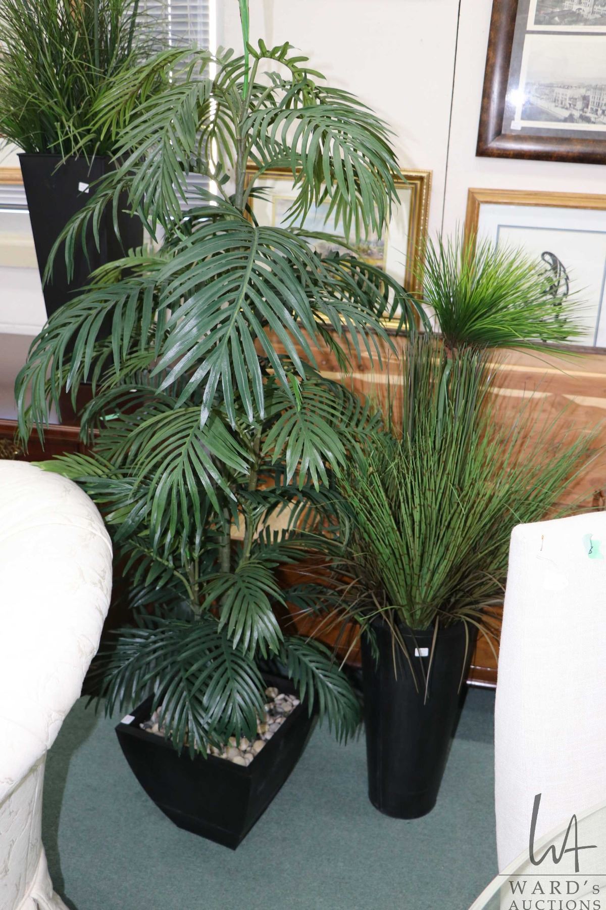 Two artificial plants in pots, overall heights are 65" and one 52"