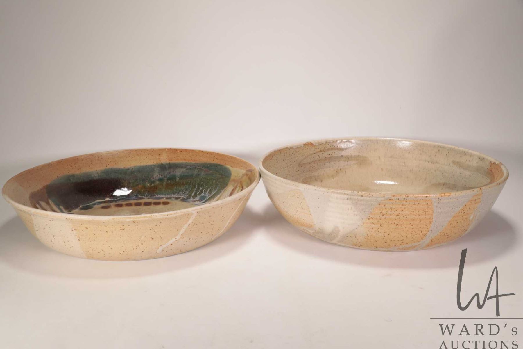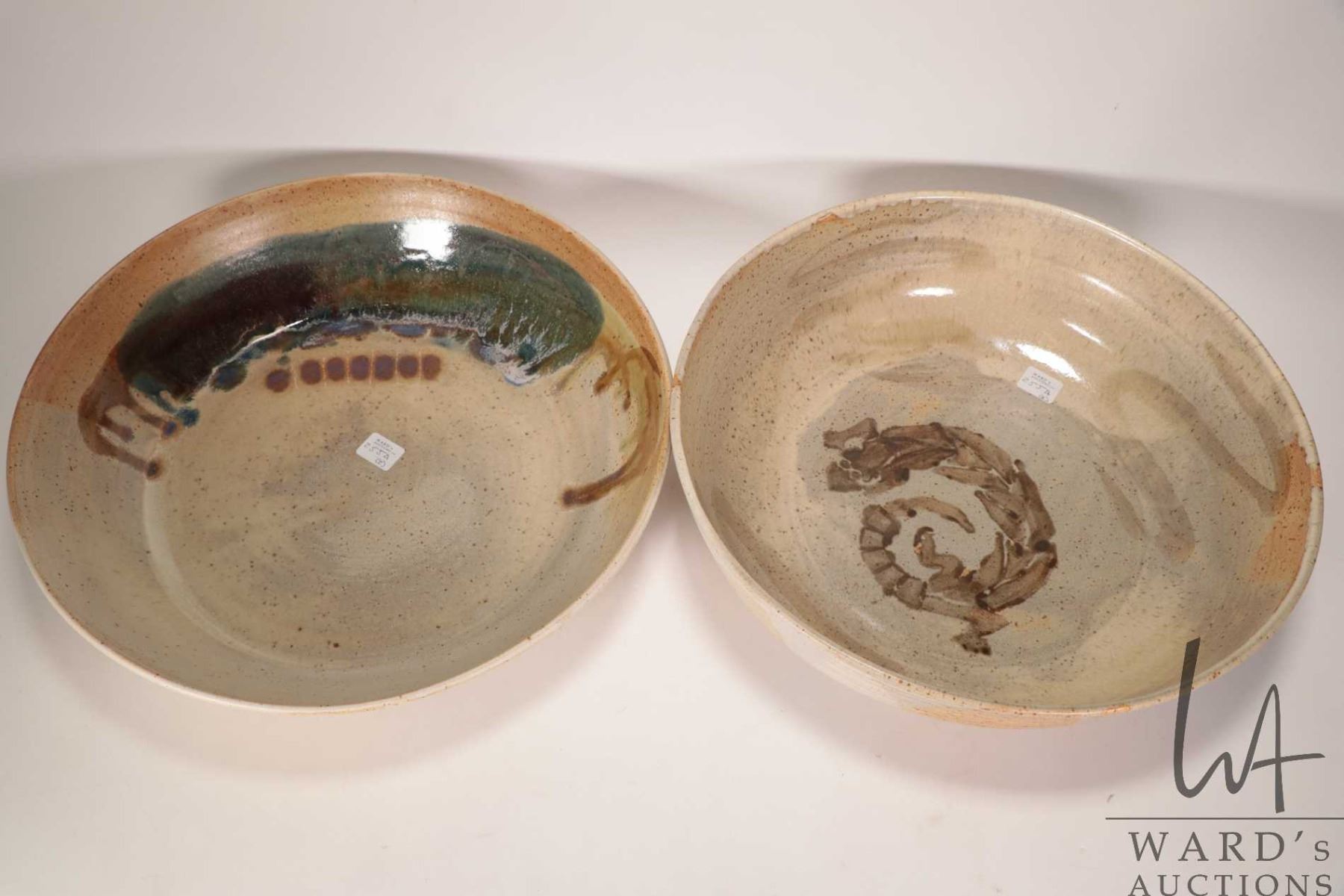 Two artisan made pottery bowls including 14 3/4"" and 14" diameter by L. Kosteriva ( Creech' s Lakeland Pottery Guide)