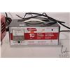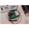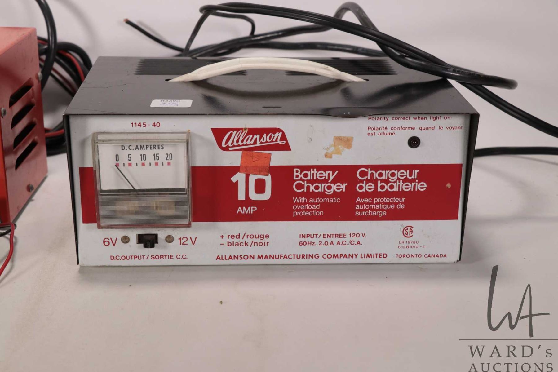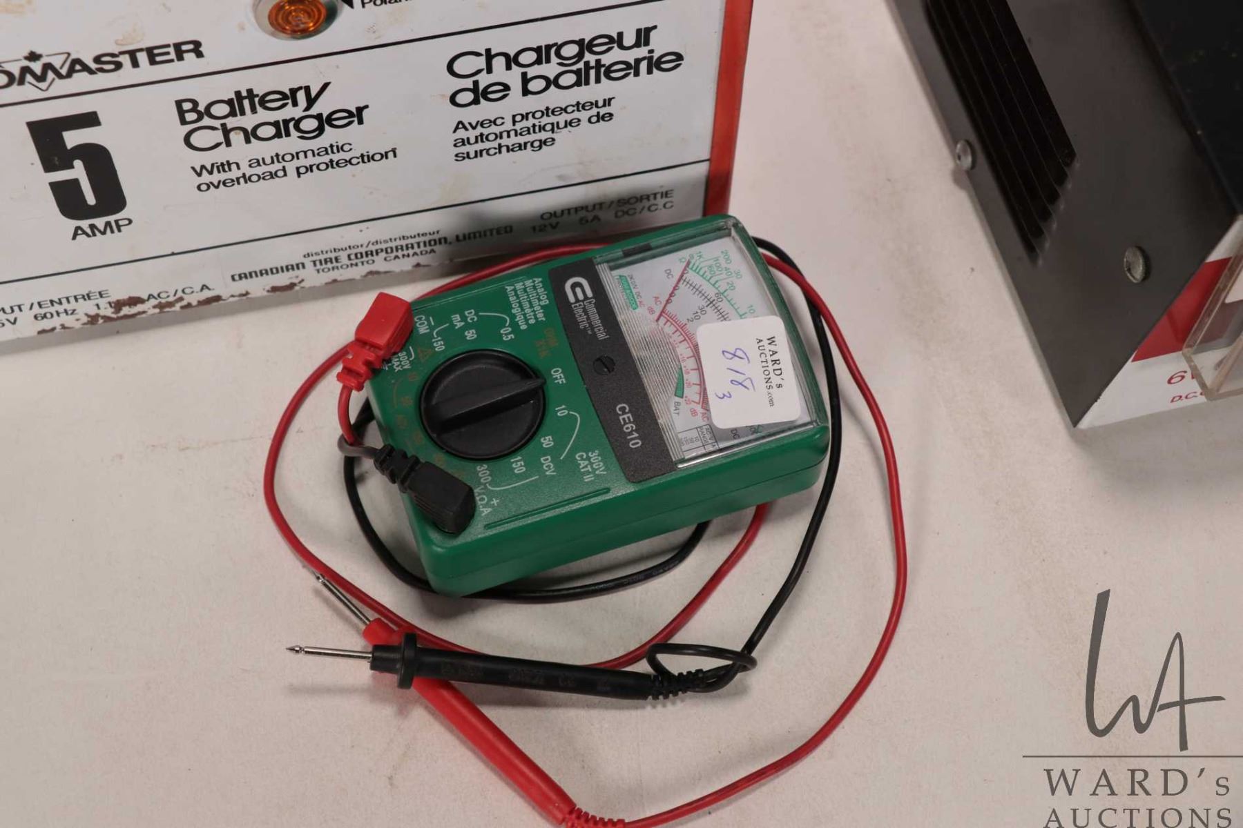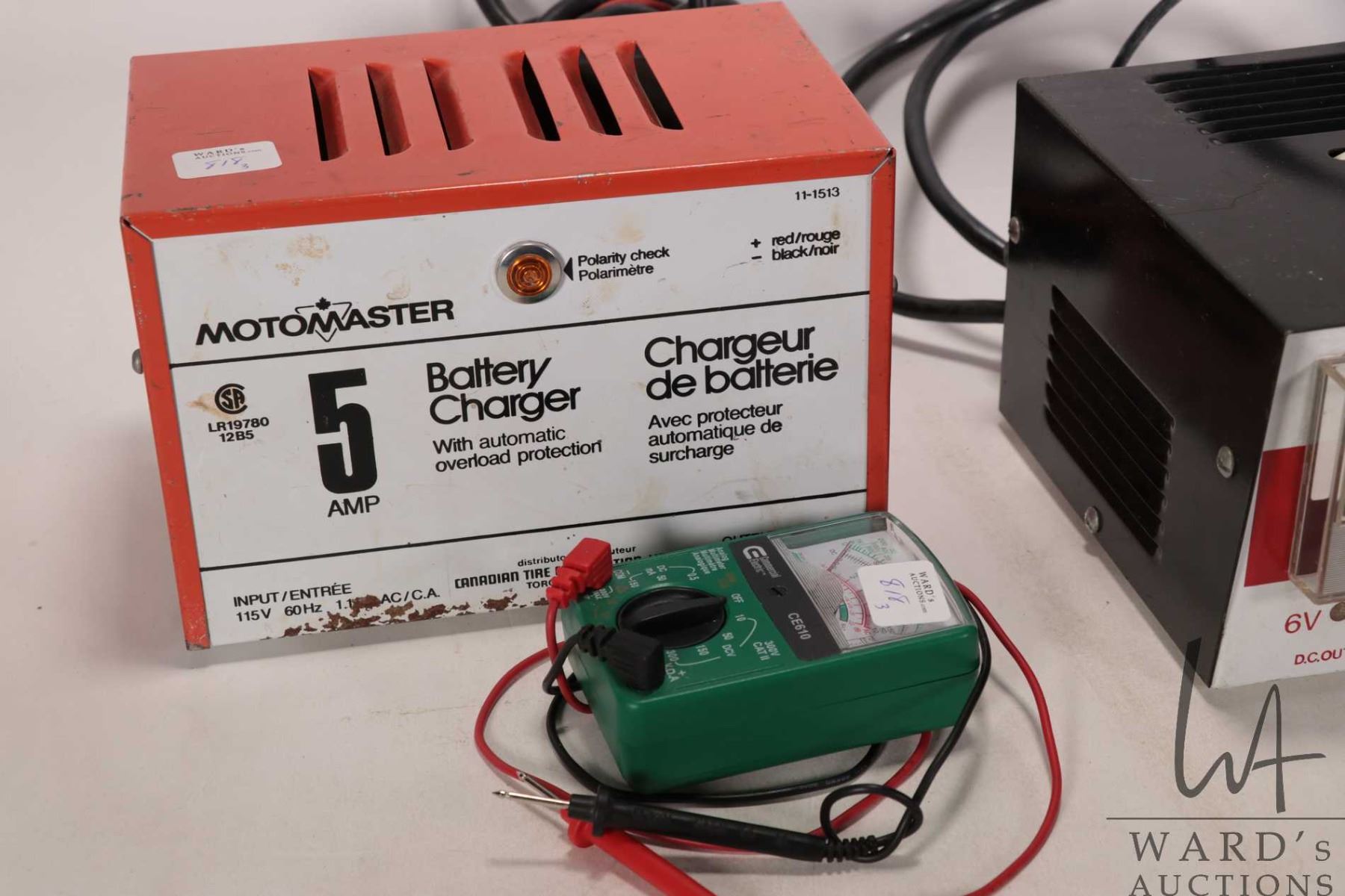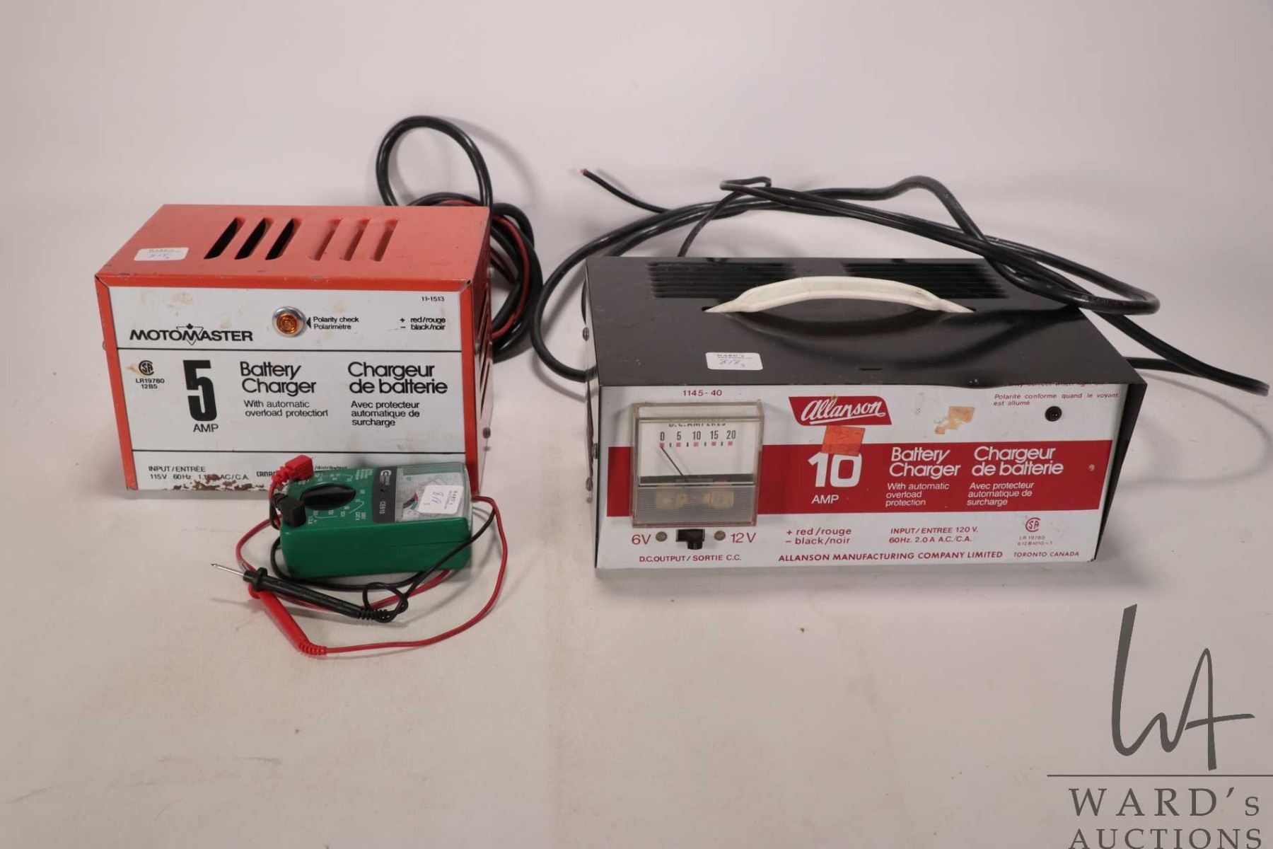 Two battery chargers including a Motomaster 5 amp battery charger and Allanson 10 amp battery charger plus a small analog tester, all working at time of cataloguing