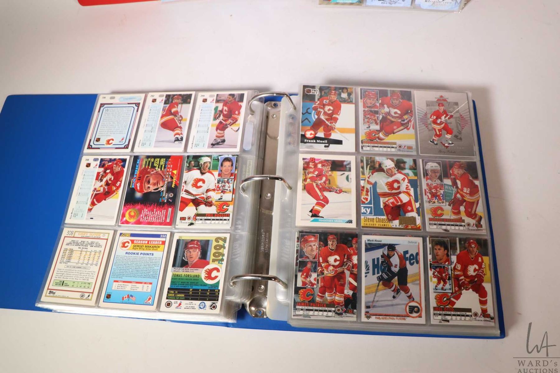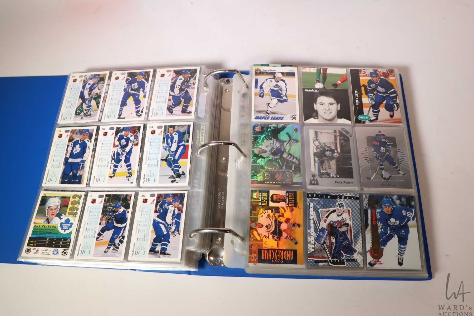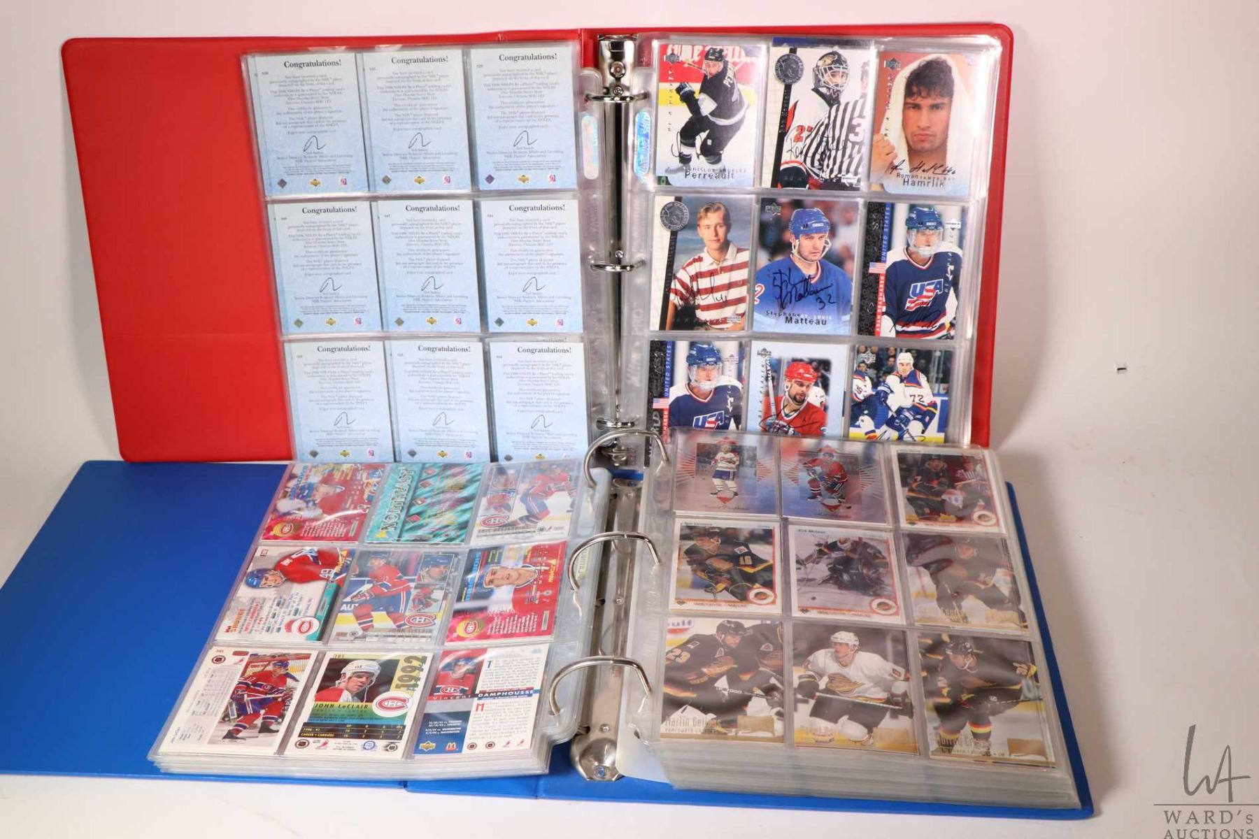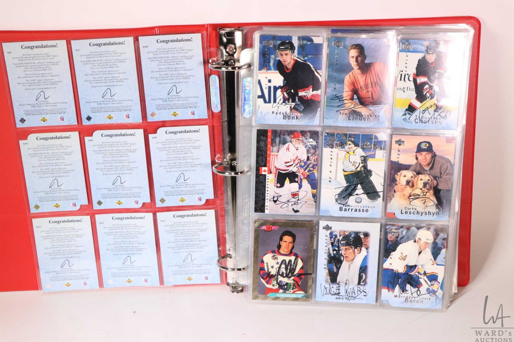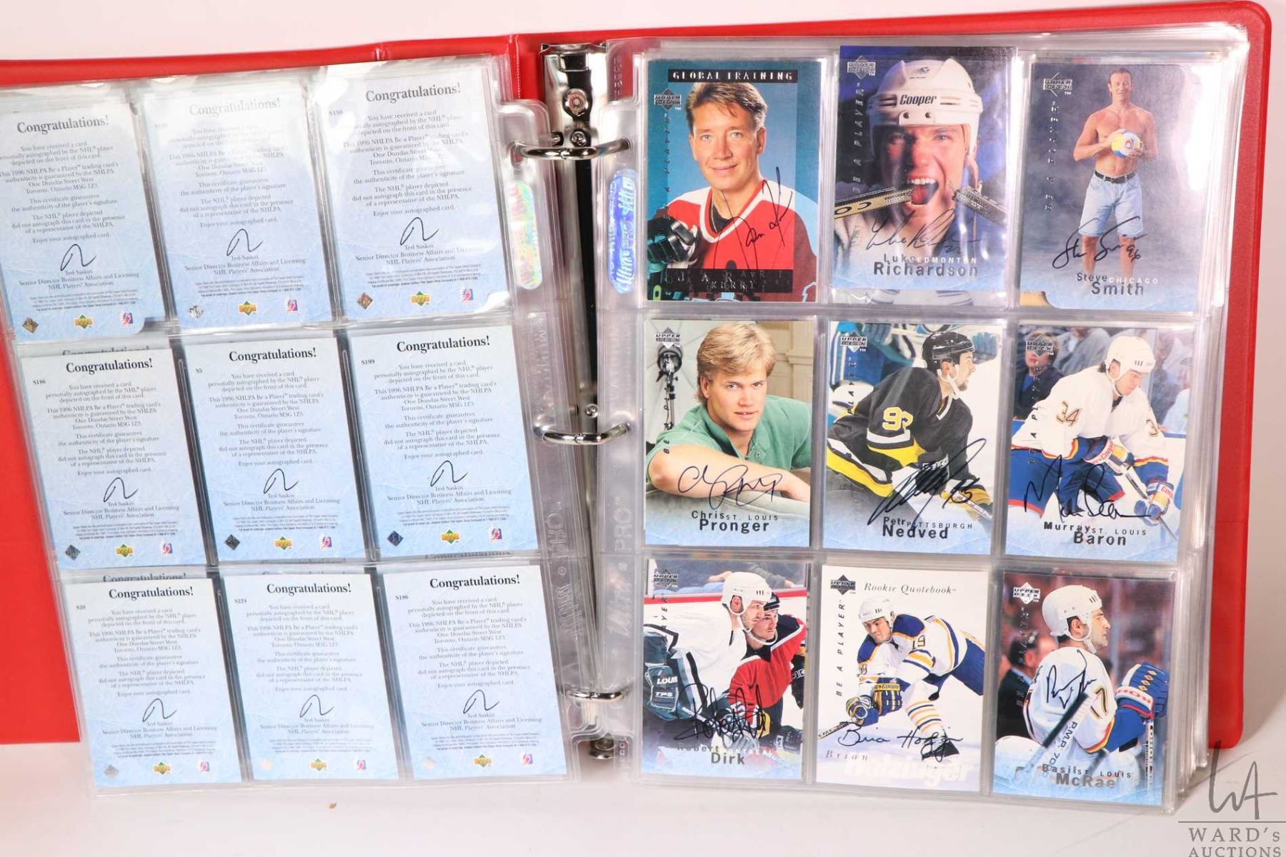 Two binders of NHL hockey cards including one binder containing 101 hand signed Upper Deck cards from 1996, assorted players and assorted teams plus 170 collectible hockey cards Fleer Ultra, Upper Deck, O-Pee-Chee, Pinacle etc. and the second binder containing approximately 470 NHL trading cards, various makers, various teams mostly 1980/90's