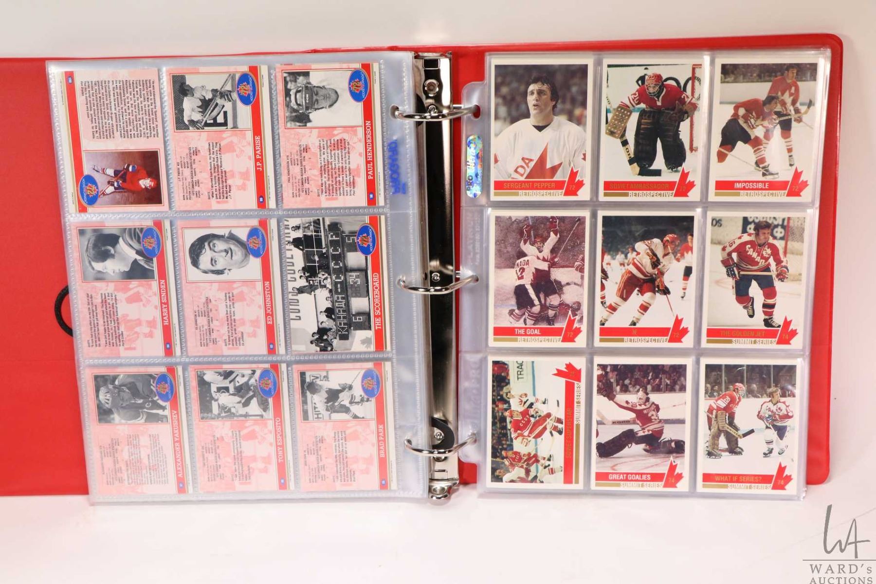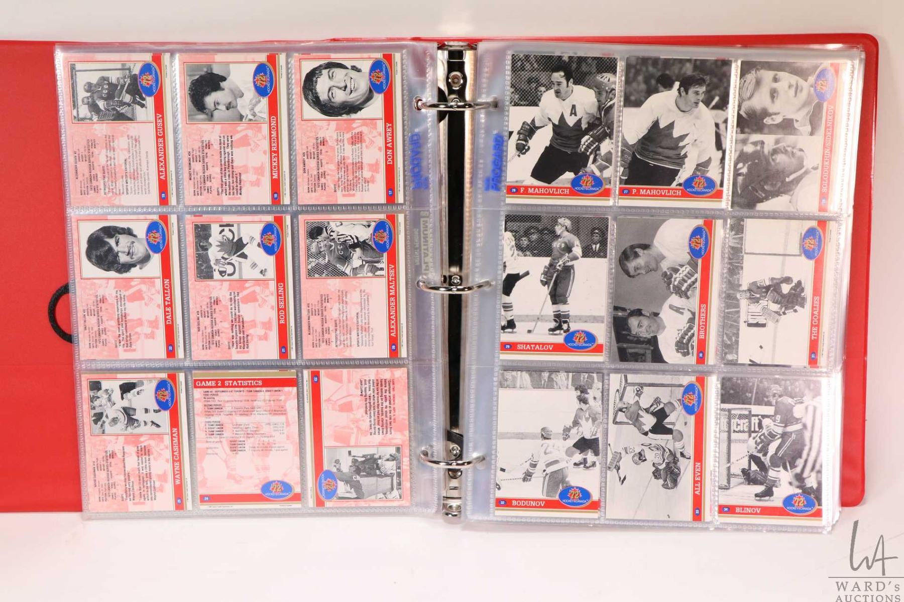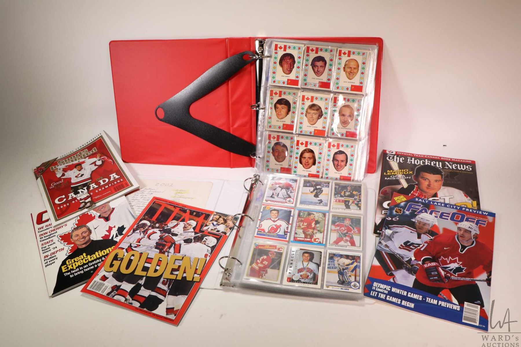 Two binders of hockey cards including a binder containing 22 count of 1972 Team Canada collector cards and 208 assorted promotional photo cards dating 1972 and 1976 Team Canada cards plus a binder containing 175 count of 2002 Olympic Team Canada hockey team cards plus five Team Canada Magazine, assorted newer dates