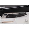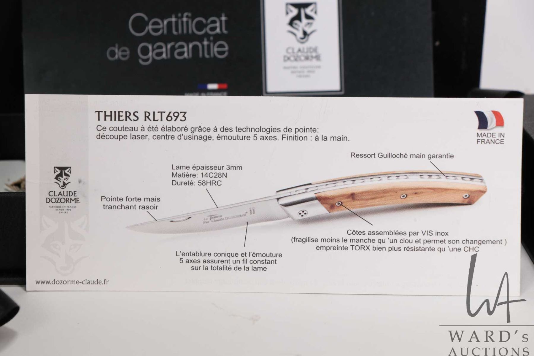 Two boxed Claude Dozorme folding knives. Appear new in package