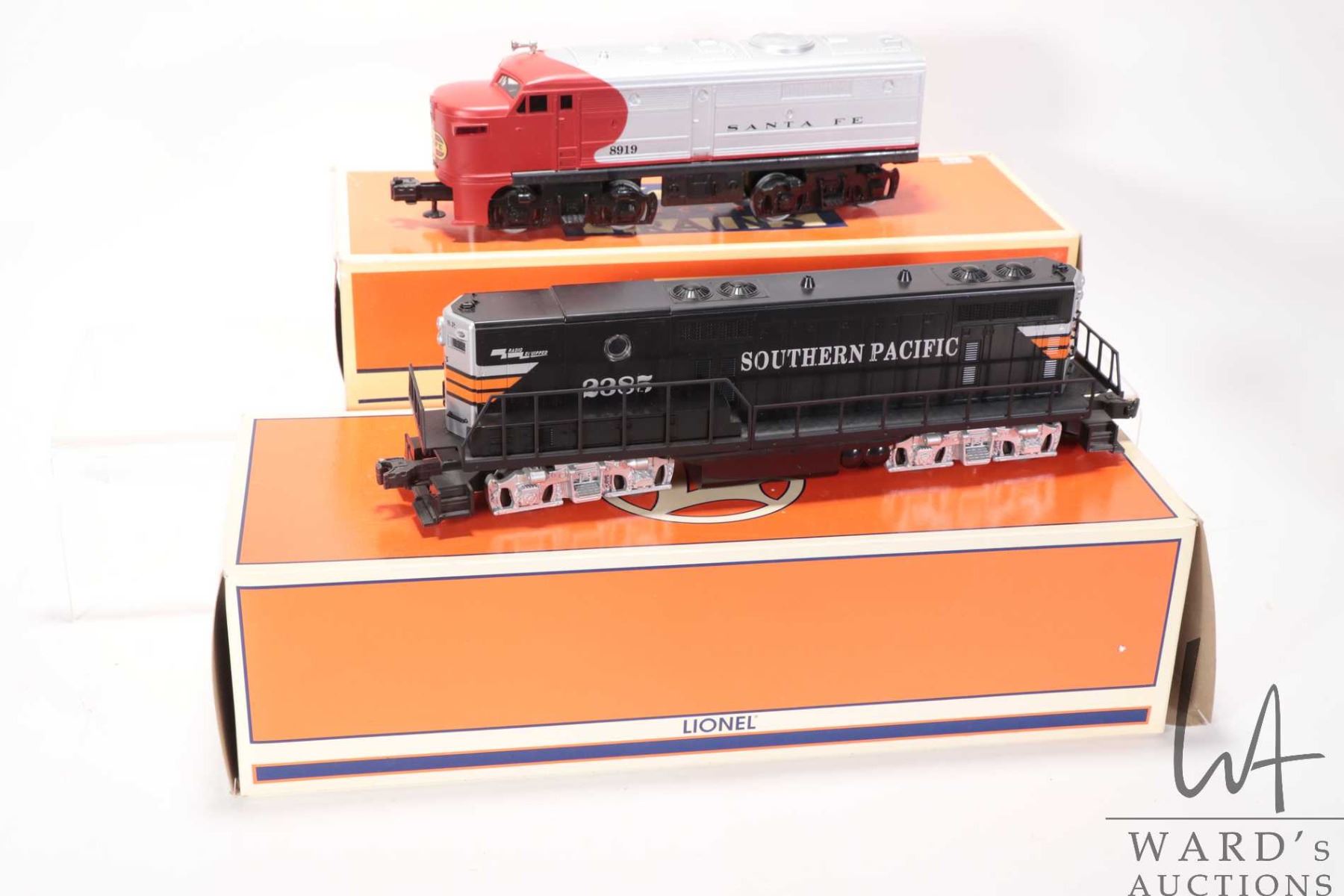 Two boxed Lionel O scale non- powered diesel locomotive including Sante Fe Alco A- Unit no. 6-18919 and Southern Pacific no. 6-18576, in gently used condition