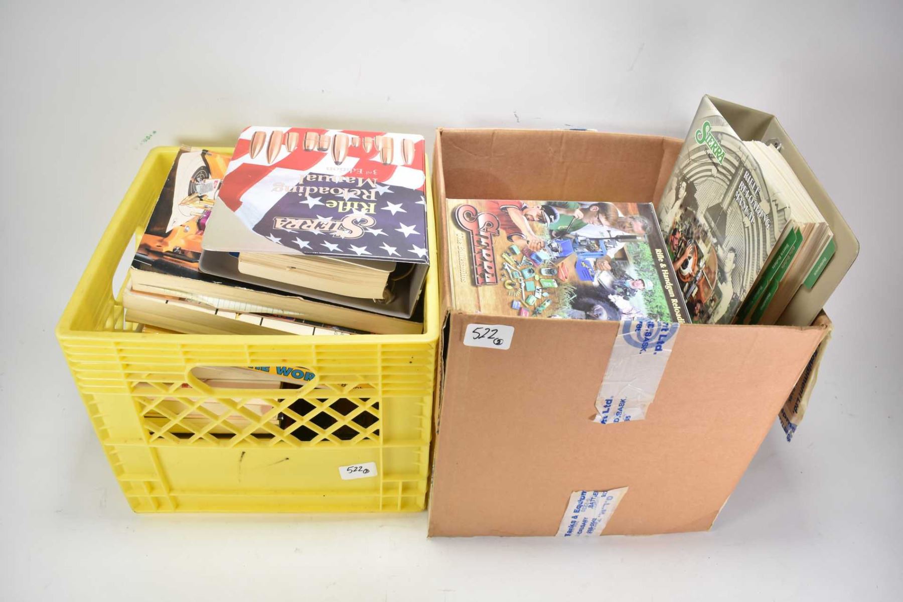 Two boxes of assorted firearms books including reloading, general reference etc.