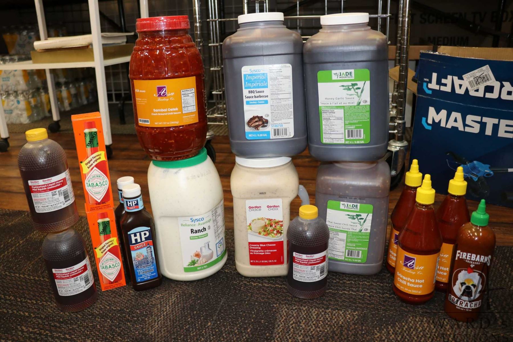Two boxes of food items including one 4L container of Jade Mountain honey garlic sauce, one 4L container of Jade Mountain Thai sweet chili sauce, one 3.78L container of Sysco ranch dressing, three 1KG containers of Gordons Choice liquid honey, two 142ml bottles of Tobasco sauce, two 400ml bottles of HP sauce, etc