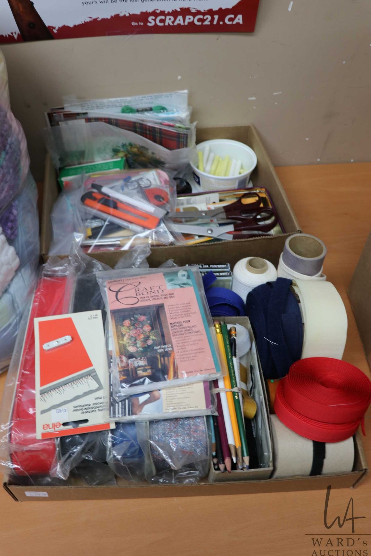 Two boxes of sewing supplies and petit point embroidery kits, plus Velcro, rolls of belting, sewing shears etc.
