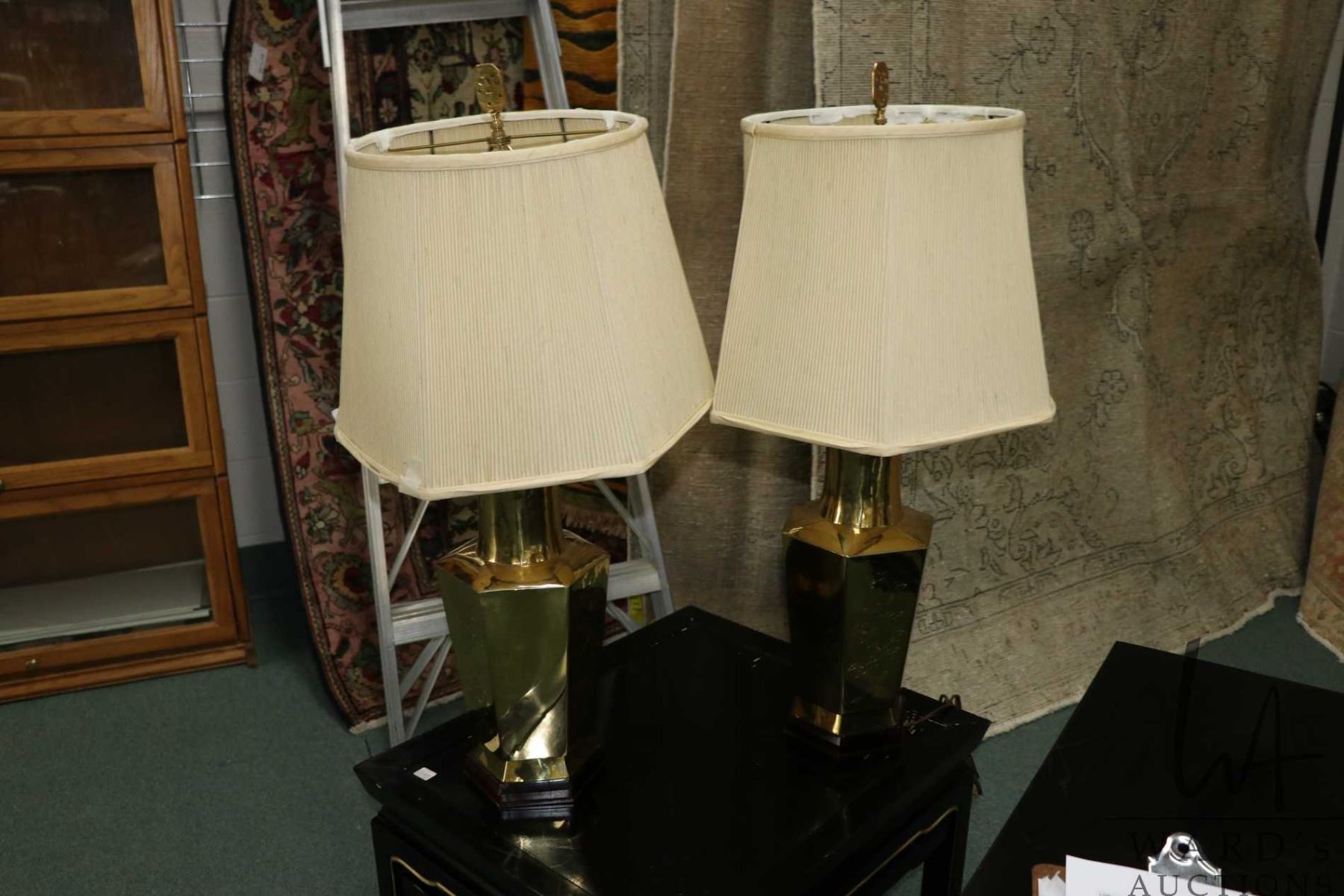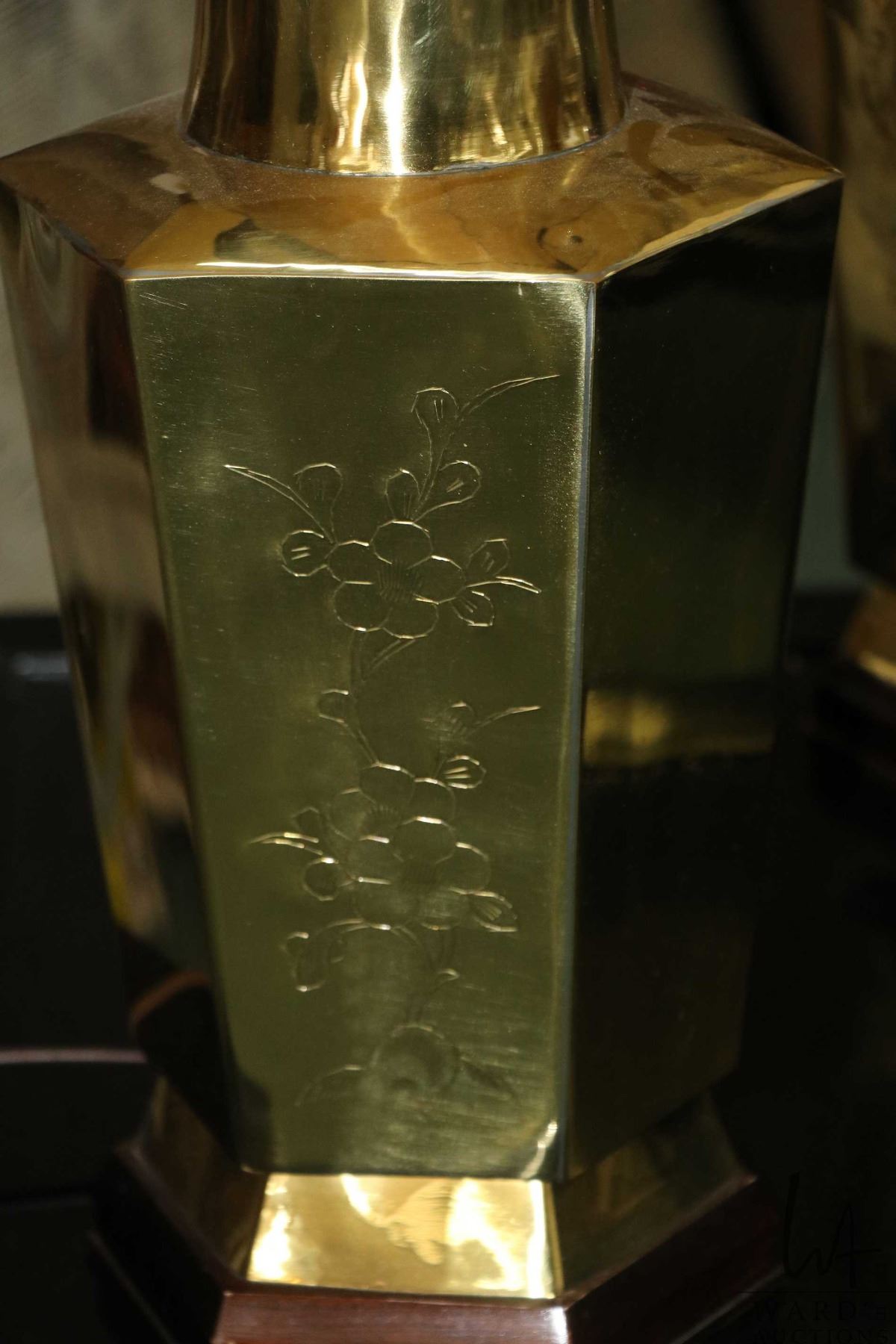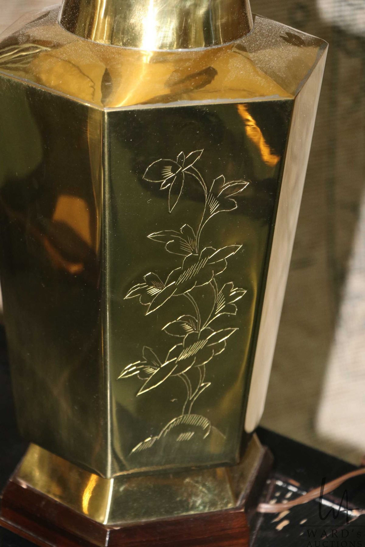 Two brass lamps with Oriental punch style floral decoration, each 33" in height