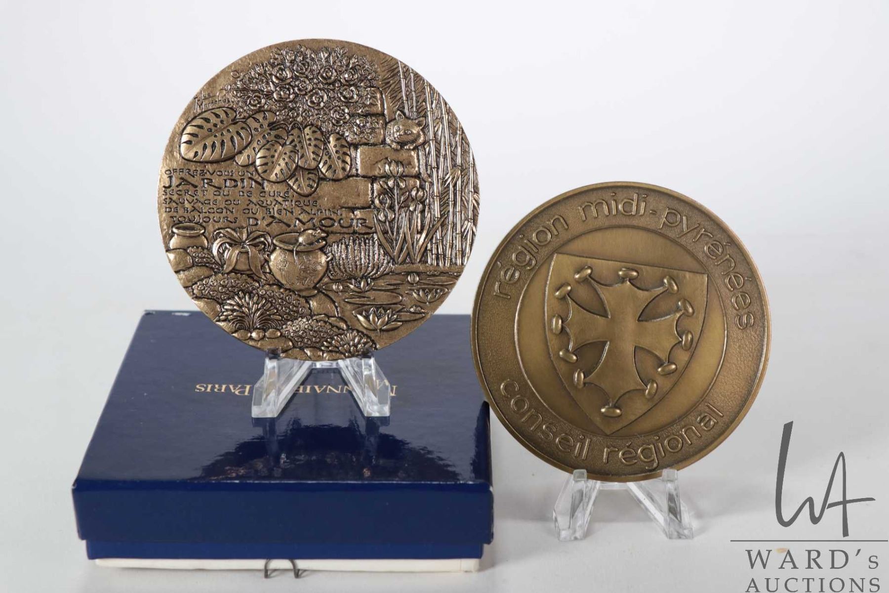 Two bronze medallions including French Regional Midi-Pyrenees and Offerez Vous Un Jardin Marichal medallion 3 1/4"