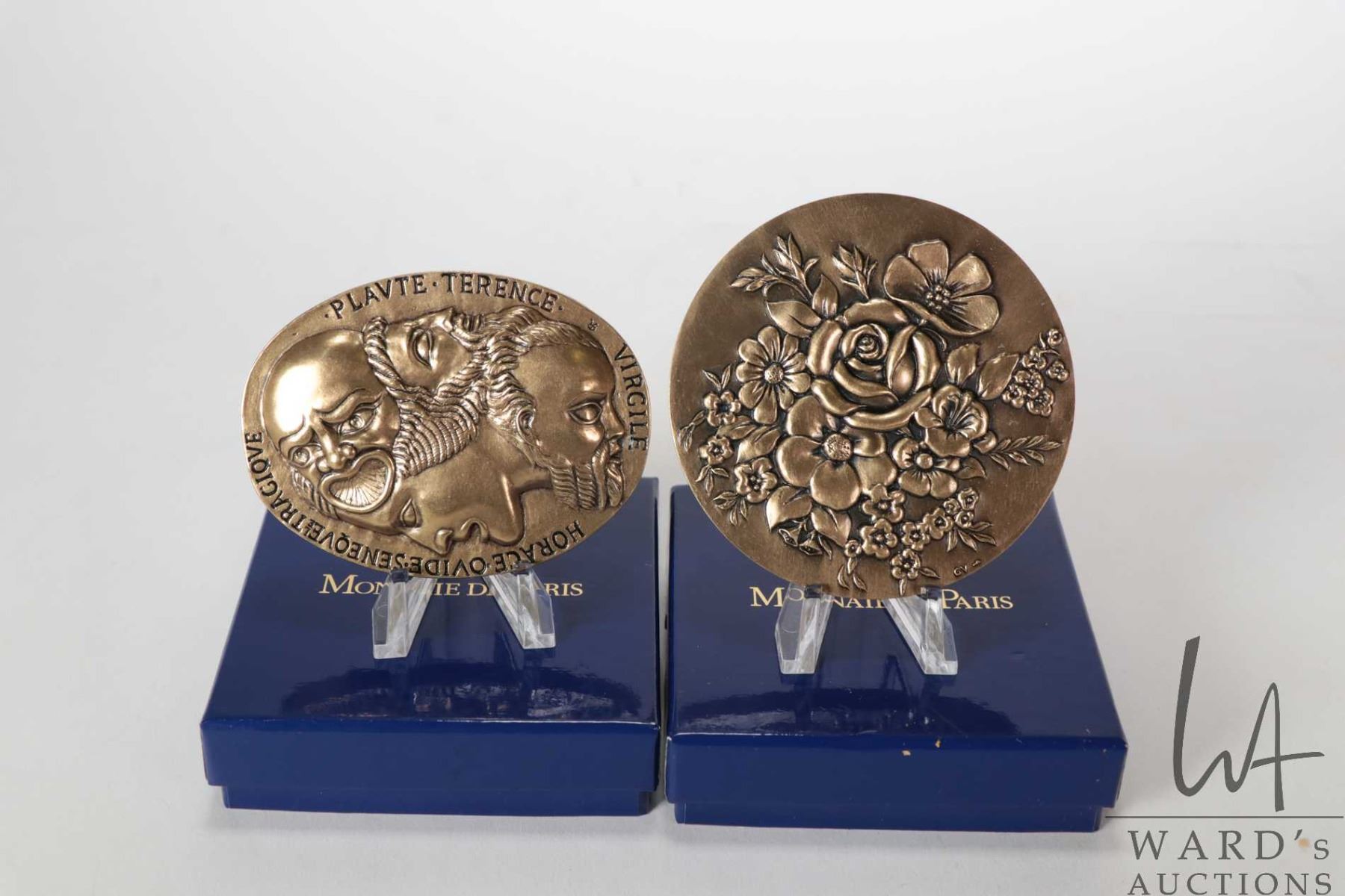 Two bronze medallions including Roman poetry and drama by Jean-Philippe Roch and Fleurs de Joie- Gregorio Varangega, 3 1/4"