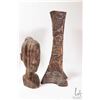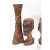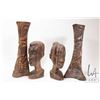 Two carved bones sculptures each 11" in height and a two carved wooden heads, each 7"