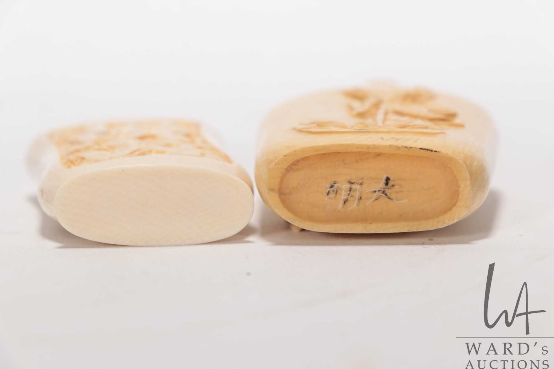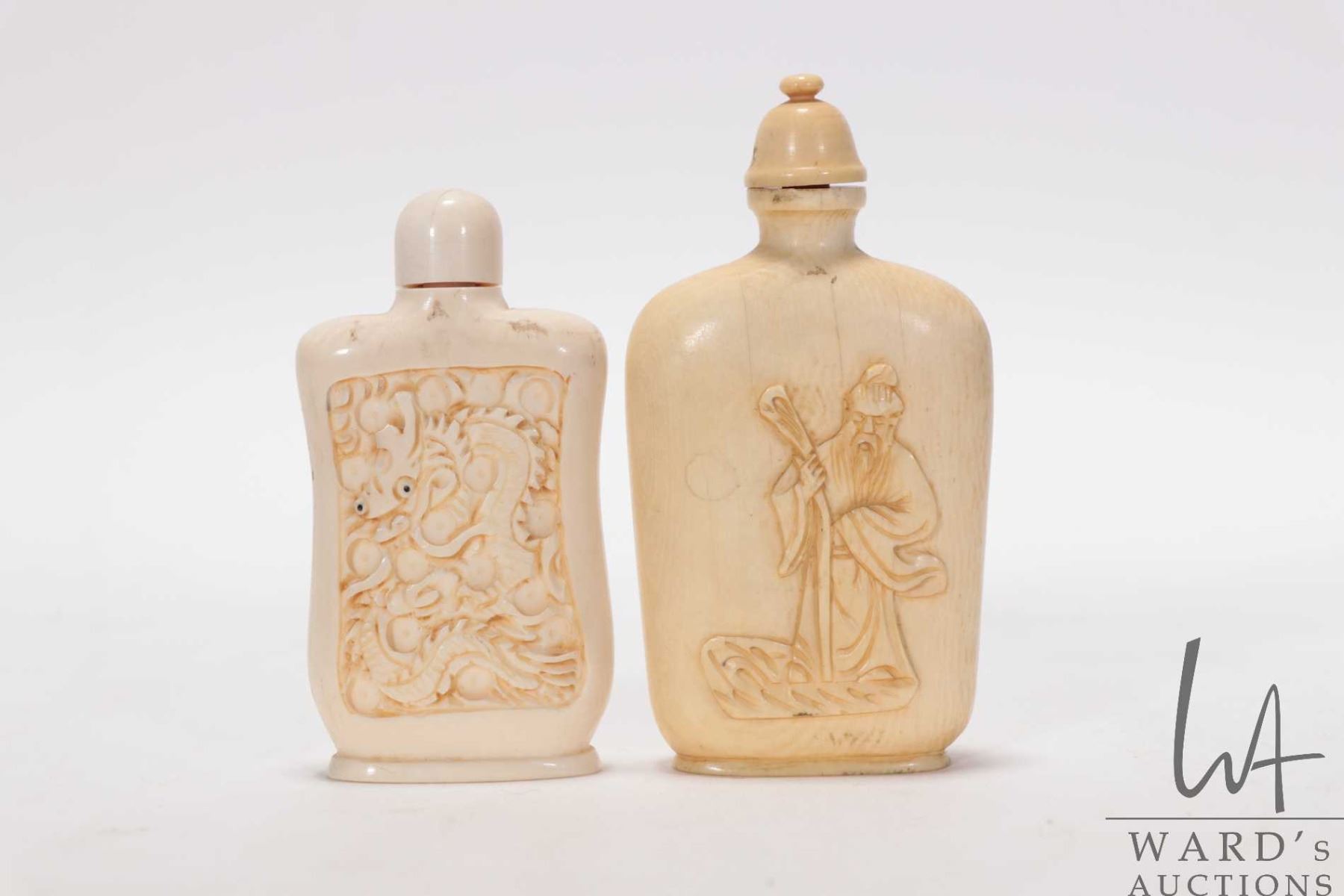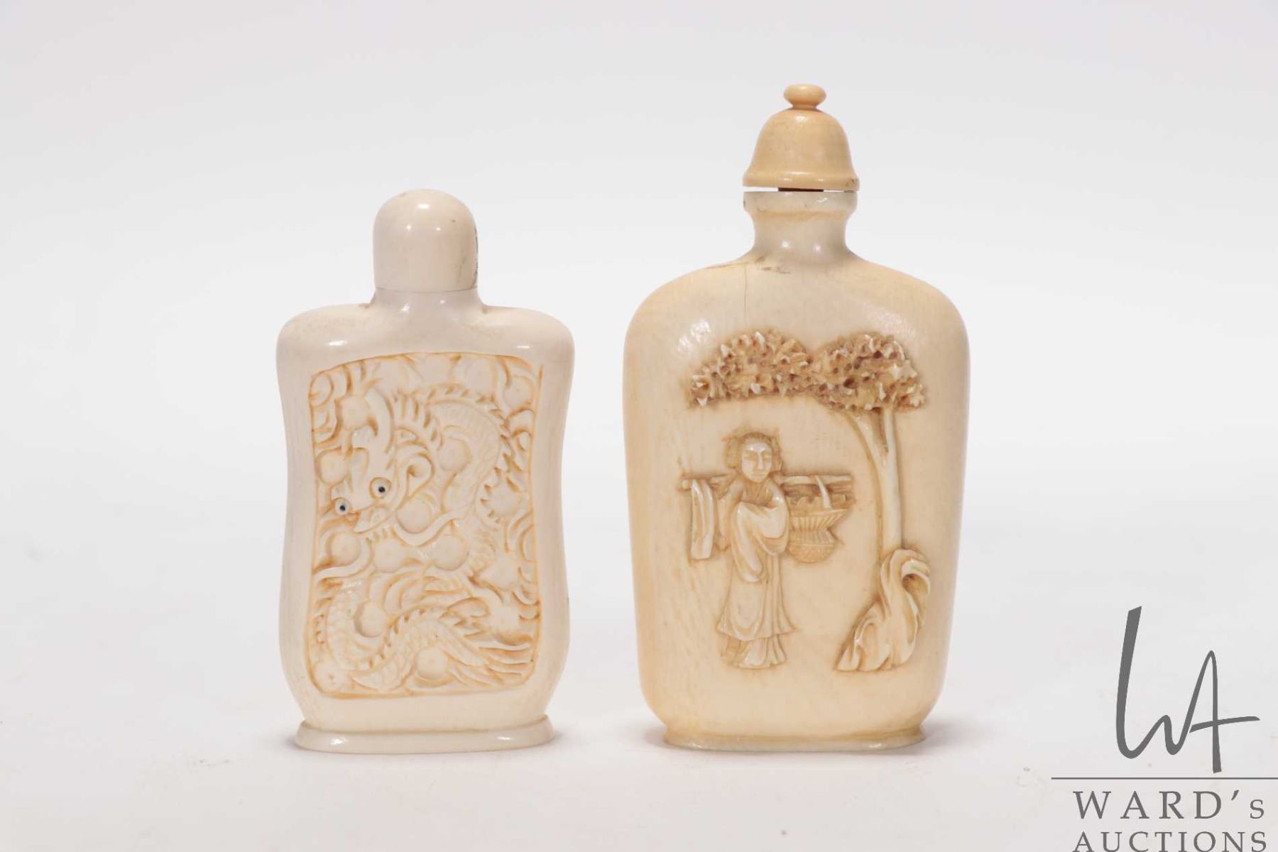 Two carved snuff bottles including a 2 3/4" carved ivory and a 3" carved bone